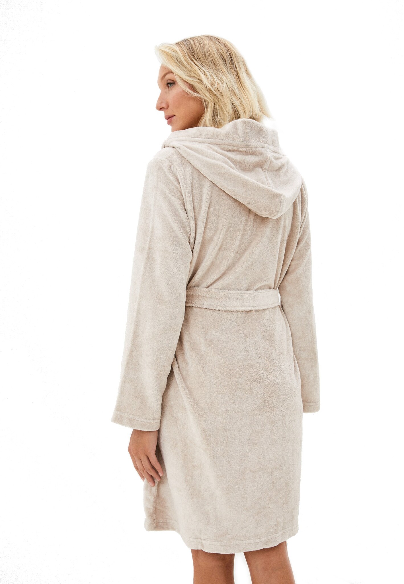 Комфортное кимоно прямого силуэта с капюшоном-воротником, запахом на поясе, длинными рукавами и вместительными накладными карманами идеально подойдет в качестве домашнего или банного халата. Модель представлена в нежно-розовом, бежевом и светло-голубом оттенках.
