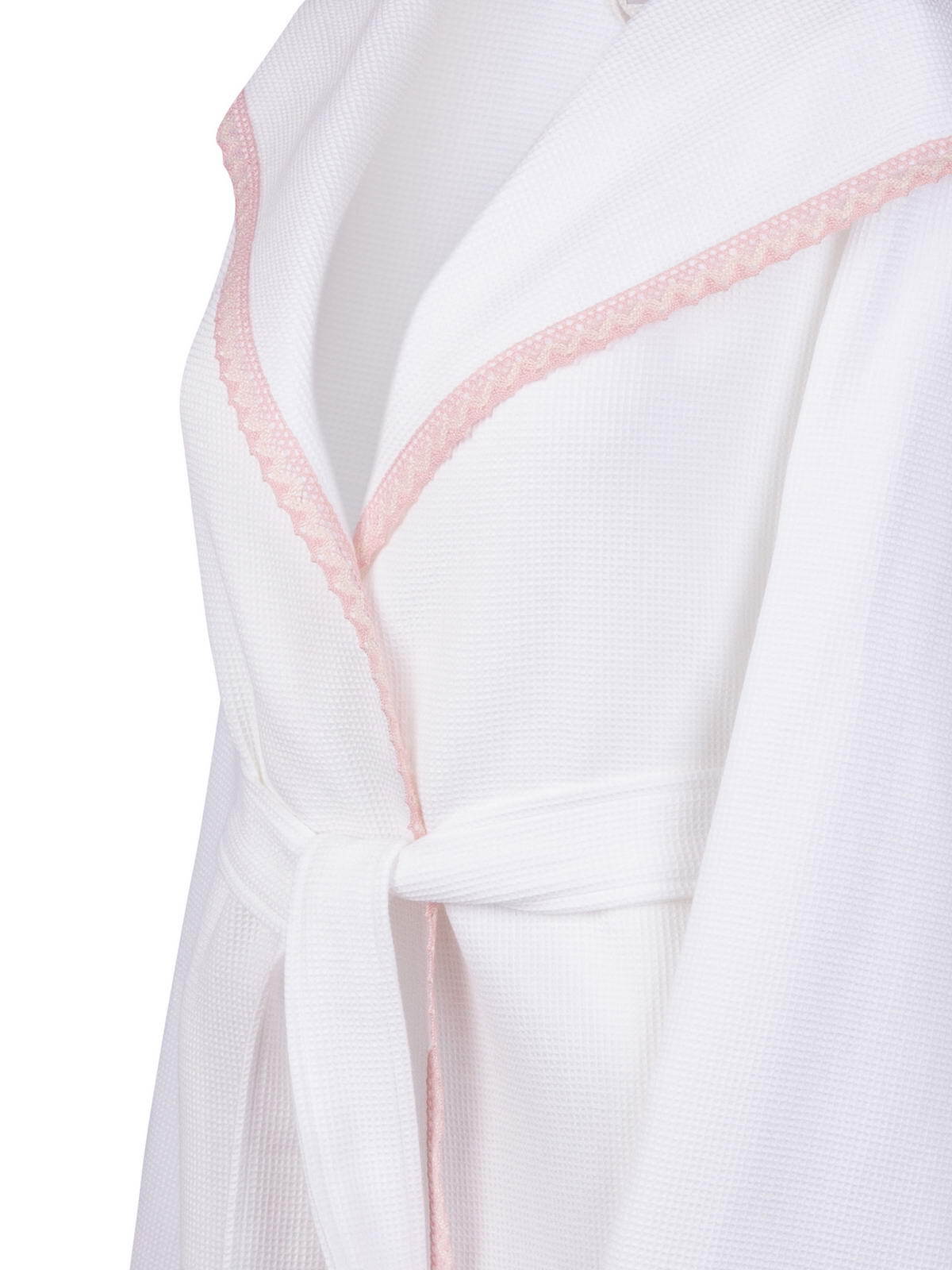 Современные дизайнеры предлагают нам тонкое и легкое кимоно прямого кроя средней длины на запах с поясом, широким капюшоном, переходящим в воротник, и длинными рукавами. Модель изящно декорирована по всей длине розовой полоской тонкого кружева. Халат представлен в белом, розовом и кремовом оттенках.
