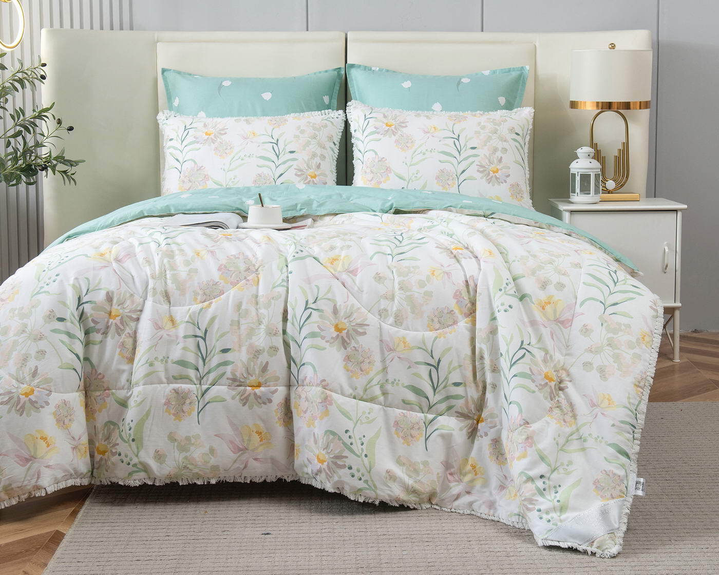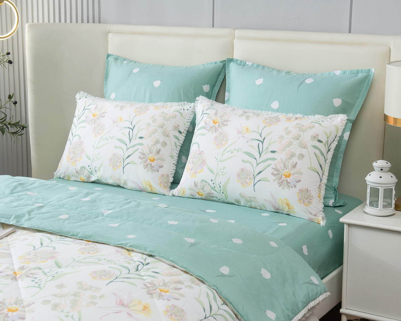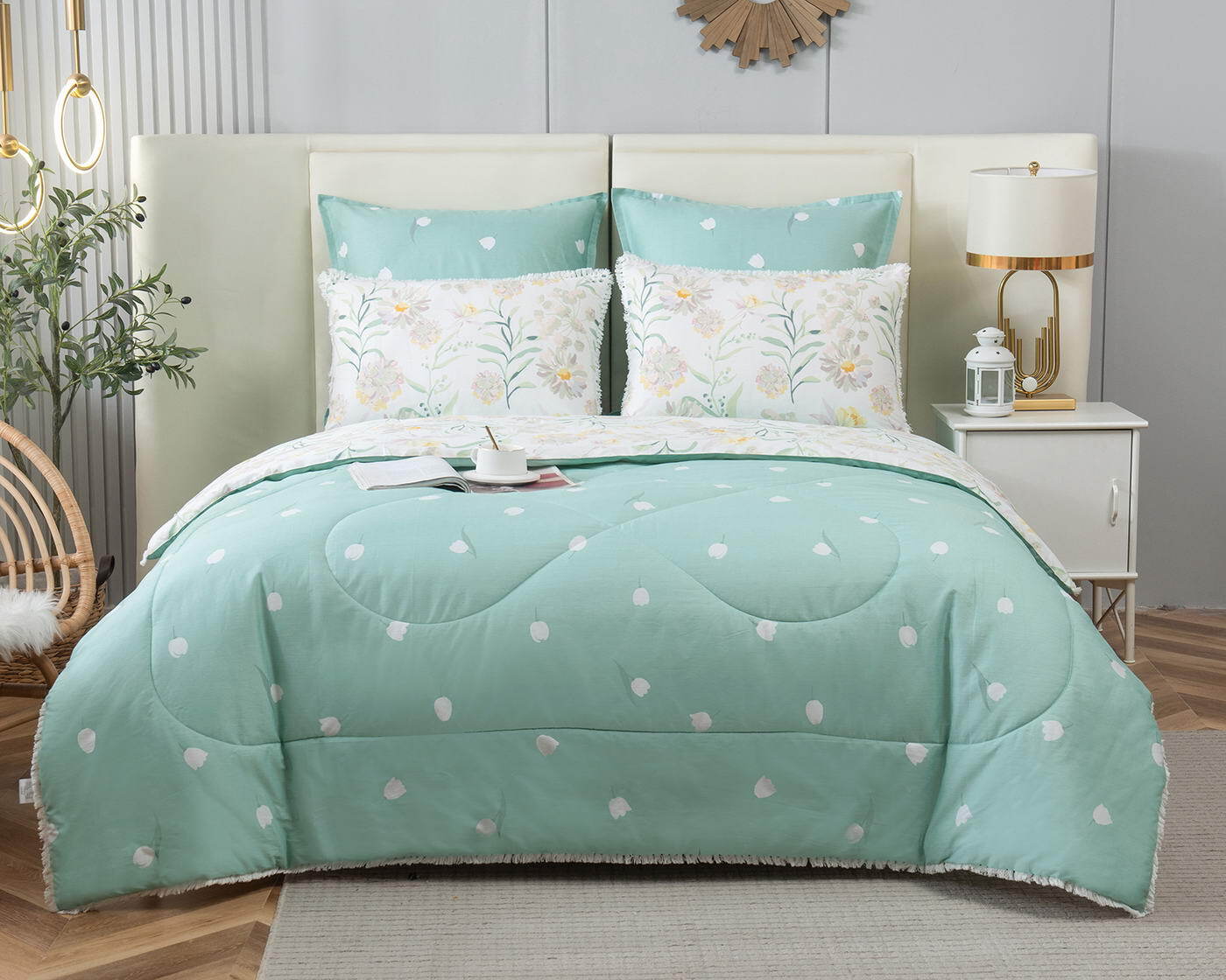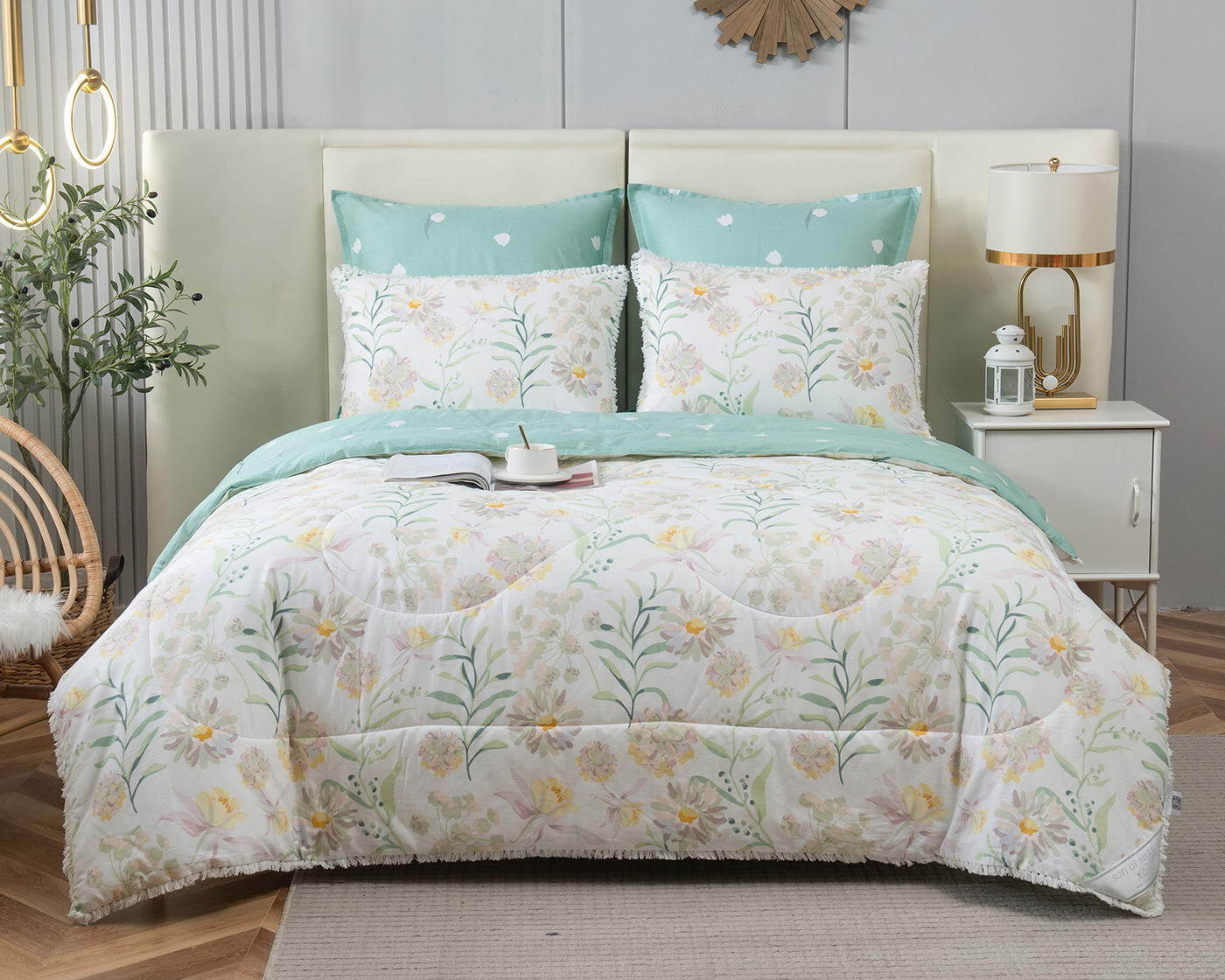 В комплекты комфортеров с одеялом Бернадетт входят наволочки, простыня и легкое всесезонное одеяло. Оцените это современное и очень удобное решение, которое идеально подходит тем, кто не любит возиться с пододеяльниками. Само одеяло тонкое и легкое, но под ним вам не будет холодно зимой или жарко летом. Такое одеяло можно использовать в любое время года, хлопок гарантирует качественный сон, т.к. натуральная ткань не вызывает аллергии, хорошо впитывает влагу и позволяет коже дышать. Прочная и красивая ткань сатин, из которого выполнен комплект, мягкая и гладкая на ощупь, при этом вещи не теряют форму. Набор с одеялом прослужит вам достаточно долго без потери своего качества, а рисунок не потускнеет даже после стирок. Комплект легко стирается в обычной машине и также легко гладится. В нашем магазине представлены комплекты в разных тонах и с различными рисунками на выбор. Наборы упакованы в красивые подарочные коробки и могут послужить отличным решением для подарка.