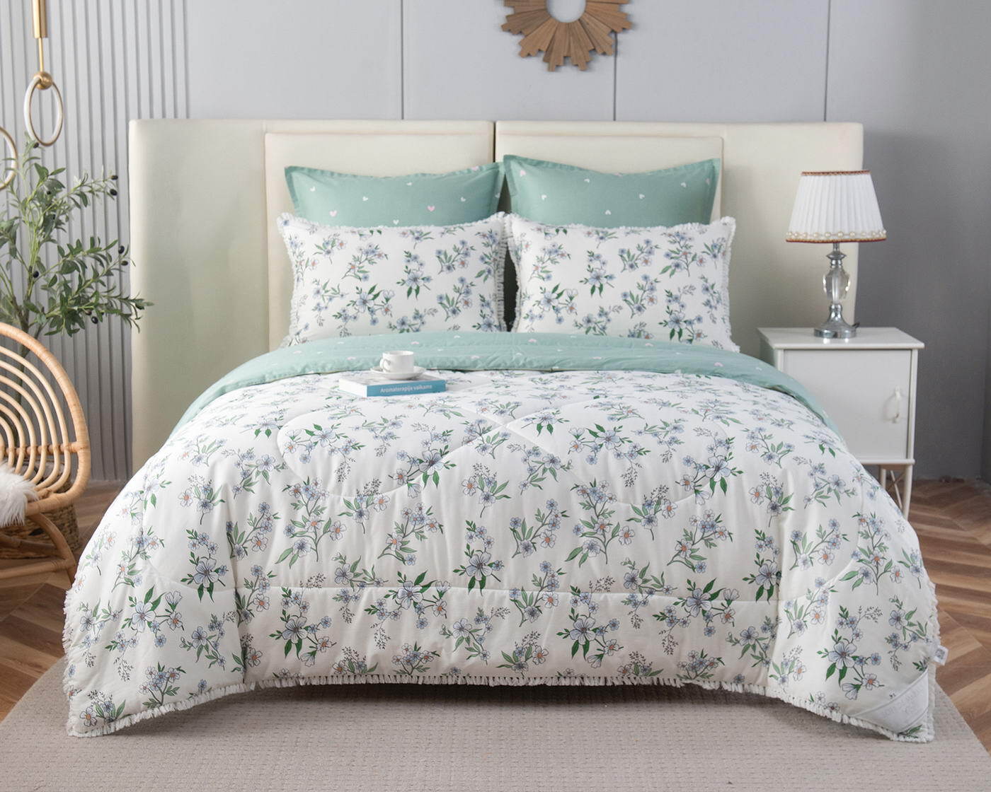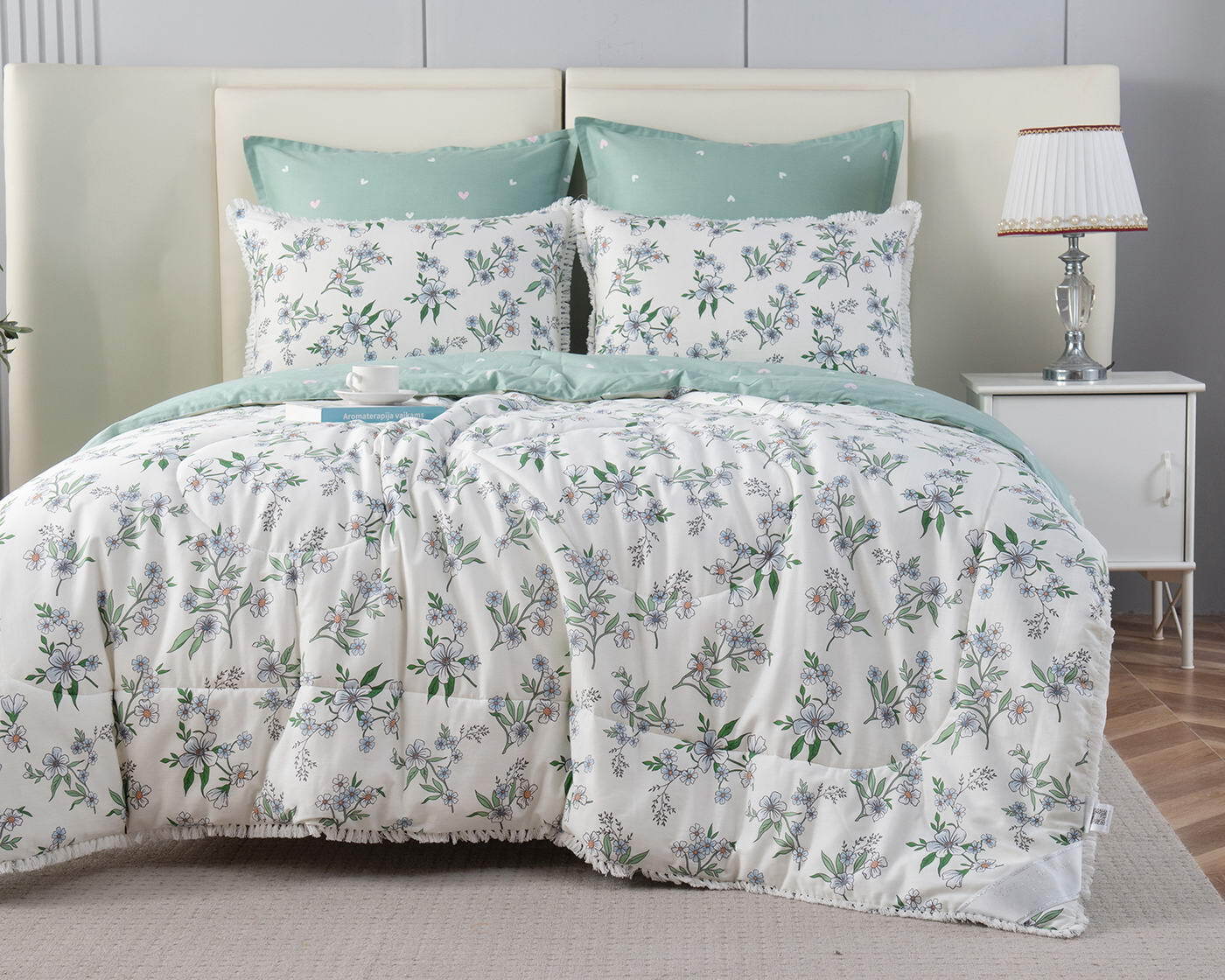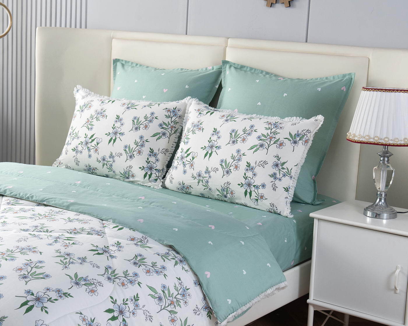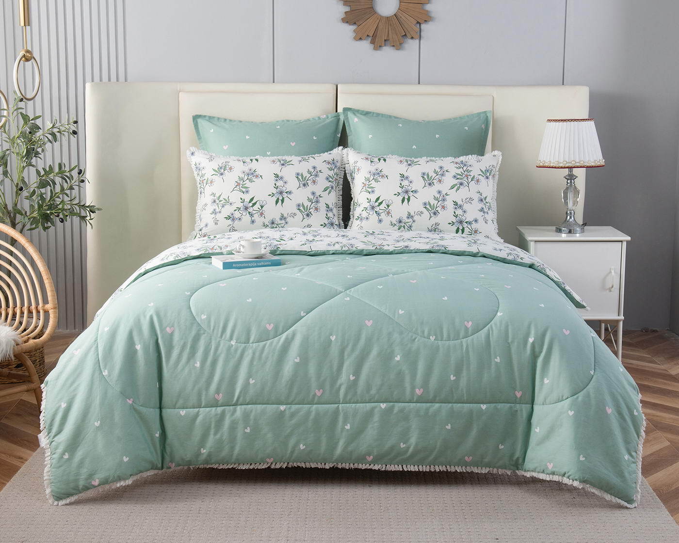 В комплекты комфортеров с одеялом Бернадетт входят наволочки, простыня и легкое всесезонное одеяло. Оцените это современное и очень удобное решение, которое идеально подходит тем, кто не любит возиться с пододеяльниками. Само одеяло тонкое и легкое, но под ним вам не будет холодно зимой или жарко летом. Такое одеяло можно использовать в любое время года, 100% хлопок гарантирует качественный сон, т.к. натуральная ткань не вызывает аллергии, хорошо впитывает влагу и позволяет коже дышать. Прочная и красивая ткань сатин, из которого выполнен комплект, мягкая и гладкая на ощупь, при этом вещи не теряют форму. Набор с одеялом прослужит вам достаточно долго без потери своего качества, а рисунок не потускнеет даже после стирок. Комплект легко стирается в обычной машине и также легко гладится. В нашем магазине представлены комплекты в разных тонах и с различными рисунками на выбор. Наборы упакованы в красивые подарочные коробки и могут послужить отличным решением для подарка.