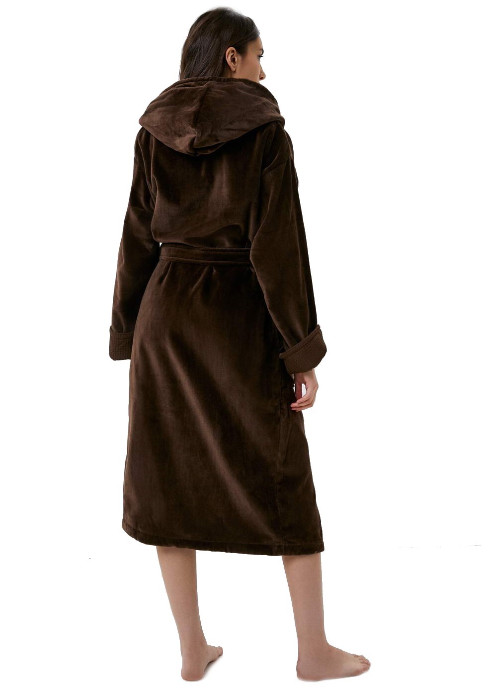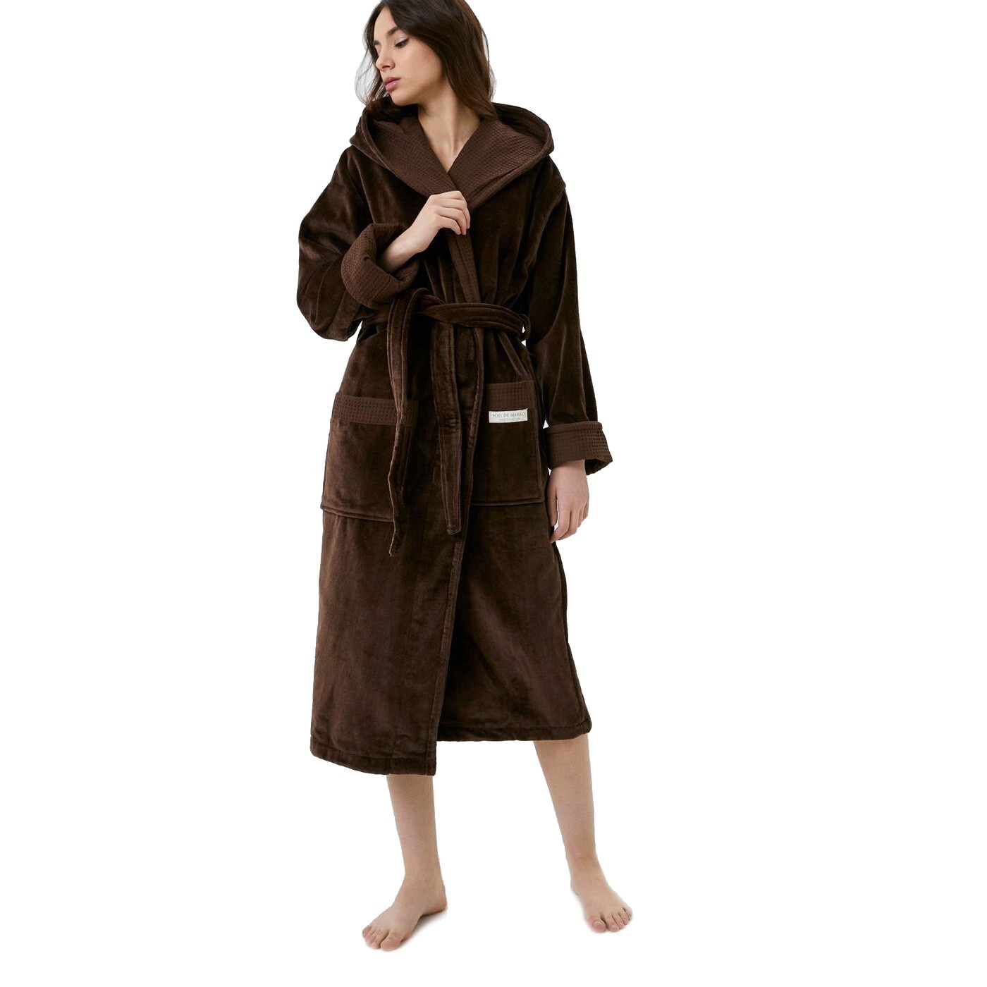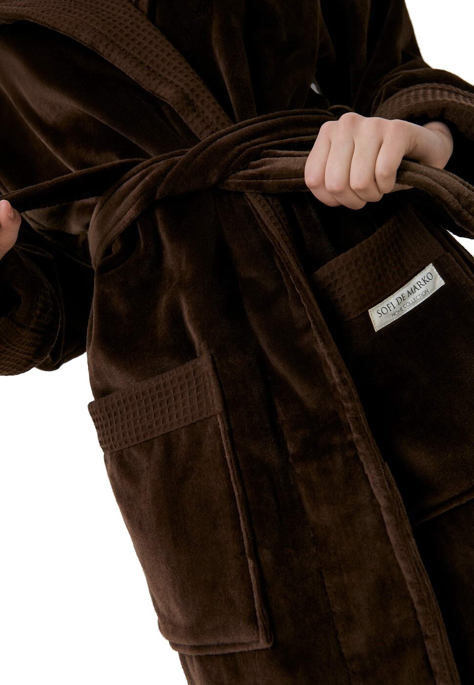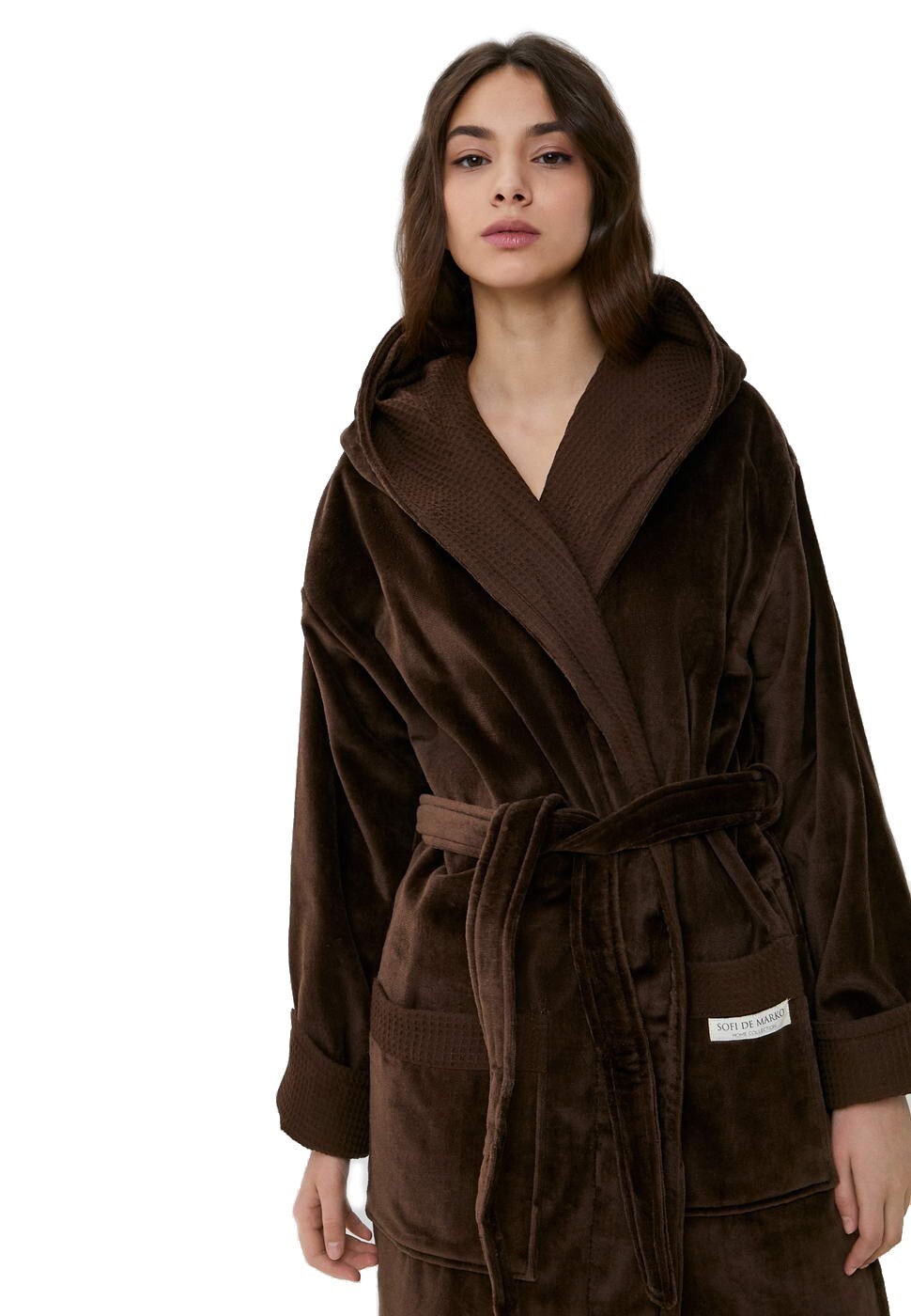 Халат Аделия представлен в нескольких цветах: белый, пудра, лиловый, кофе, беж. Эти оттенки успокаивают нервную систему и помогут расслабиться. Халат запахивается на пояс, также есть капюшон и два накладных кармана по бокам изделия логотипом Sofi De Marko.