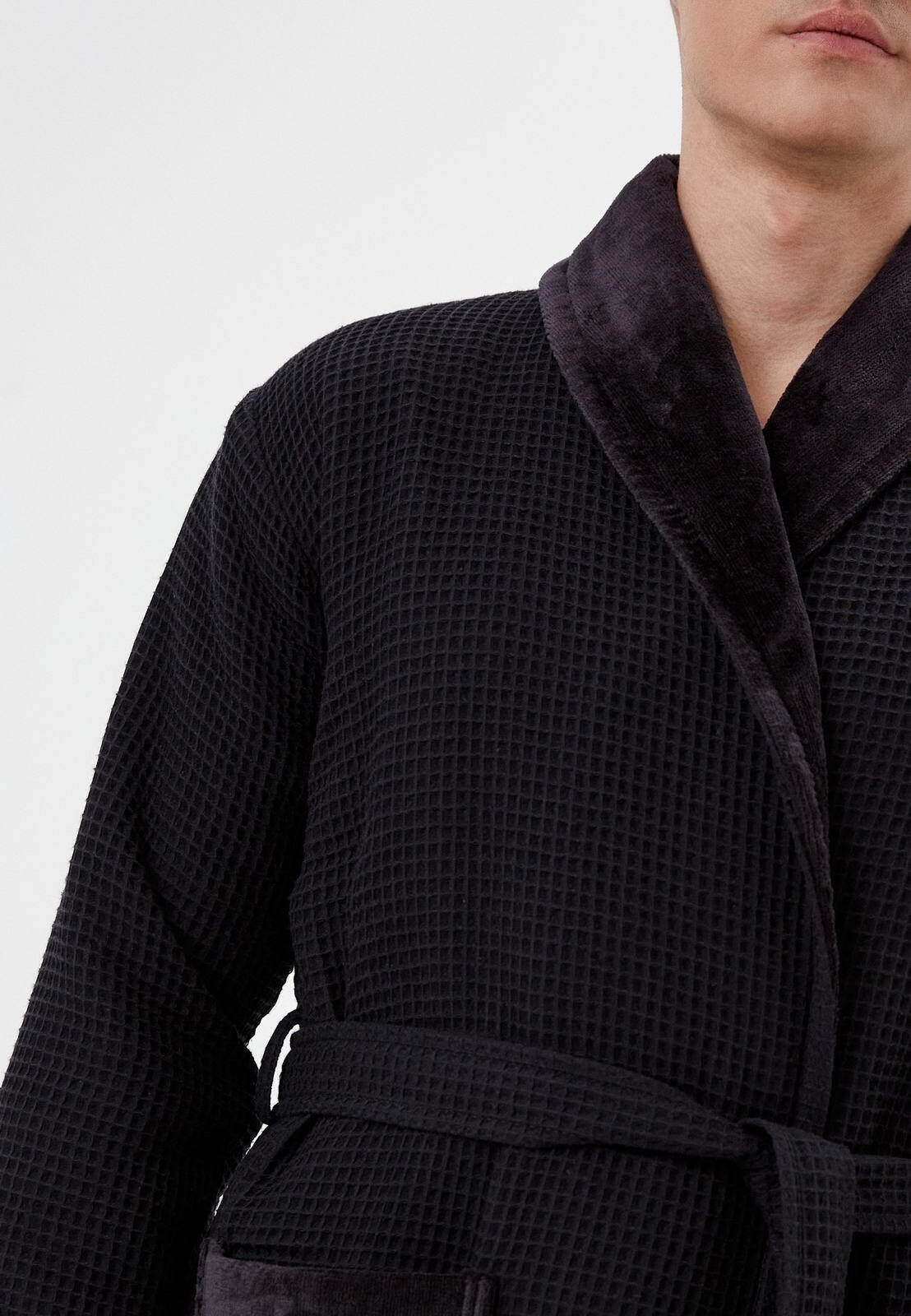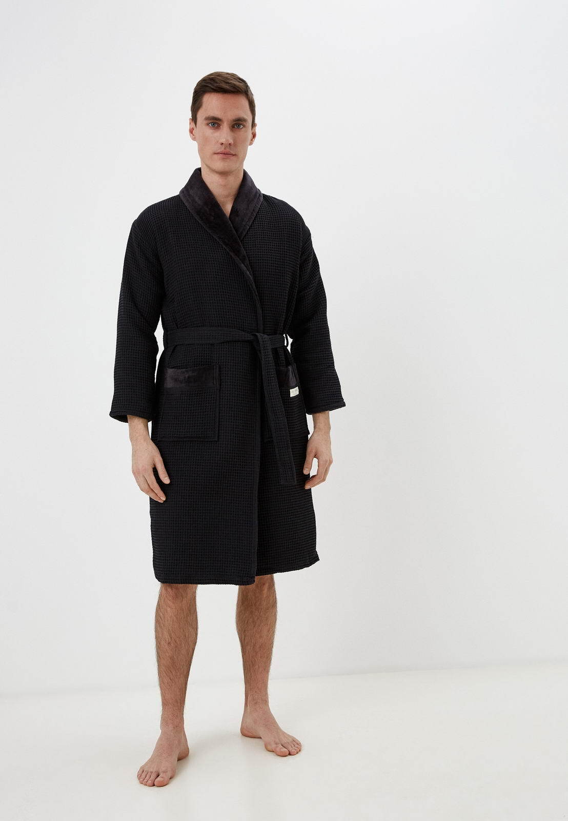 Модель Михаэль выполнена из плотной ткани. Халат двусторонний: сверху вафельная ткань, внутри мягкое махровое полотно. Утепленный халат Михаэль имеет английский ворот, два накладных кармана по бокам изделия с логотипом Sofi De Marko. Халат без застежек, запахивается на пояс.
