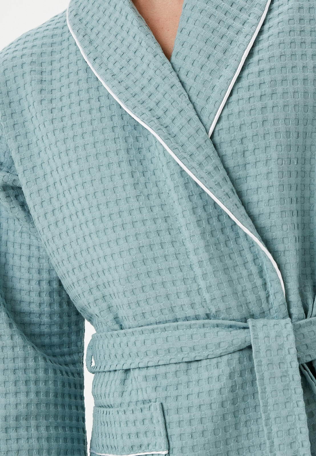 Халат Герман имеет контрастный кант по воротнику и на манжетах, запахивается на пояс, имеет накладные карманы.
