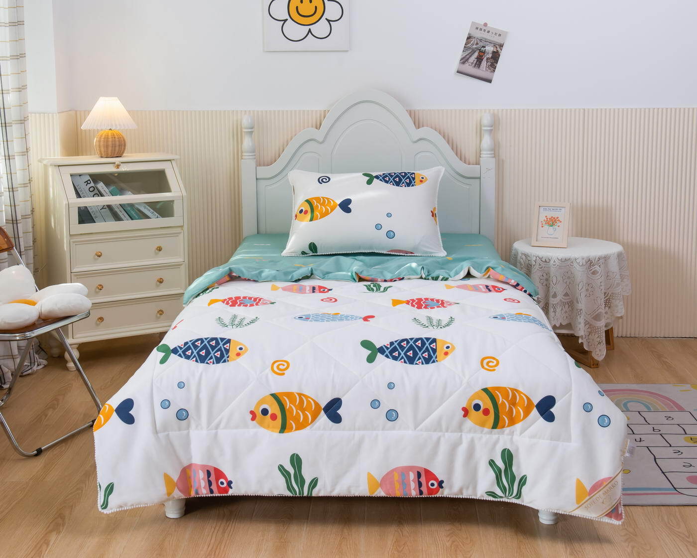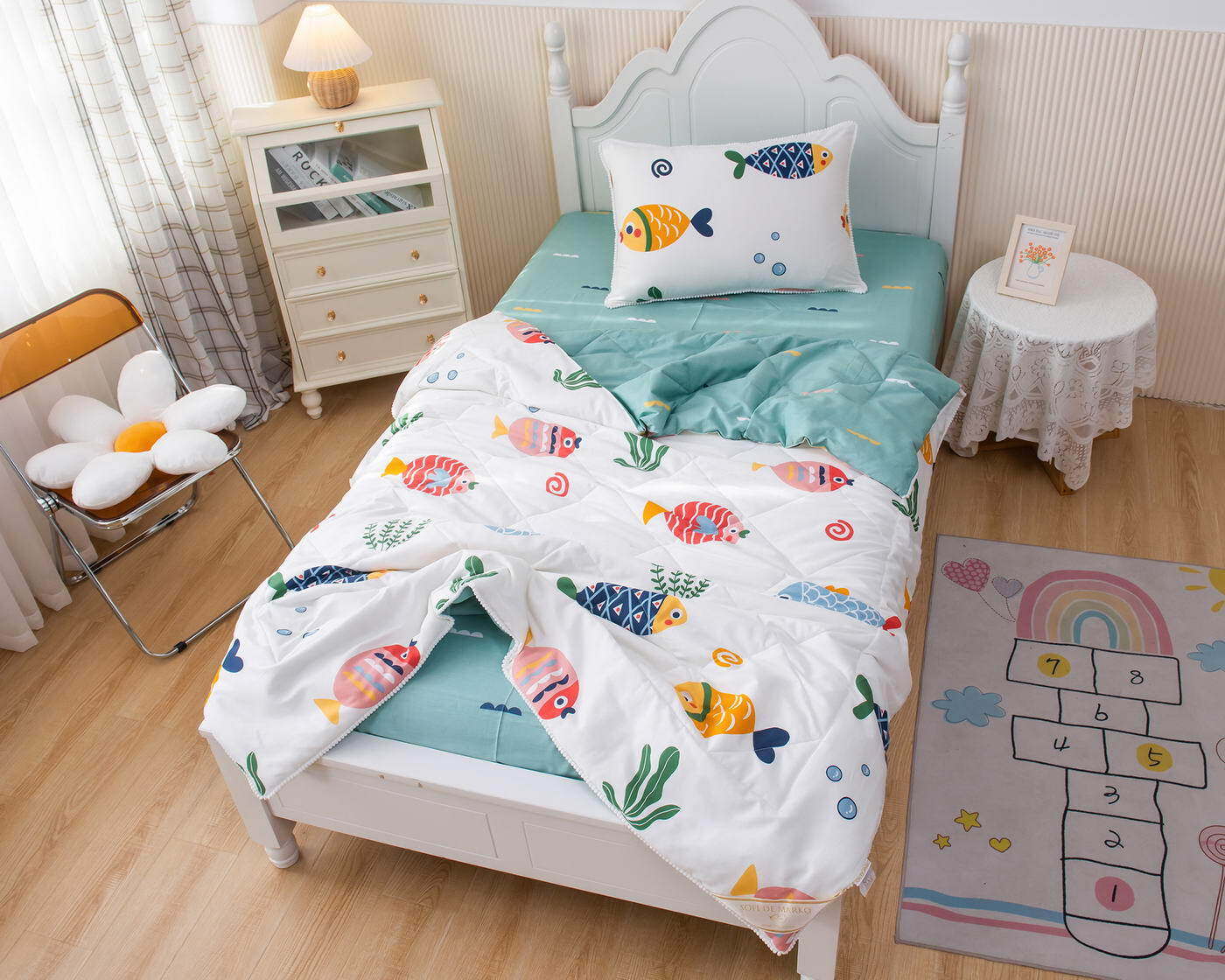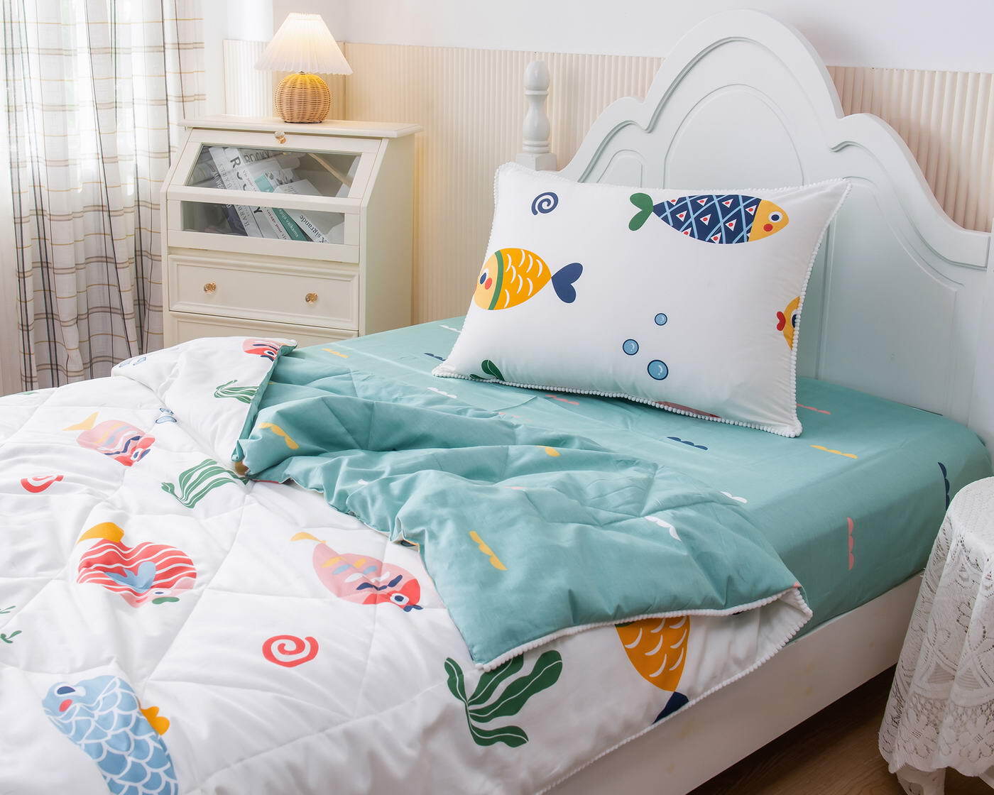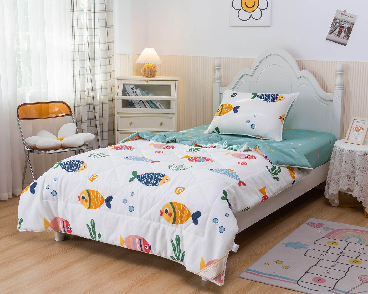 Само одеяло тонкое и легкое, но под ним ребенку не будет холодно зимой или жарко летом. Такое одеяло можно использовать в любое время года, 100% хлопок гарантирует качественный сон, т.к. натуральная ткань хорошо впитывает влагу и позволяет коже дышать. Натуральные материалы не вызывают аллергии. Огромная палитра оттенков и яркие дизайны комплектов понравятся детям и подросткам.