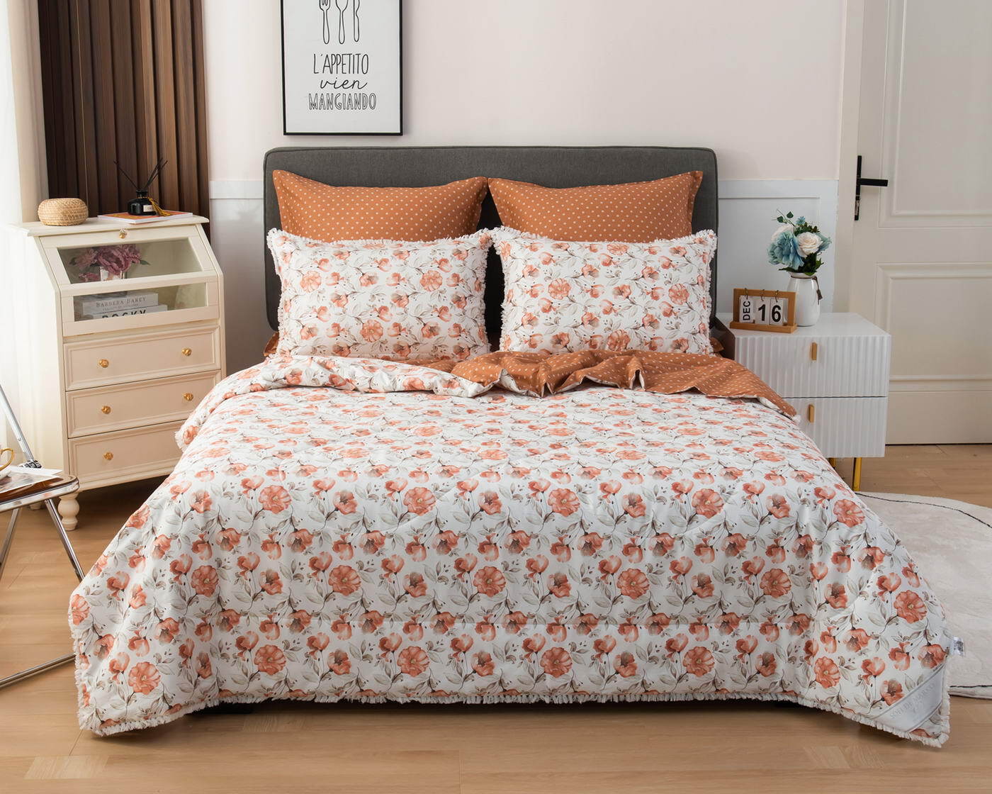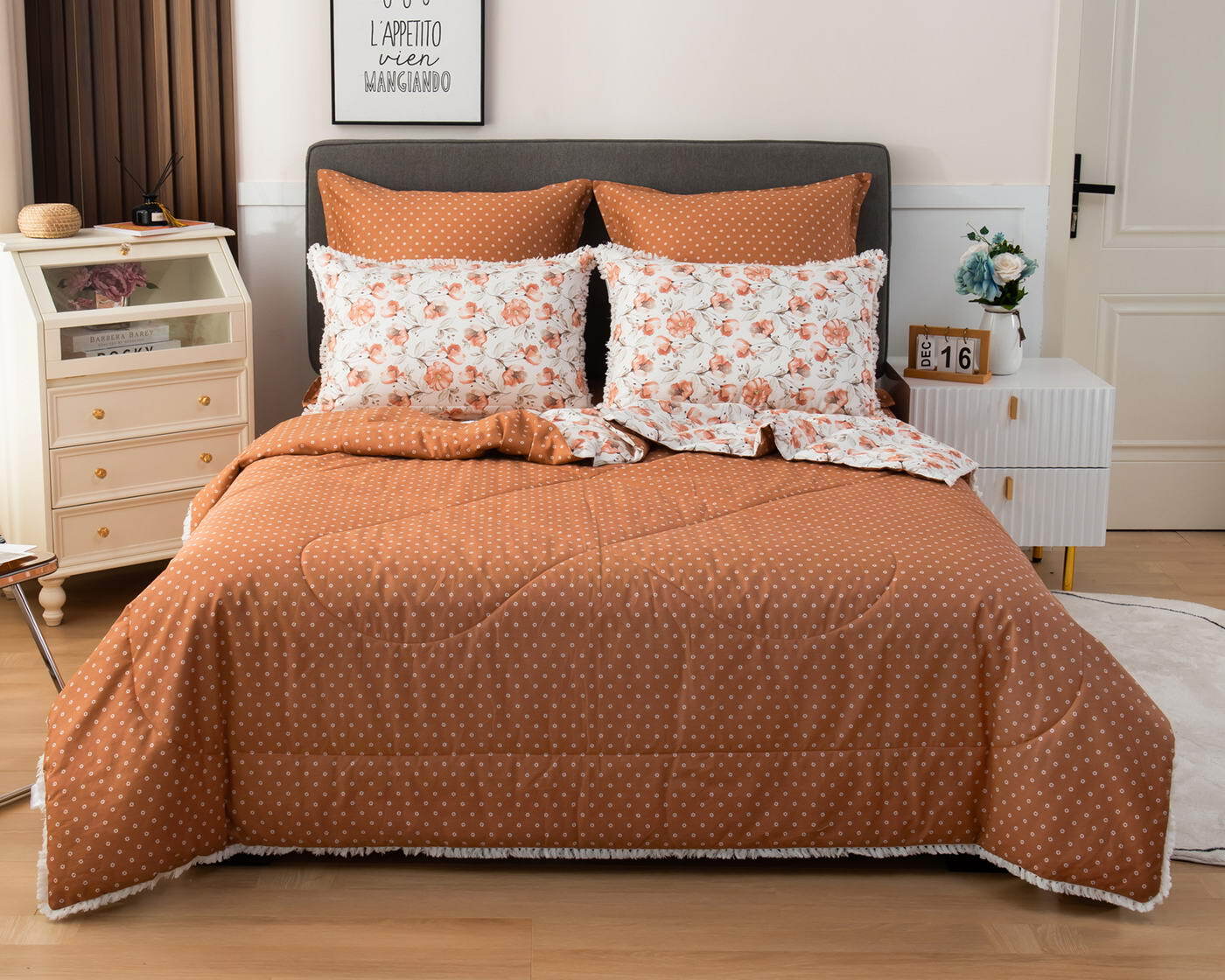 В комплекты комфортеров с одеялом Бернадетт входят наволочки, простыня и легкое всесезонное одеяло. Оцените это современное и очень удобное решение, которое идеально подходит тем, кто не любит возиться с пододеяльниками. Само одеяло тонкое и легкое, но под ним вам не будет холодно зимой или жарко летом. Такое одеяло можно использовать в любое время года, 100% хлопок гарантирует качественный сон, т.к. натуральная ткань не вызывает аллергии, хорошо впитывает влагу и позволяет коже дышать. Прочная и красивая ткань сатин, из которого выполнен комплект, мягкая и гладкая на ощупь, при этом вещи не теряют форму. Набор с одеялом прослужит вам достаточно долго без потери своего качества, а рисунок не потускнеет даже после стирок. Комплект легко стирается в обычной машине и также легко гладится. В нашем магазине представлены комплекты в разных тонах и с различными рисунками на выбор. Наборы упакованы в красивые подарочные коробки и могут послужить отличным решением для подарка.