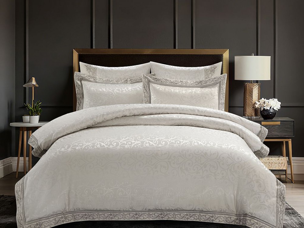 Очень эффектный комплект: тонкие завитки причудливо переплетаются между собой, образуя сплошной ажурный узор. Волокна сотканы таким образом, что возникает ощущение, будто рисунок подсвечен изнутри. Этот комплект можно назвать хамелеоном за уникальную способность менять цвет в зависимости от освещения: он может быть и серебристо-серым и жемчужно-бежевым. Вас несомненно порадует богатая вышивка на двойных ушках наволочек и пододеяльника, как всегда шикарное изголовье у простыни, а так же приятное дополнение в виде наволочки для валика.