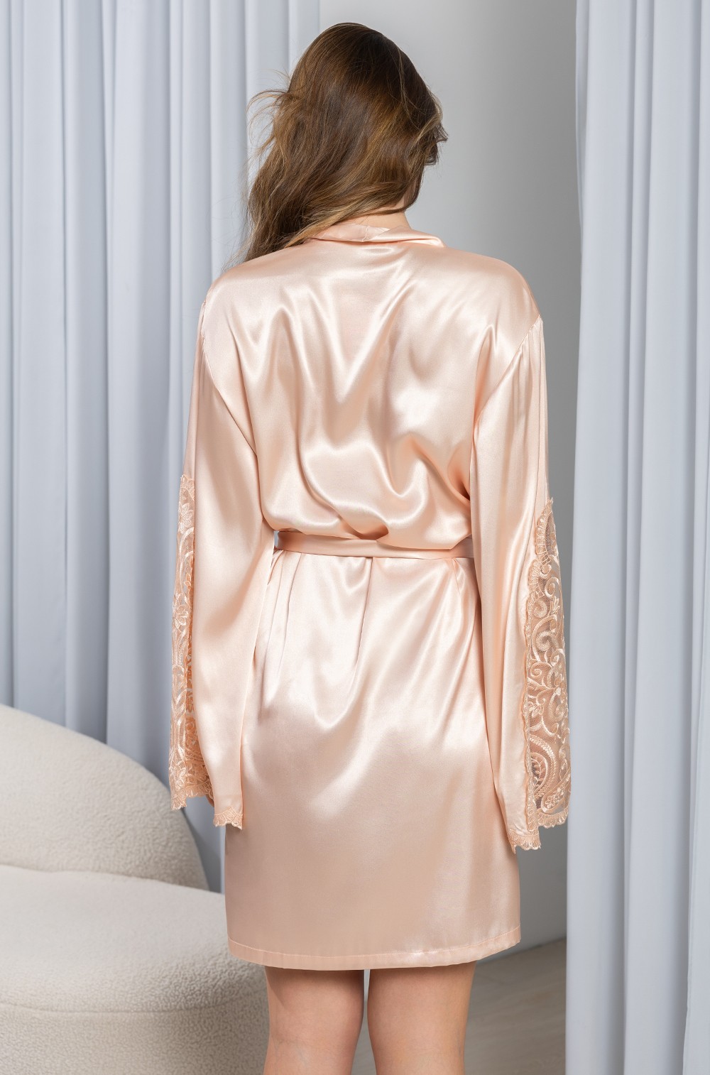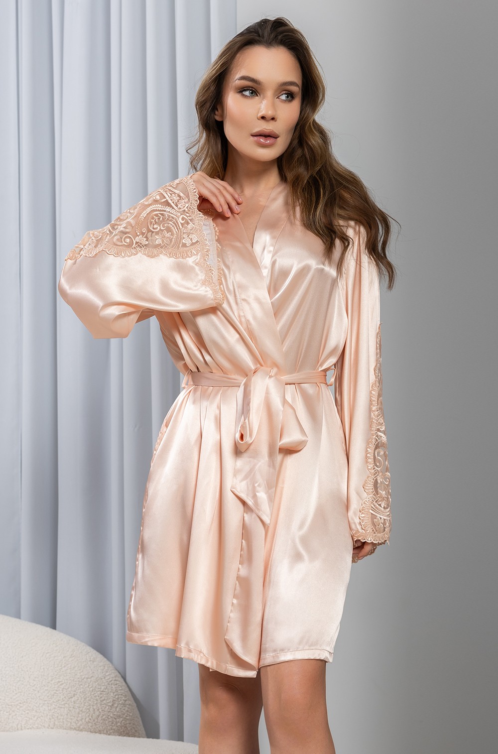 Короткий запашной халат Mia-Amore из принтованного шелка с длинными широкими рукавами - истинное воплощение роскоши. Рукава украшены элегантной вышитой кружевной вставкой, а низ оформлен узким кружевом. Комплектуется удобным поясным ремнем, также имеются практичные кармашки в боковых швах. Состав ткани включает 70% шелка, 25% полиэстера и 5% эластана.