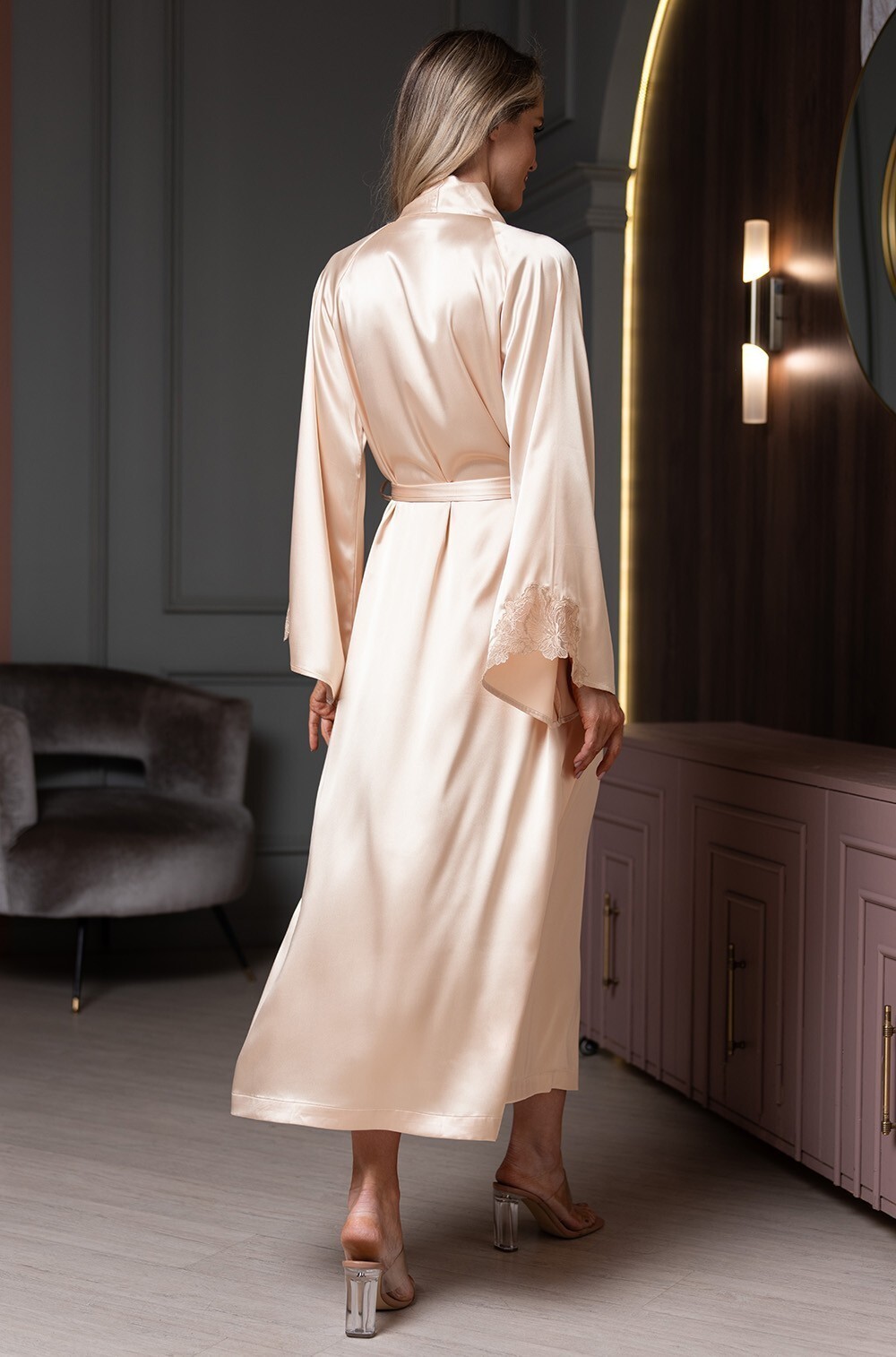 Длинный запашной халат Mia-Amore с длинными рукавами реглан выполнен из однотонного смесового шёлка. По низу рукава украшены ажурными вставками из вышитого кружева. В боковых швах есть карманы. Халат запахивается с помощью широкого съёмного пояса.