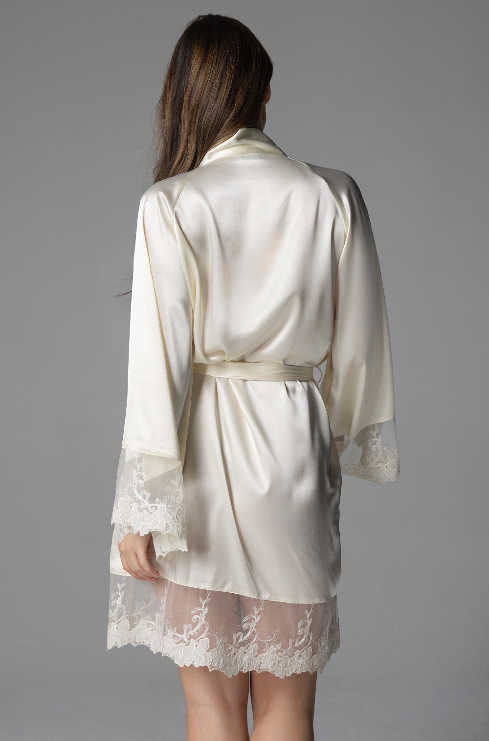 Роскошный короткий запашной халат Mia-Amore с длинными широкими рукавами выполнен из однотонного смесового шёлка. Рукава и низ халата декорированы вставками из вышивного кружева. Халат комплектуется широким поясом, в боковых швах карманы.