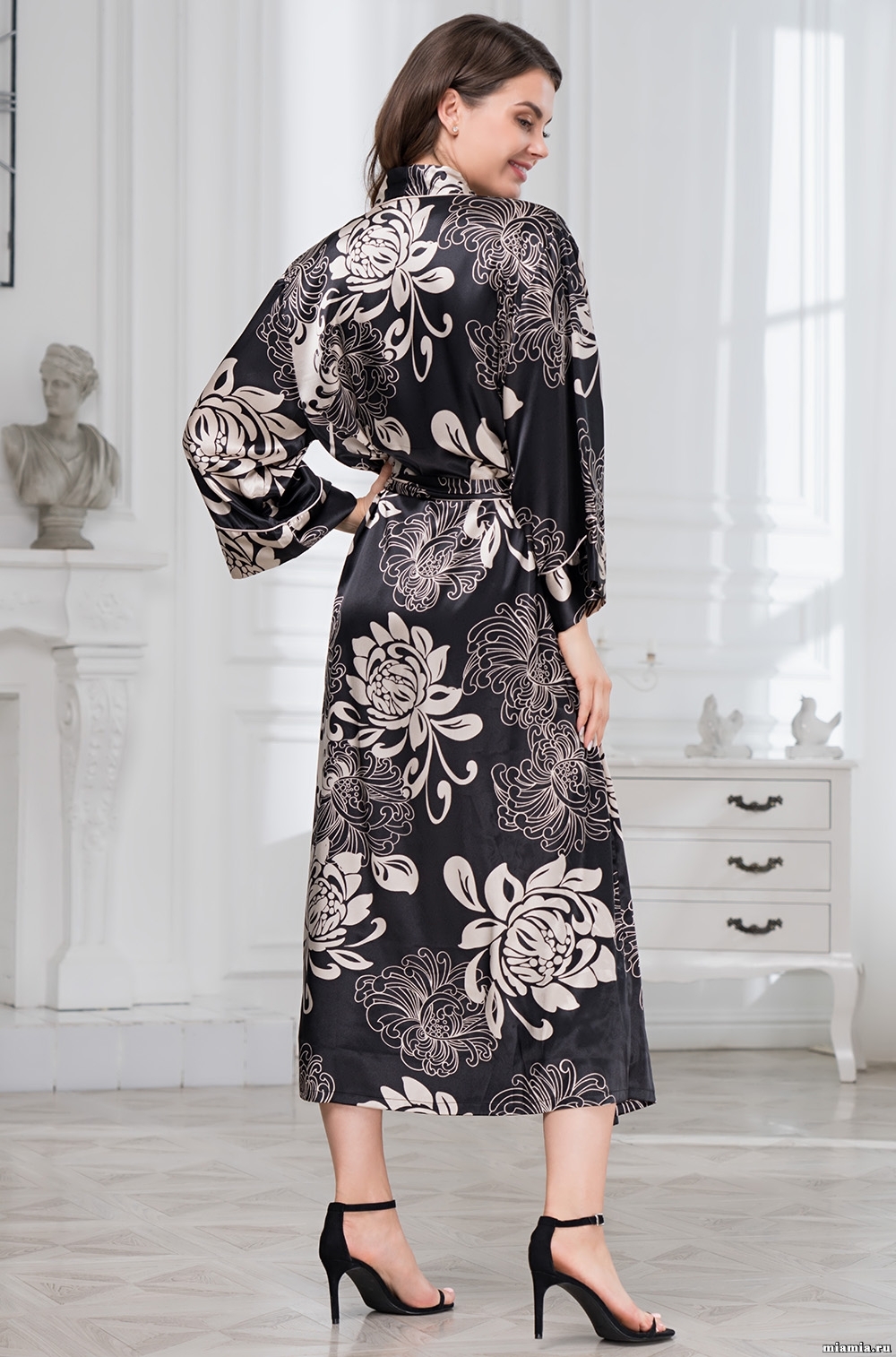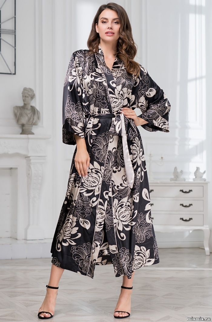 Длинный халат Mia-Amore из искусственного принтованного шелка. Борта халата, притачные широкие манжеты на рукавах 7/8 декорированы тонким изящным кантом. В комплекте идет пояс.