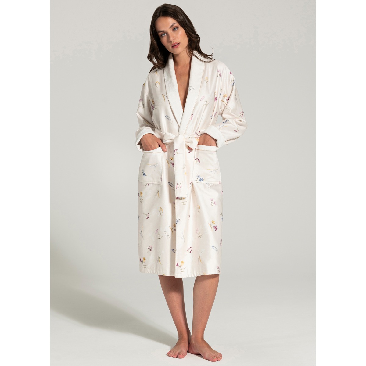Халат выполнен из гладкого сатина с внешней стороны и махровой ткани внутри и имеет 2 накладных передних кармана