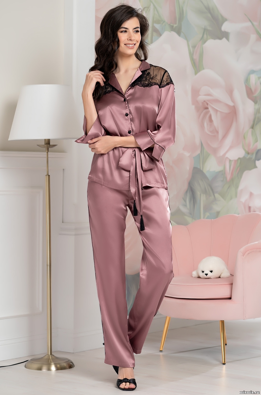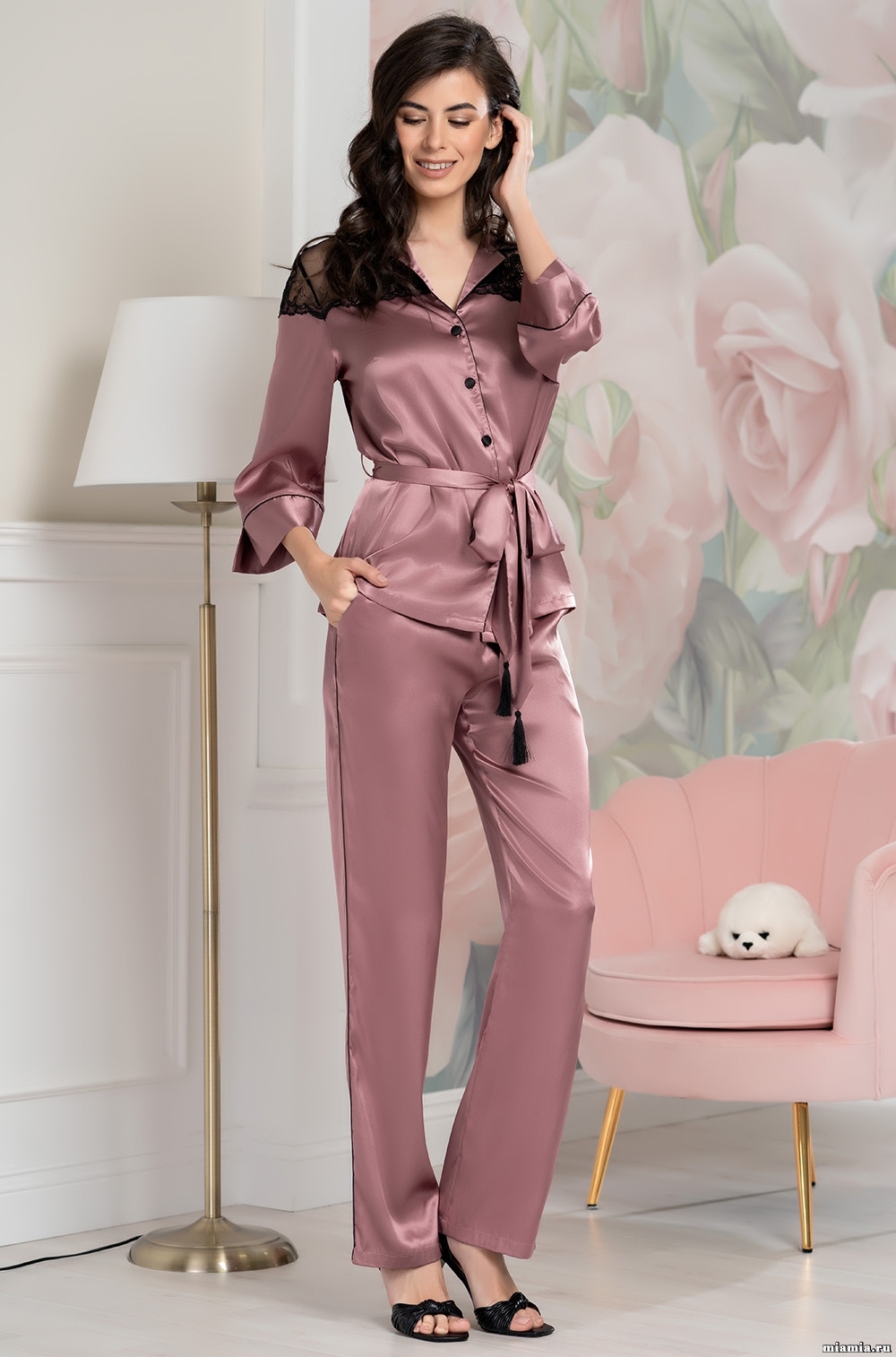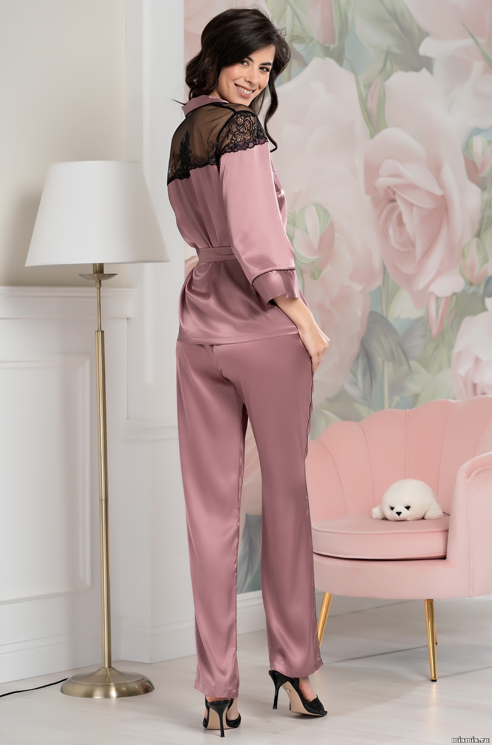 Элегантный комплект Mia-Amore из однотонного смесового шелкового полотна, состоит из жакета и брюк. Жакет свободного силуэта, с отложным воротником, с рукавами ¾. Манжеты и линию борта украшают тонкие контрастные канты. Верх спинки и полочки украшает кружево. Пояс украшен декоративными кисточками. Брюки выполнены из смесового однотонного шелкового полотна, в боковых швах карманы. Боковые швы украшают тонкие контрастные канты.