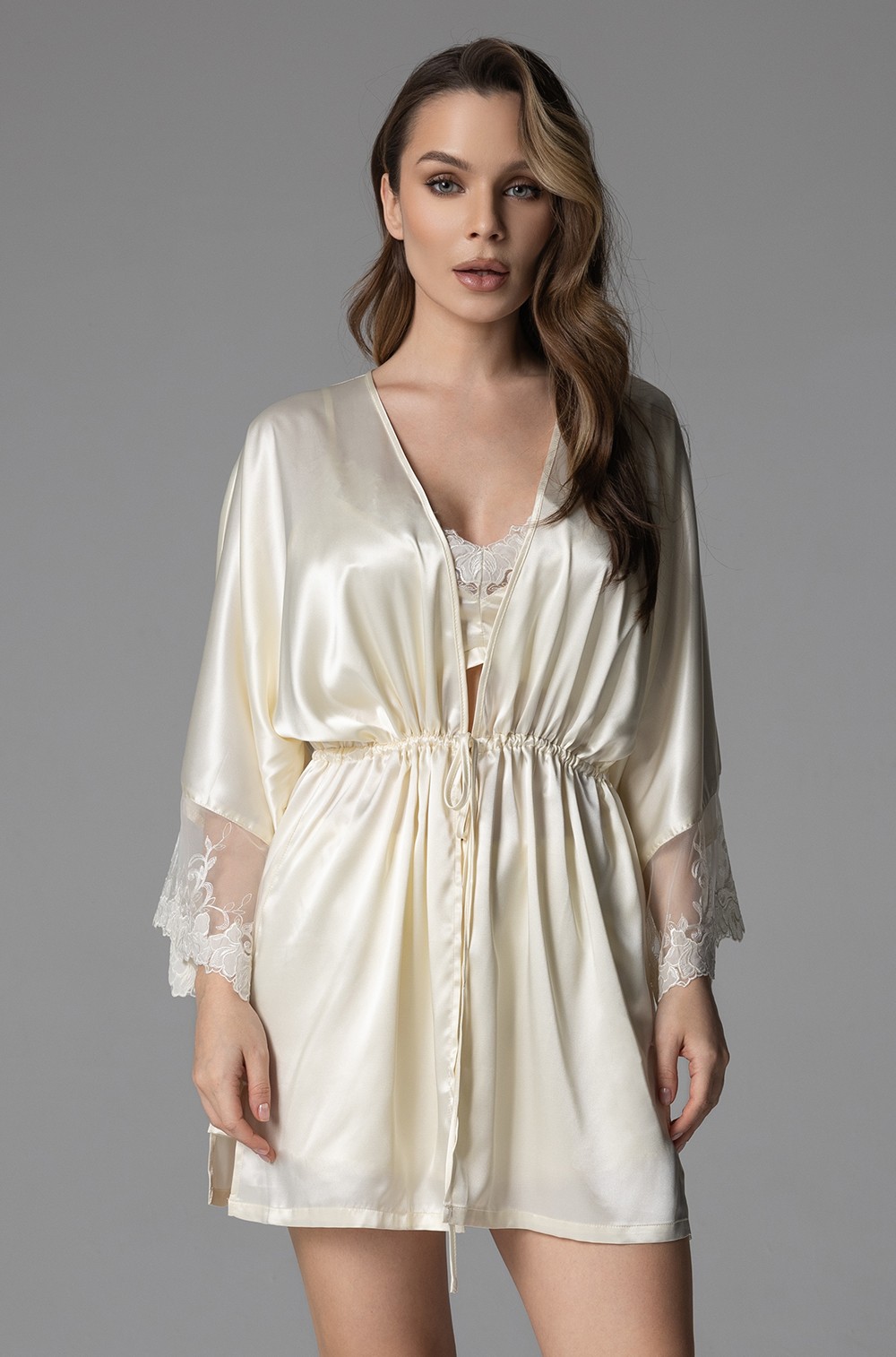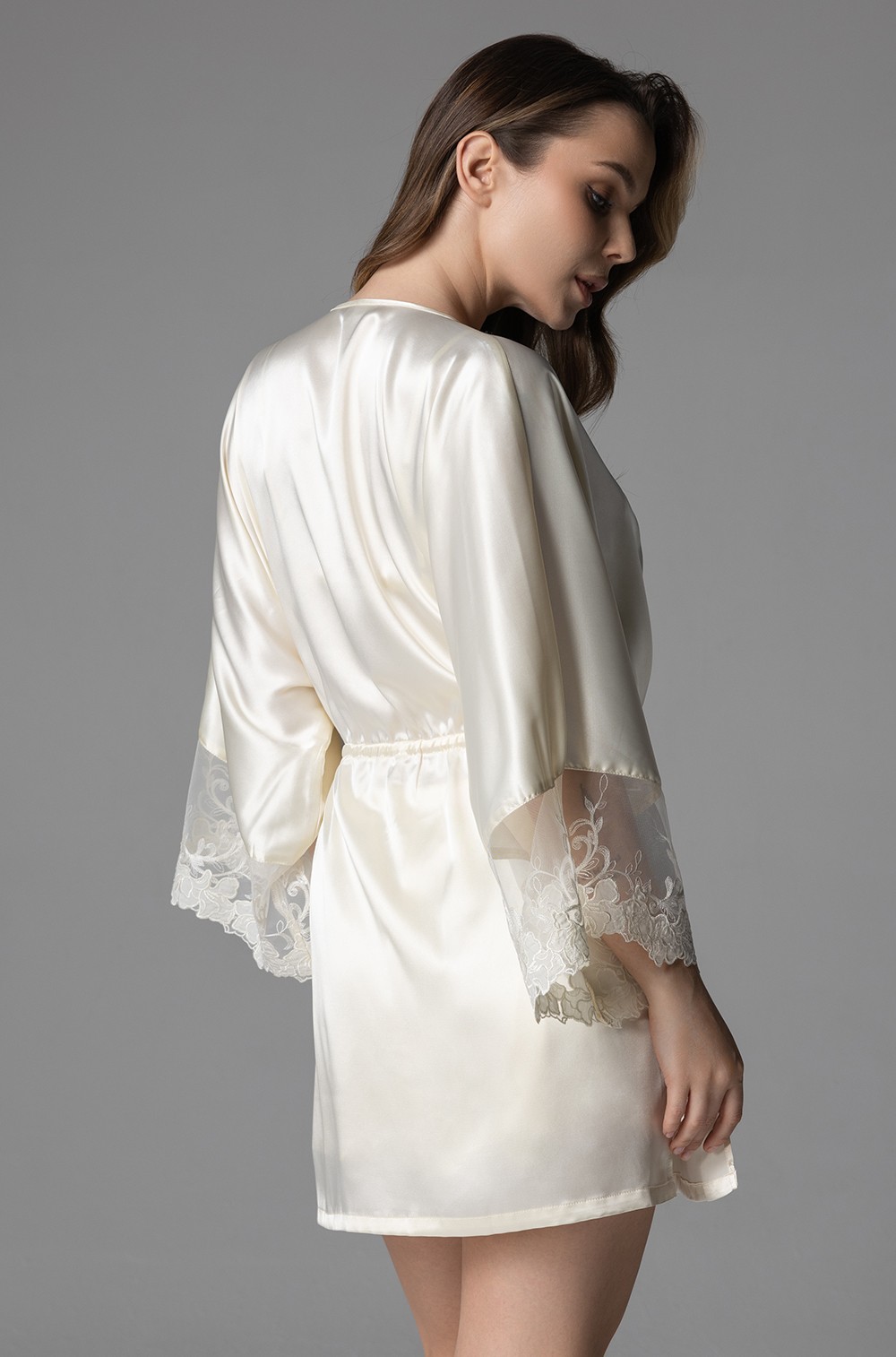 Комплект-тройка Mia-Amore состоит из браллета, шорт и запашного удлинённого халата на кулиске, выполнен из однотонного смесового шёлка. Спереди вырез браллета декорирован вышивным кружевом. Широкие рукава халата декорированы кружевными вставками