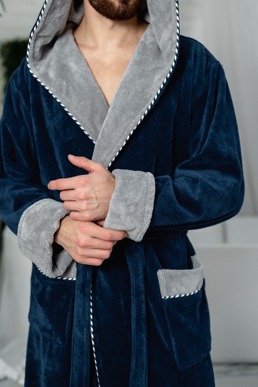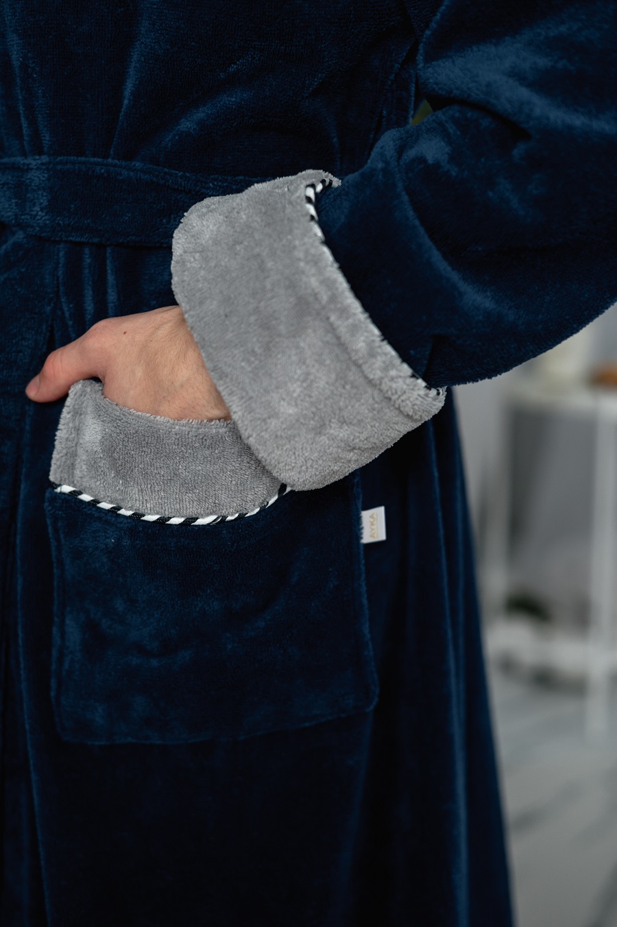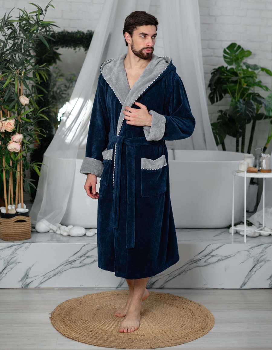 Внешняя сторона халата - велюровая(велюр имеет приятный приглушенный матовый отблеск и противостоит образованию затяжек), а внутренняя сторона из петельчатой махры, создающей легкий массажирующий эффект