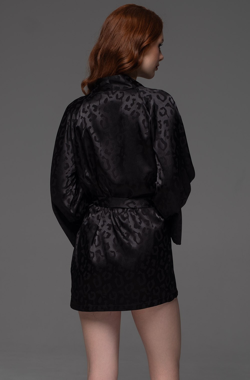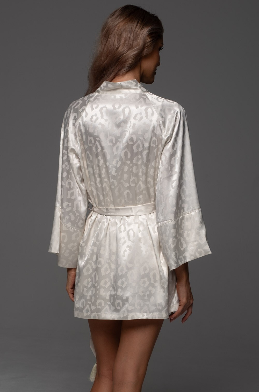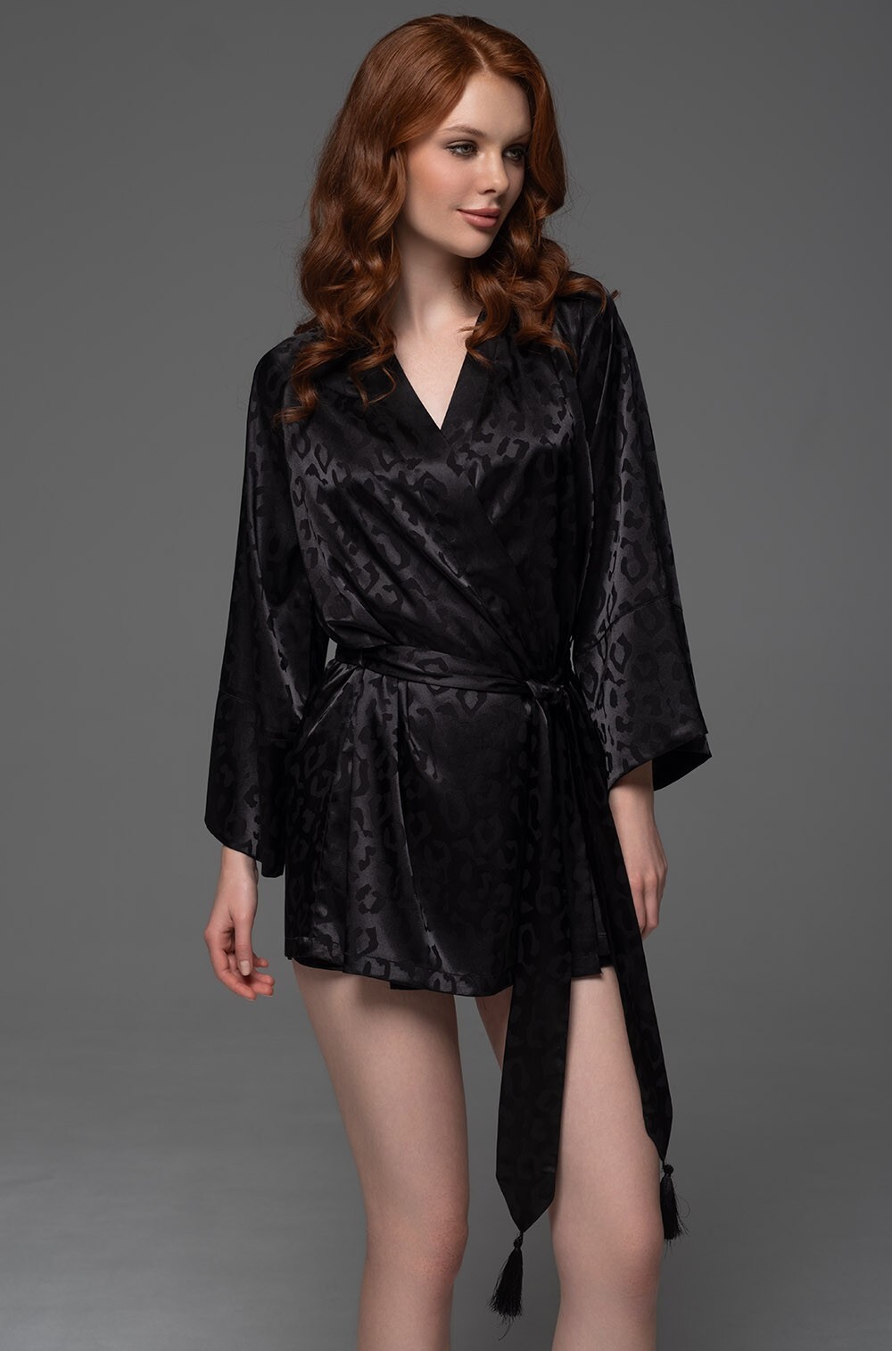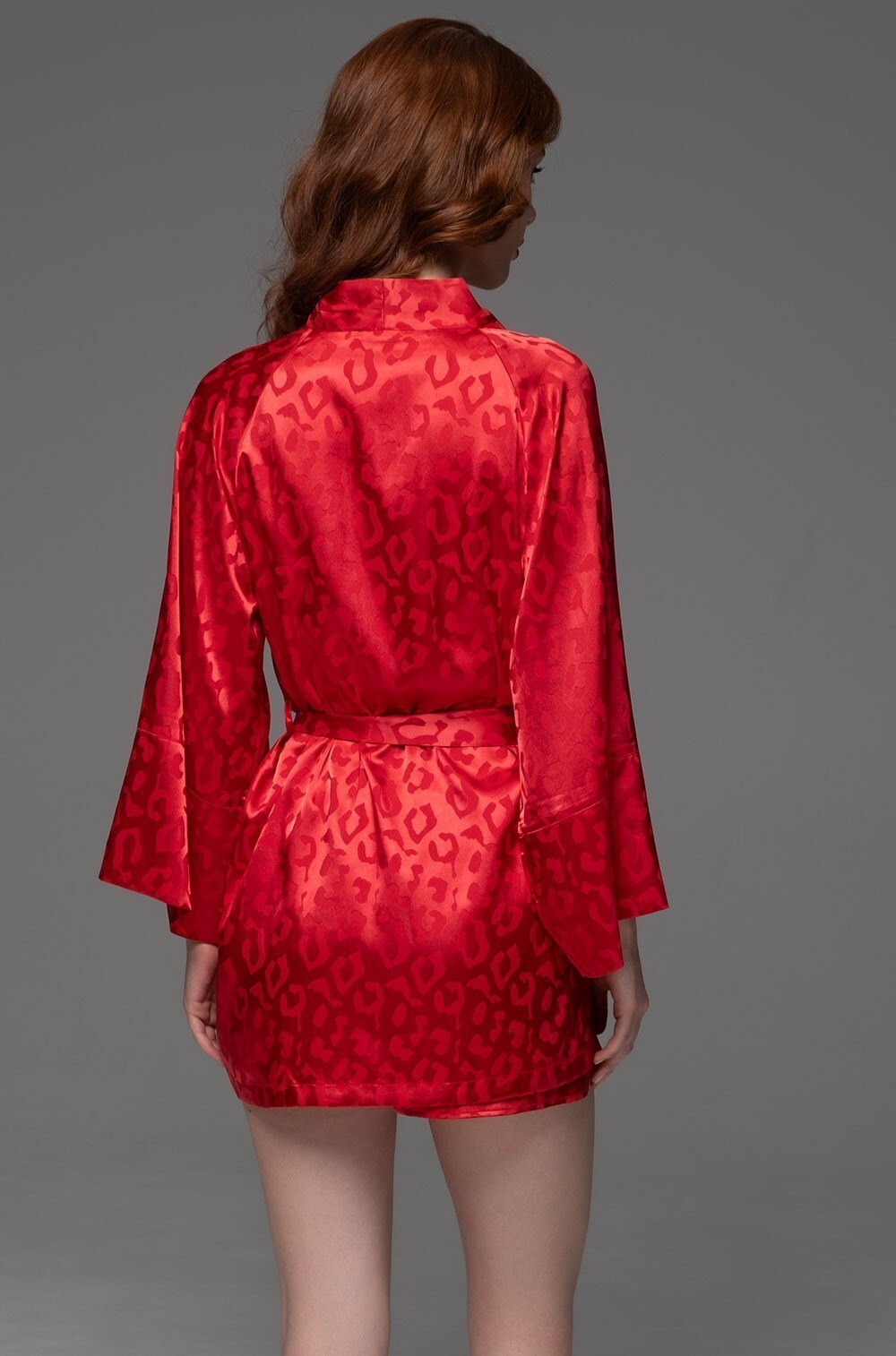 Комплект-тройка Mia-Amore состоит из кроп-топа на тонких бретелях, шорт и укороченного запашного халата. По бокам шорт обработаны небольшие разрезы для свободы движения. Изделия комплекта выполнены из искусственного шелка на жаккардовой основе.