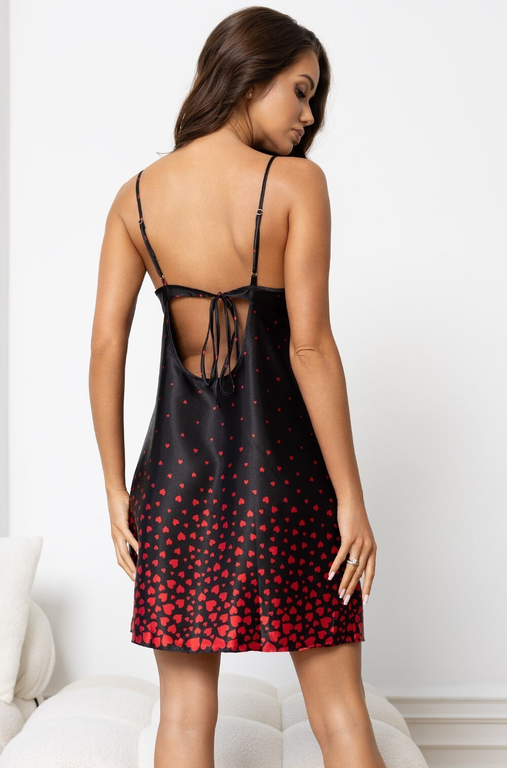 Короткая сорочка Mia-Amore с отрезными чашками на тонких регулируемых бретелях выполнена из принтованного искусственного шёлка. На спинке сорочки по центру эффектный вырез с завязкой.