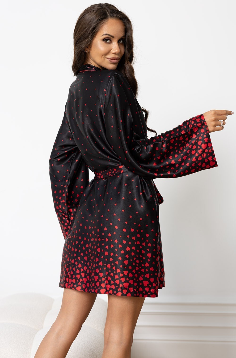 Короткий запашной халат Mia-Amore с длинными рукавами выполнен из принтованного искусственного шёлка. Рукава по низу и низ халата украшены сердечками в виде принта. Халат комплектуется широким поясом, в боковых швах карманы.