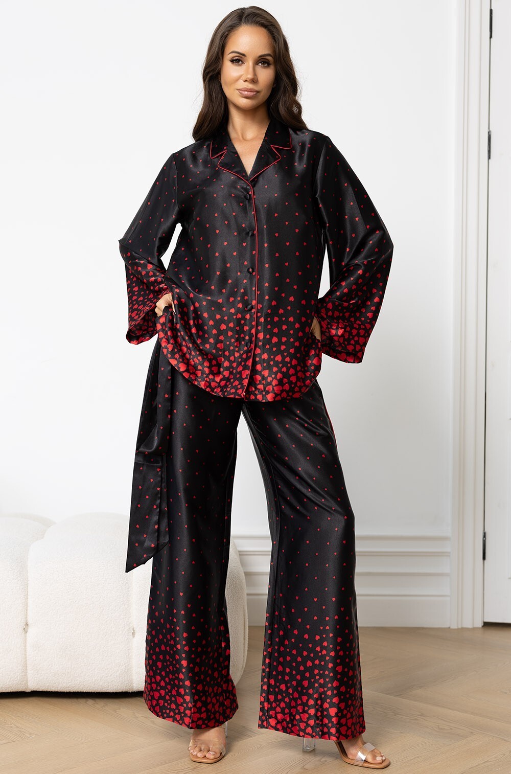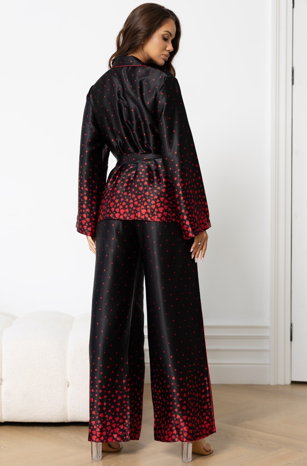 Комплект Mia-Amore состоит из брюк и жакета на пуговицах, выполнен из принтованного искусственного шёлка. Брюки с эластичным поясом и боковыми карманами. Жакет с английским воротником и центральной застёжкой на пуговицы, с длинными рукавами. По талии жакет можно приталить с помощью съёмного пояса.