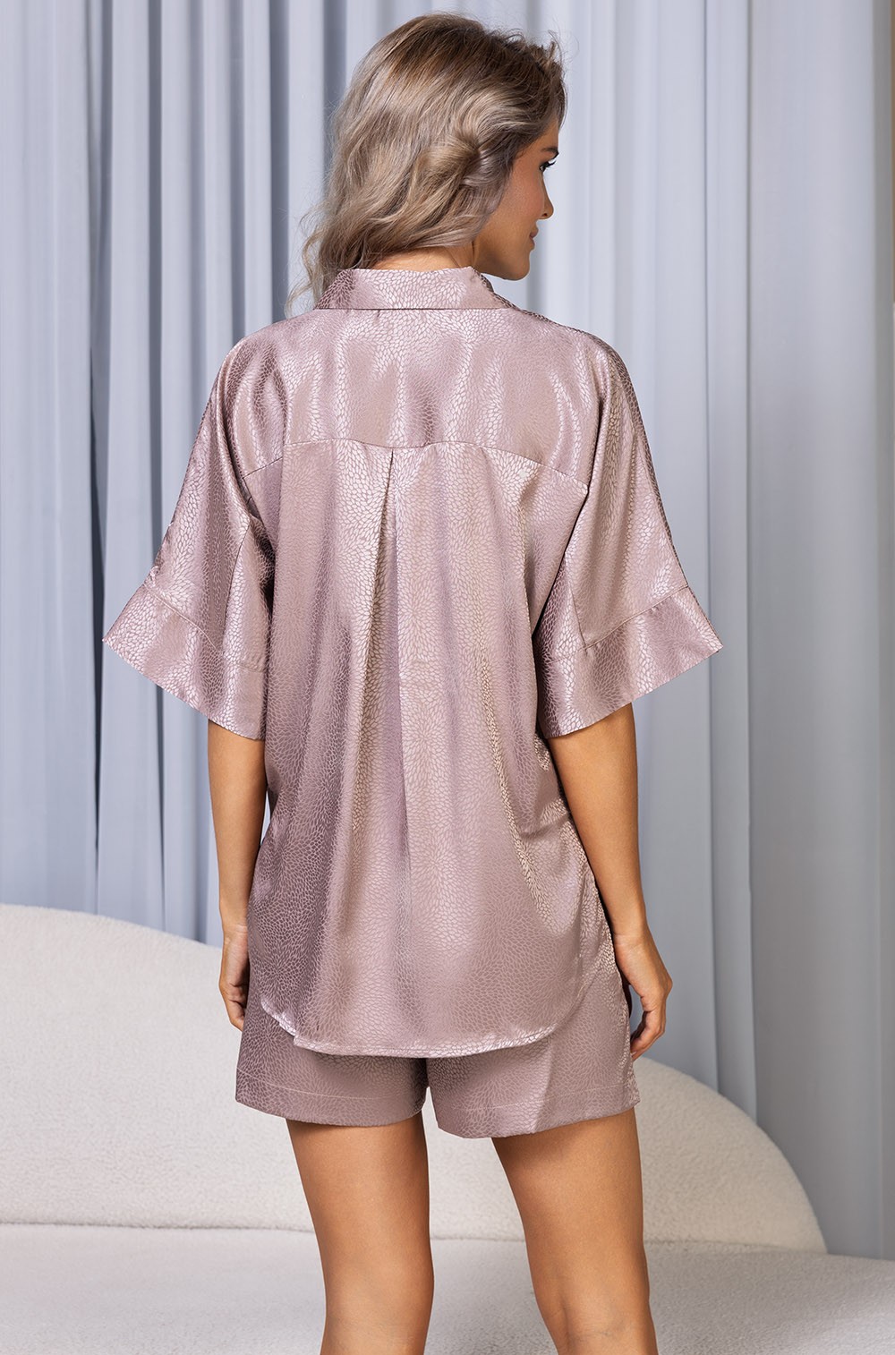 Комплект Mia-Amore состоит из рубашки и шорт, выполнен из жаккардового полотна из искусственных волокон. Рубашка свободного силуэта с короткими рукавами и центральной застежкой на пуговицы и английским воротником. Комфортные шорты свободного силуэта с декоративной завязкой на поясе.