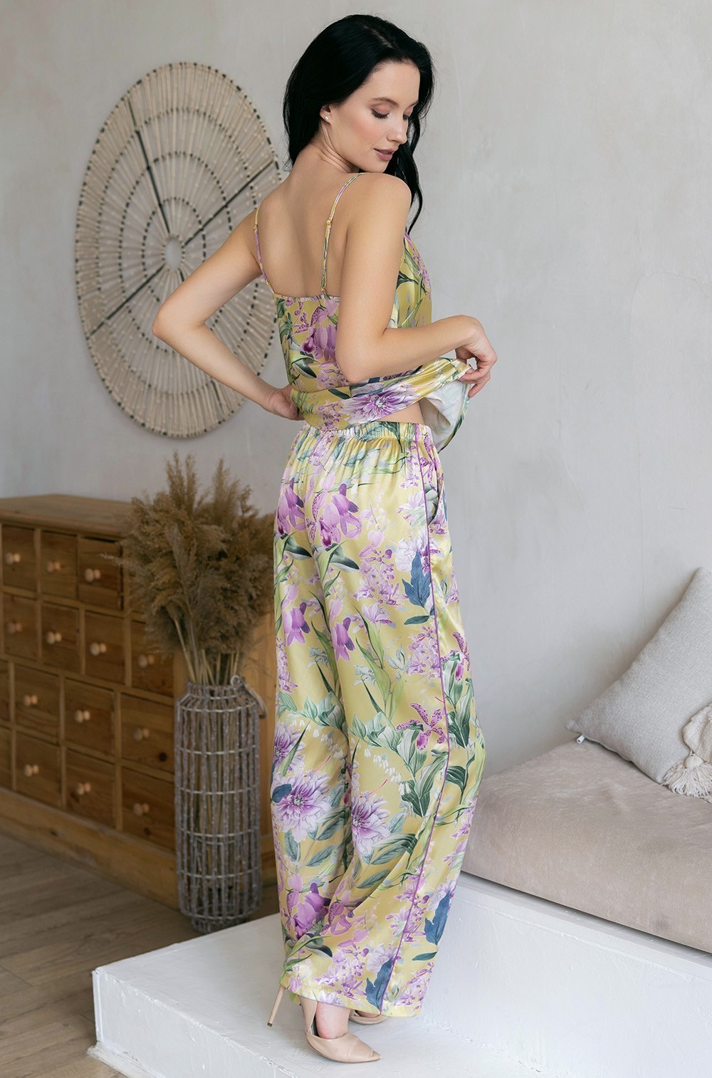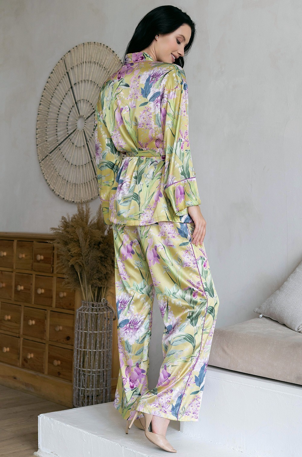 Комплект-тройка Mia-Amore состоит из топа на тонких бретелях, брюк-паллацо и запашного жакета, выполнен из принтованного смесового шёлка. Планка жакета, рукава и боковые швы брюк декорированы контрастным кантом. Жакет запахивается с помощью съёмного пояса, спереди есть накладные карманы с отделкой контрастным кантом. В брюках есть карманы. По центру лифа топа бантик с подвеской.