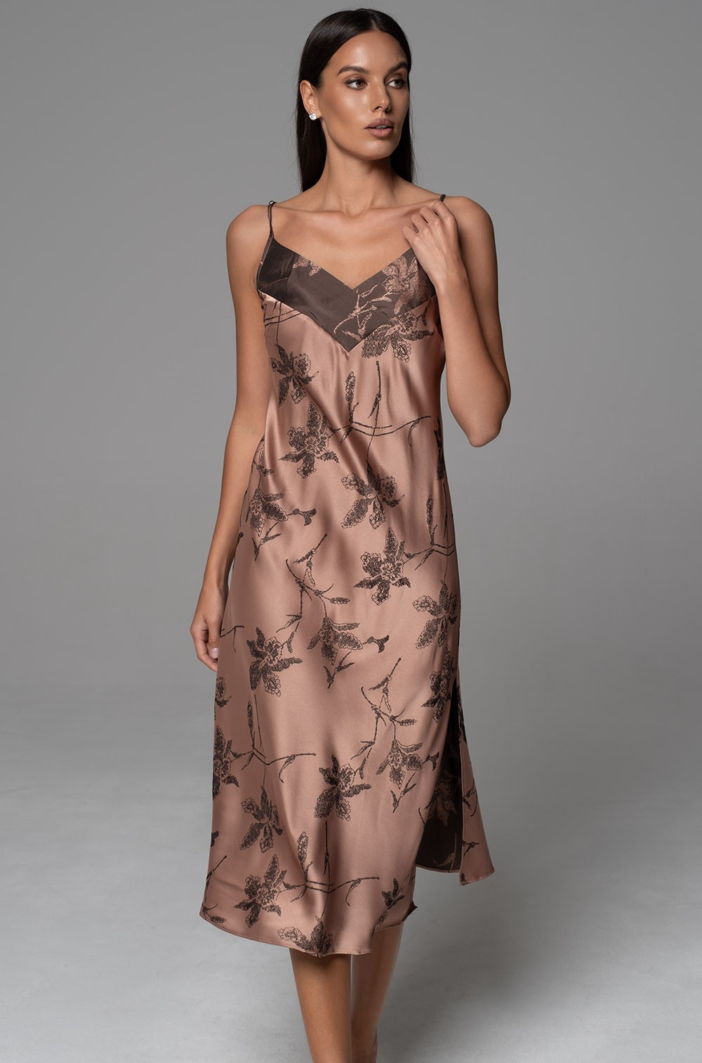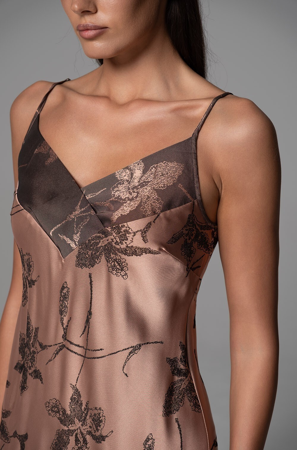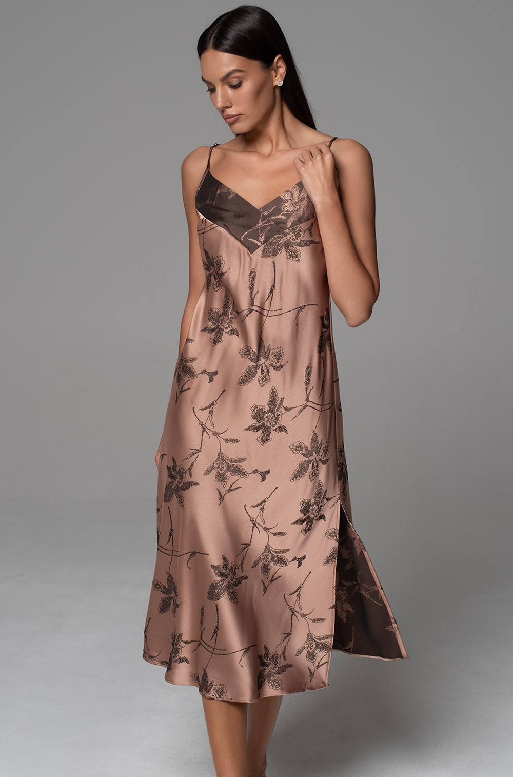 Длинная сорочка Mia-Amore без подреза на тонких регулируемых бретелях выполнена из жаккардового двухцветного смесового шёлка. Спереди лиф украшен обтачкой из тёмного компаньона.