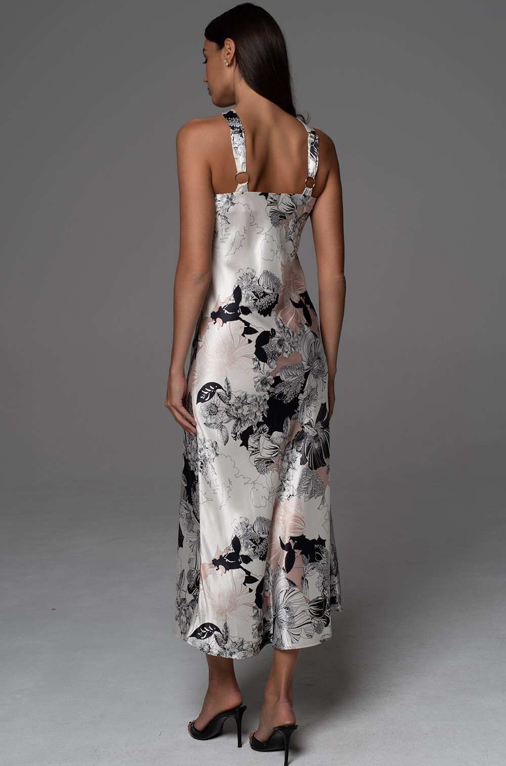 Элегантное длинное платье-комбинация Mia-Amore полуприлегающего силуэта, на широких бретелях, без подреза под грудью. Изделие выполнено из принтованного смесового шелка. По центру низа изделия расположен разрез для свободы движения.