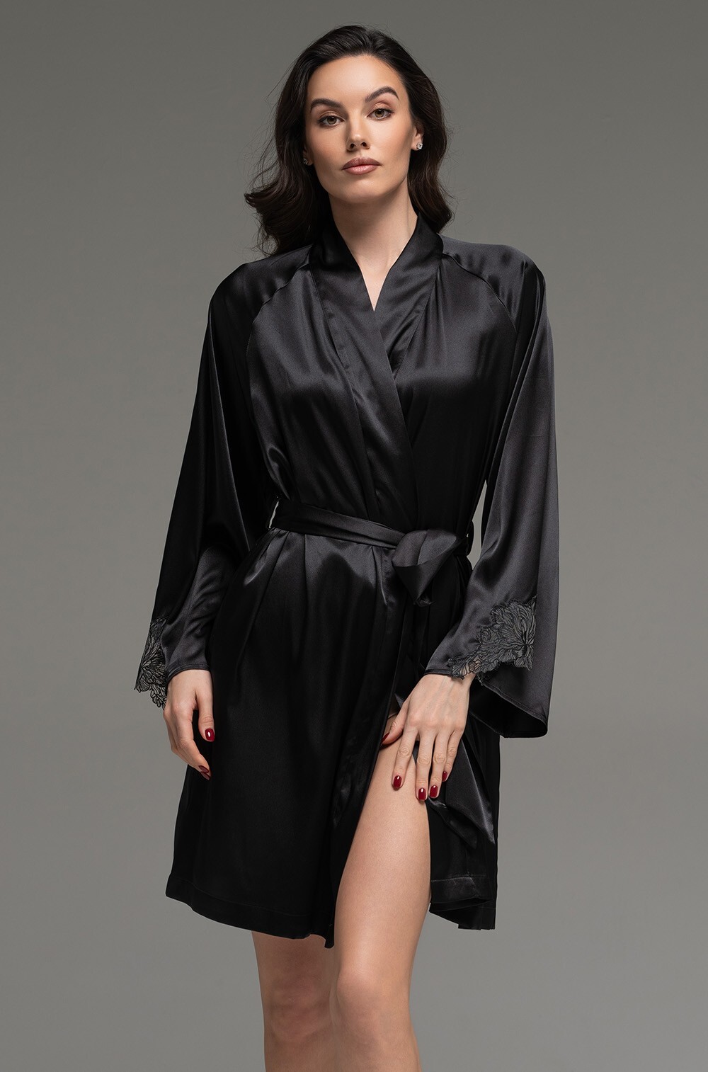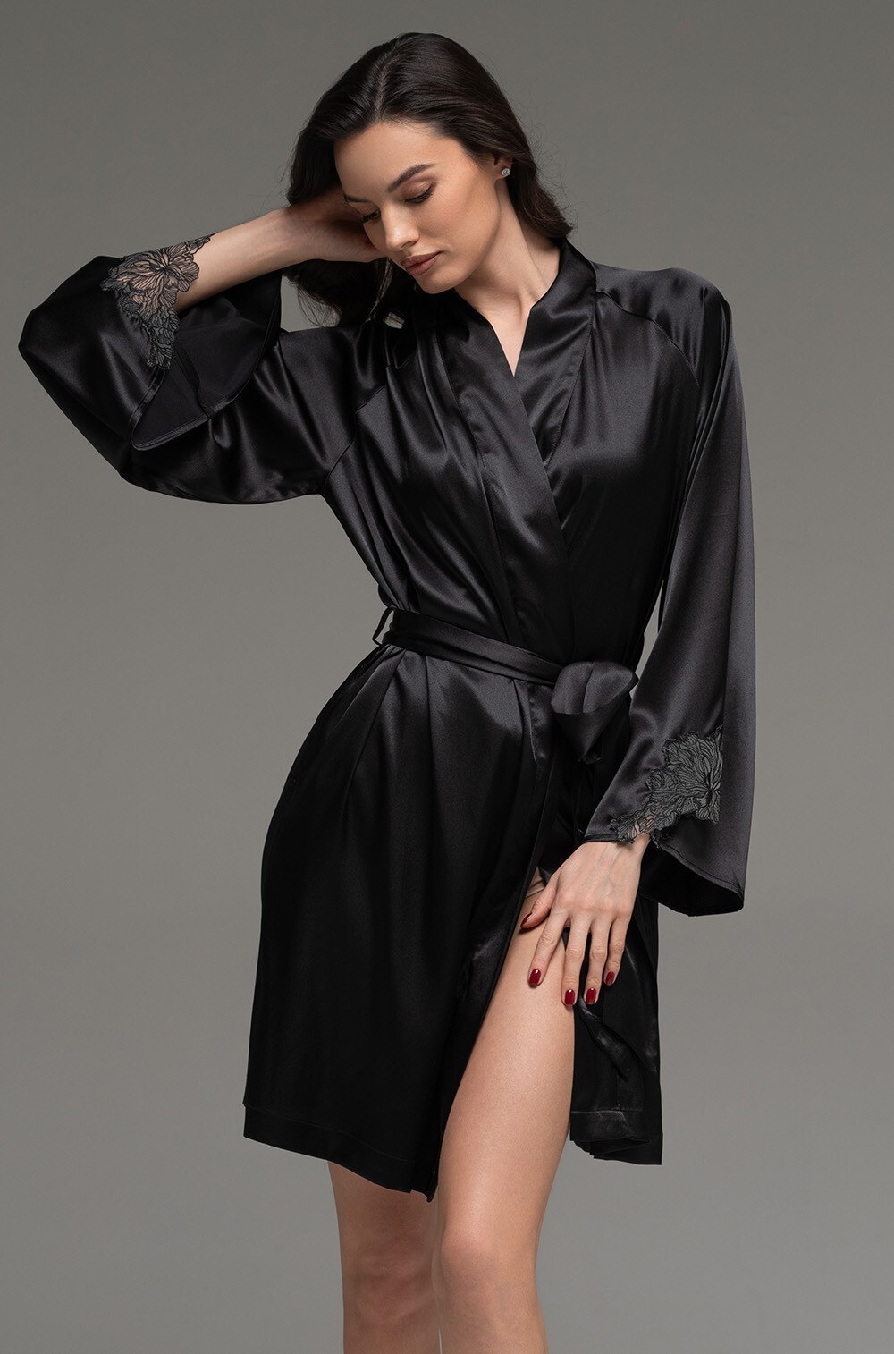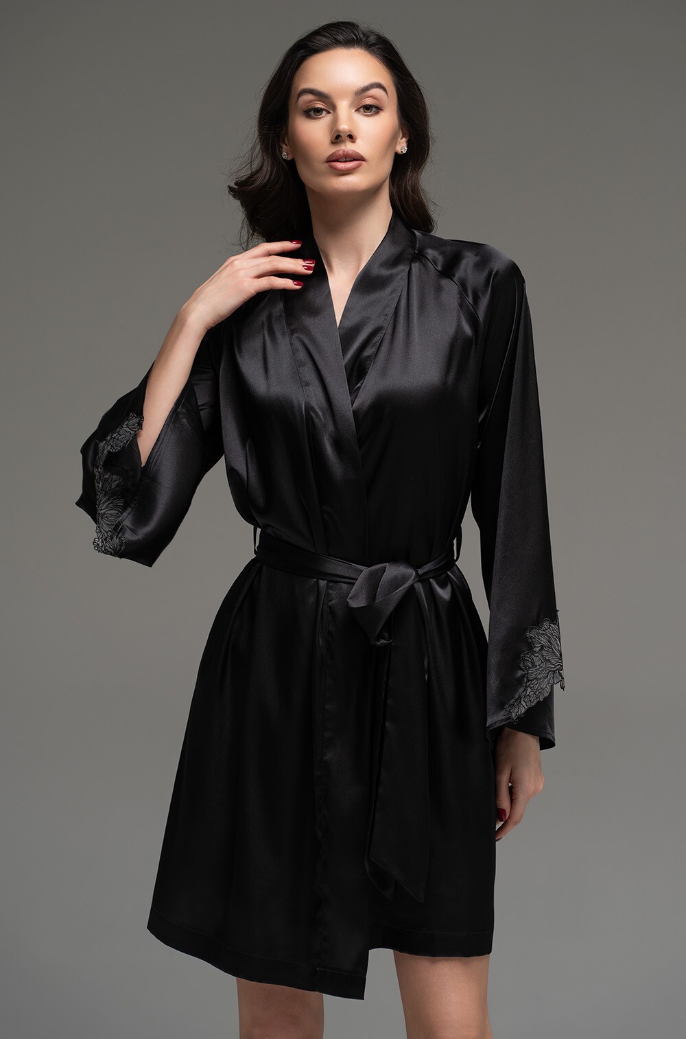 Короткий запашной халат Mia-Amore с длинными рукавами реглан выполнен из однотонного смесового шёлка. По низу рукава украшены ажурными вставками из вышитого кружева. В боковых швах есть карманы. Халат запахивается с помощью широкого съёмного пояса.