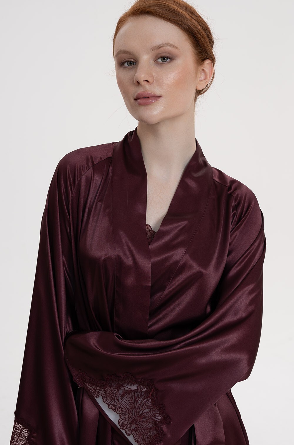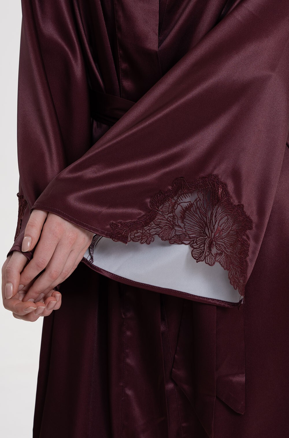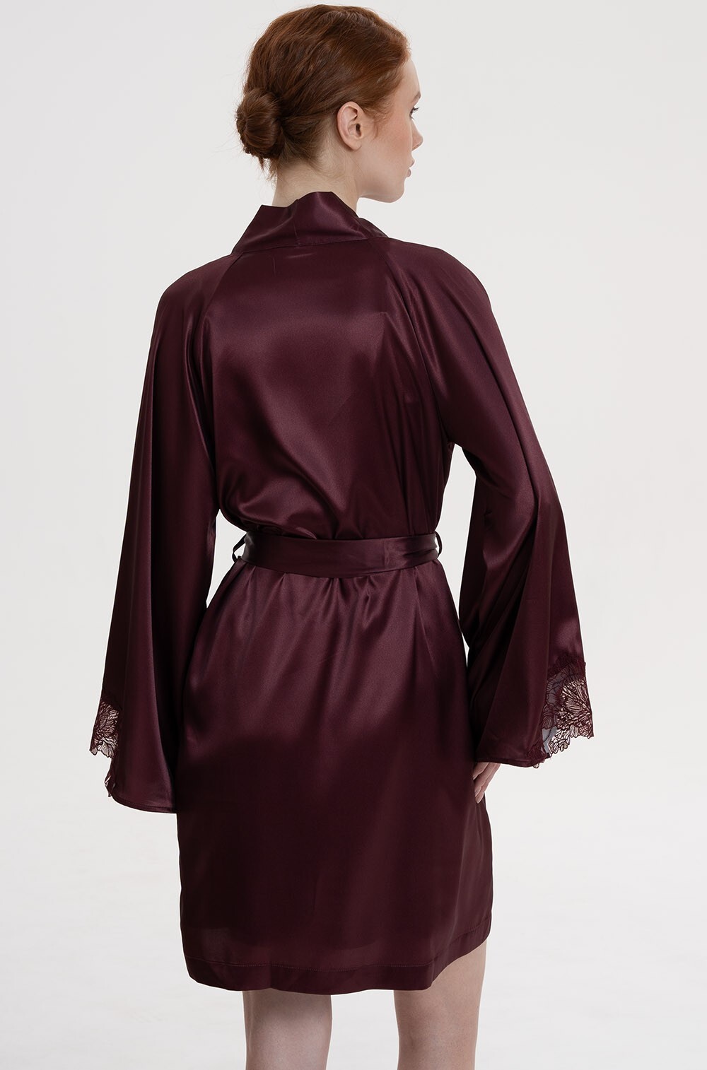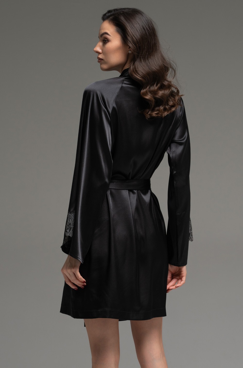 Короткий запашной халат Mia-Amore с длинными рукавами реглан выполнен из однотонного смесового шёлка. По низу рукава украшены ажурными вставками из вышитого кружева. В боковых швах есть карманы. Халат запахивается с помощью широкого съёмного пояса.