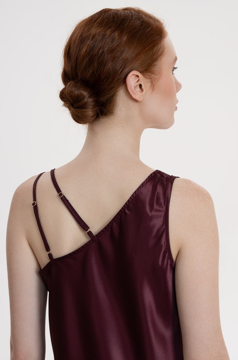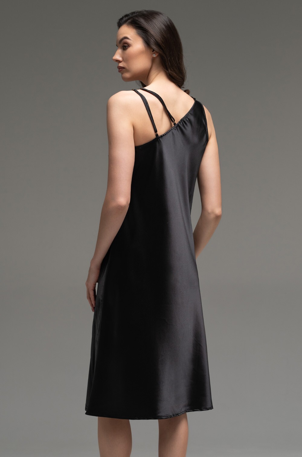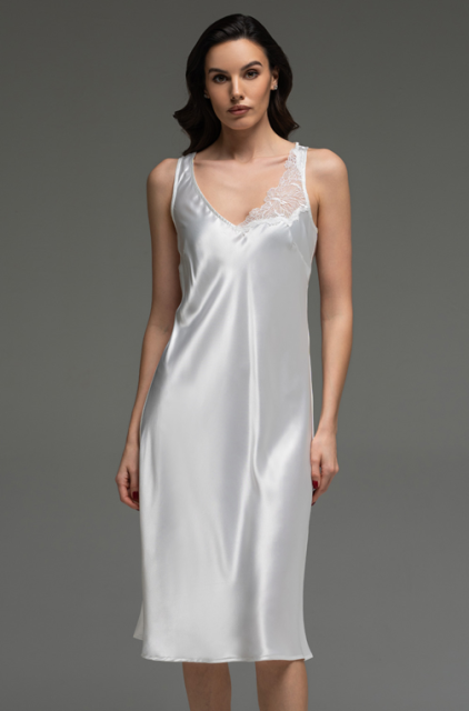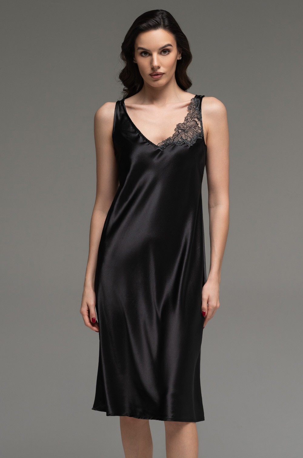 Сорочка средней длины Mia-Amore на тонких регулируемых бретелях выполнена из однотонного смесового шёлка. Сорочка имеет ассиметричные плечи, одна из сторон украшена элементом из ажурного кружева, другая выполняет роль регулируемых бретелей.