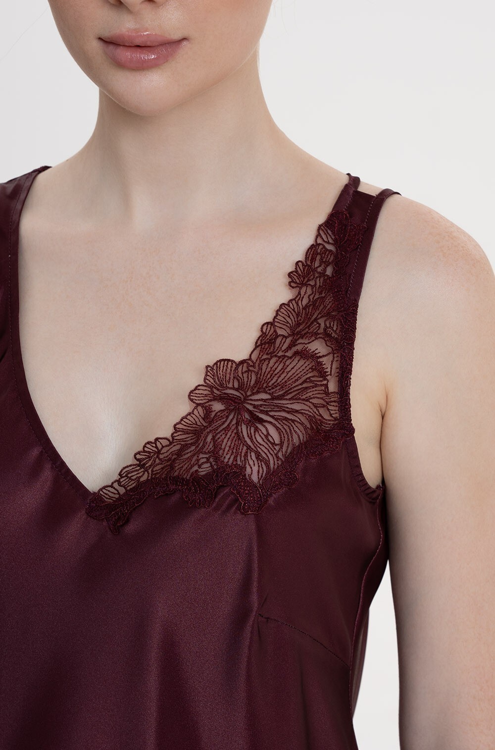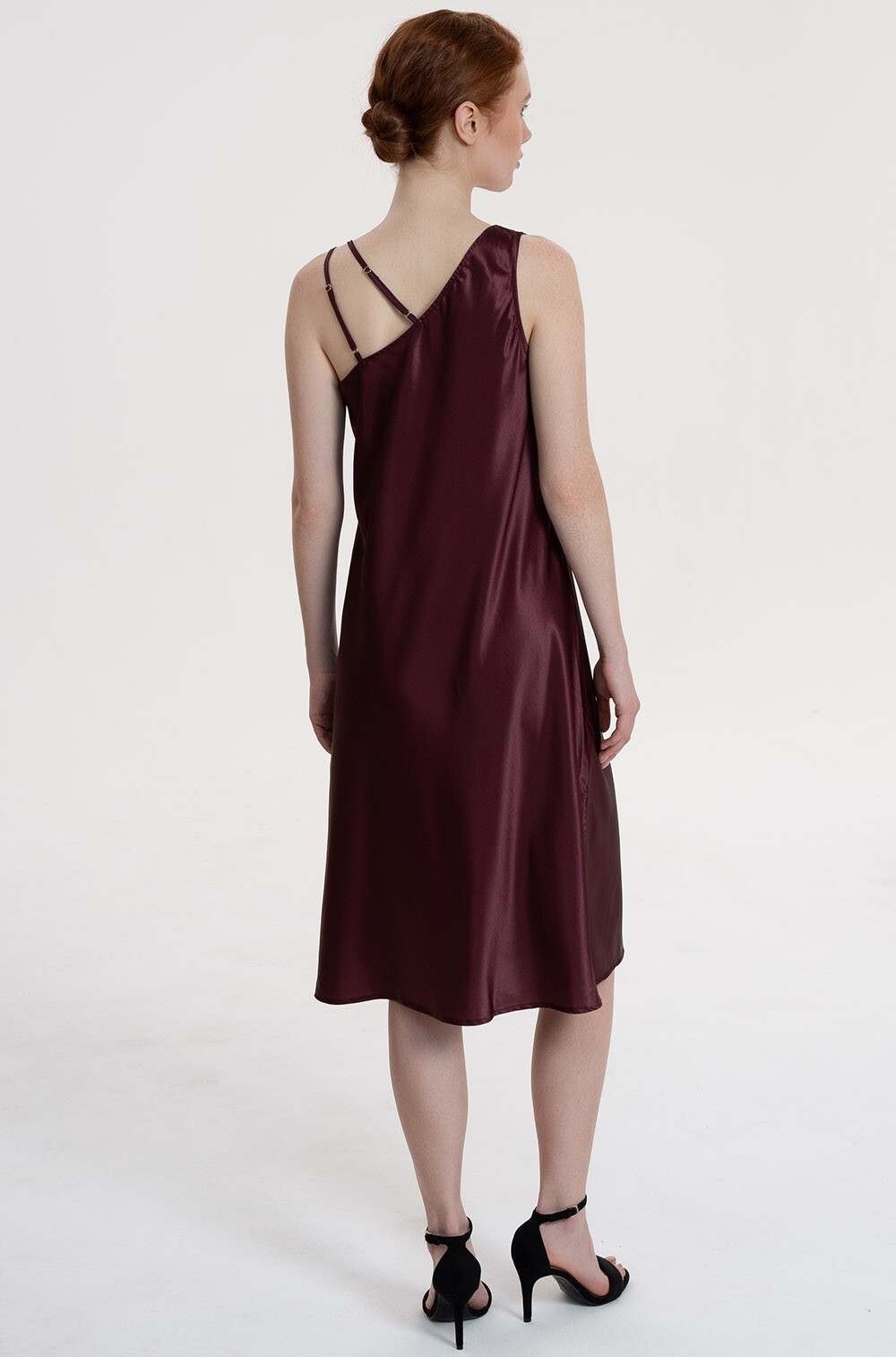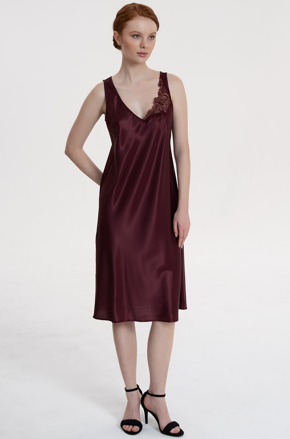 Сорочка средней длины Mia-Amore на тонких регулируемых бретелях выполнена из однотонного смесового шёлка. Сорочка имеет ассиметричные плечи, одна из сторон украшена элементом из ажурного кружева, другая выполняет роль регулируемых бретелей.