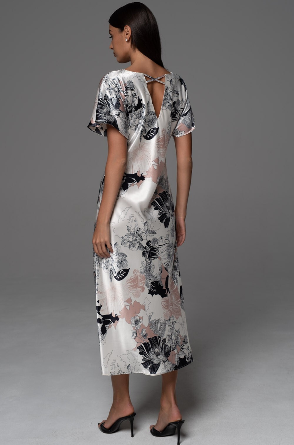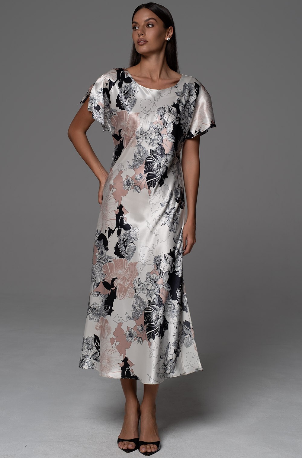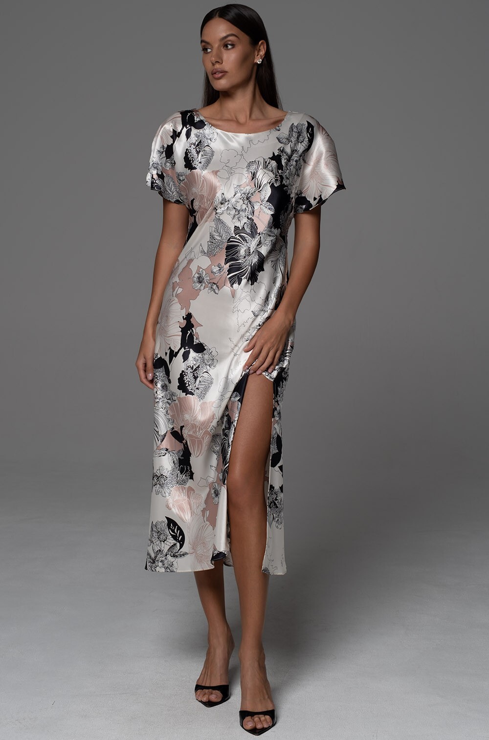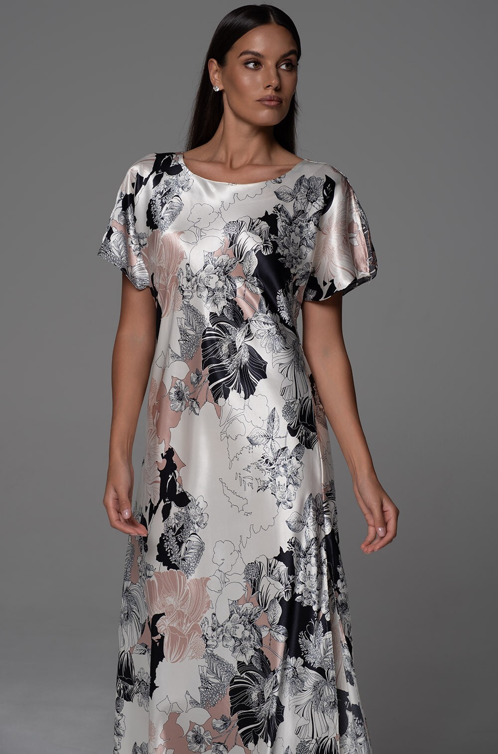 Женственное длинное платье-комбинация Mia-Amore полуприлегающего силуэта с коротким рукавом. Изделие выполнено из принтованного смесового шелка. По бокам расположен разрезы для свободы движения.