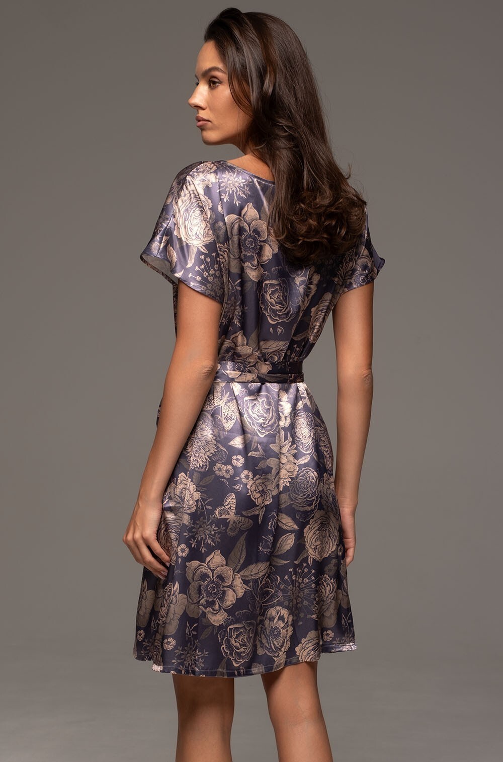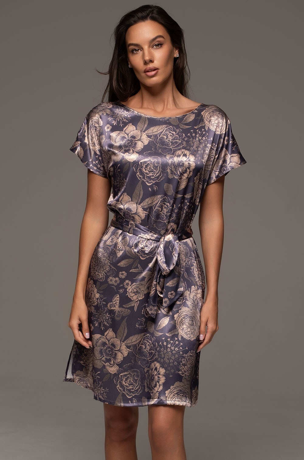 Туника Mia-Amore свободного кроя длиной до колен с цельнокроеными укороченными рукавами выполнена из принтованного смесового шелка. Округлый вырез горловины и низ рукавом обработаны обтачками из принтованного атласа. Туника комплектуется поясом, в боковых швах обработаны карманы.