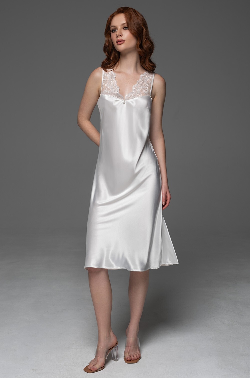 Длинная сорочка Mia-Amore выполнена из однотонного смесового шёлка. Бретели сорочки маечного типа, лиф сорочки сверху украшают вставки из изысканного вышитого кружева.