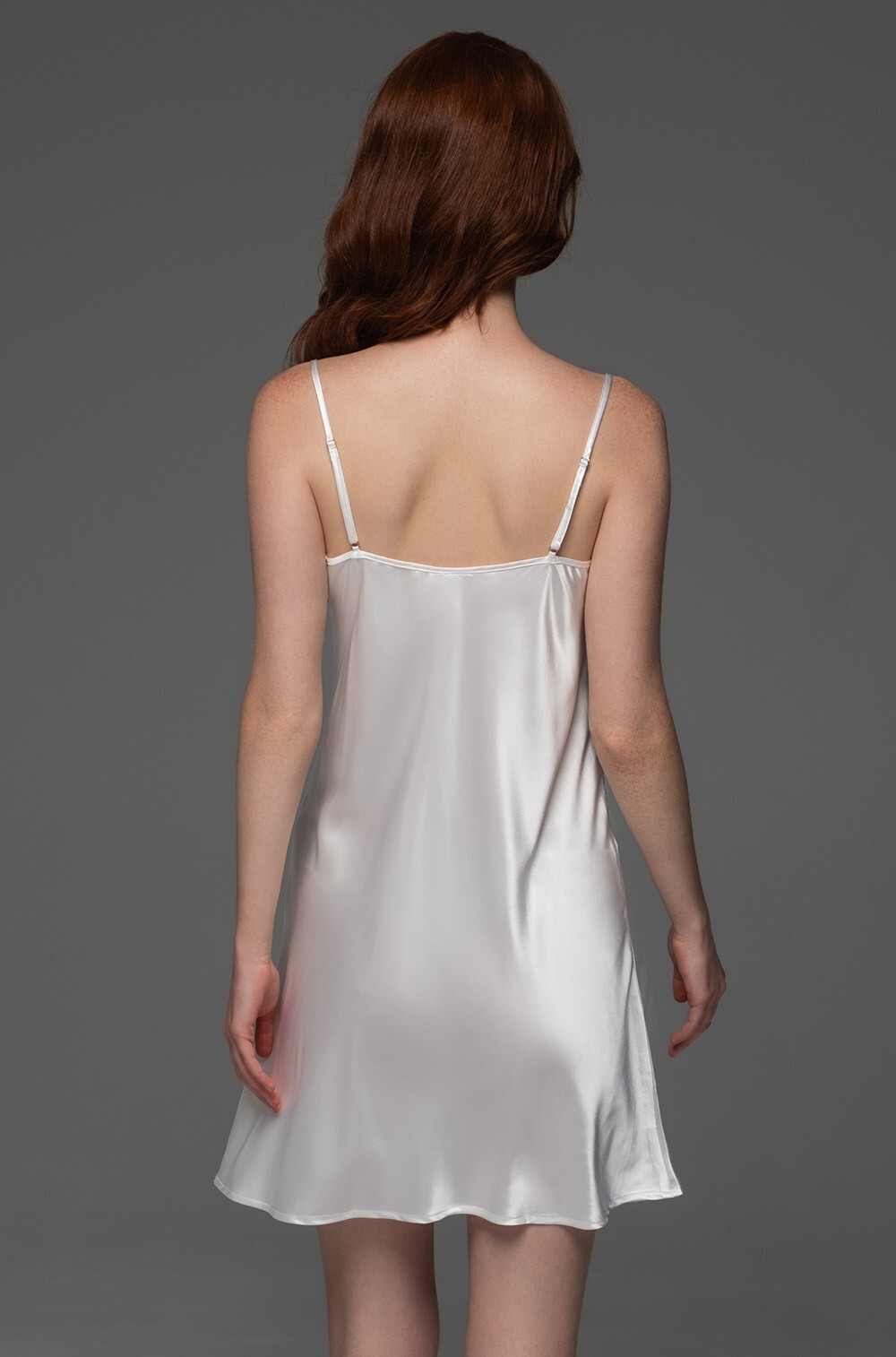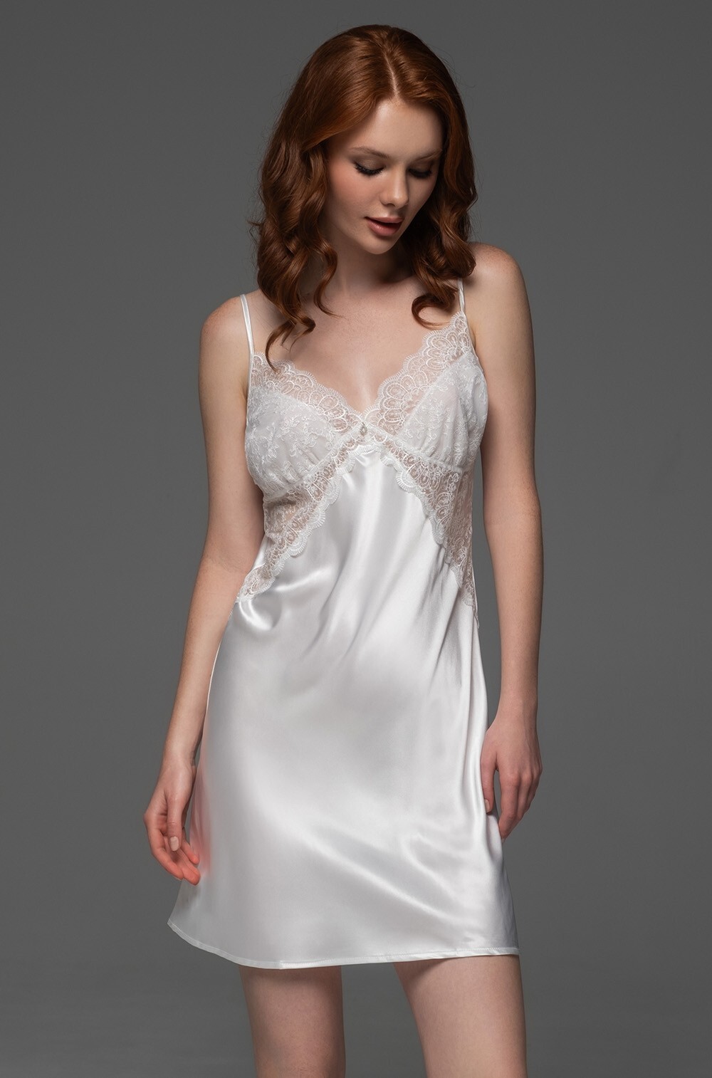 Короткая сорочка Mia-Amore на тонких регулируемых бретелях выполнена из однотонного смесового шёлка. Лиф сорочки богато декорирован вышивным мягким кружевом.