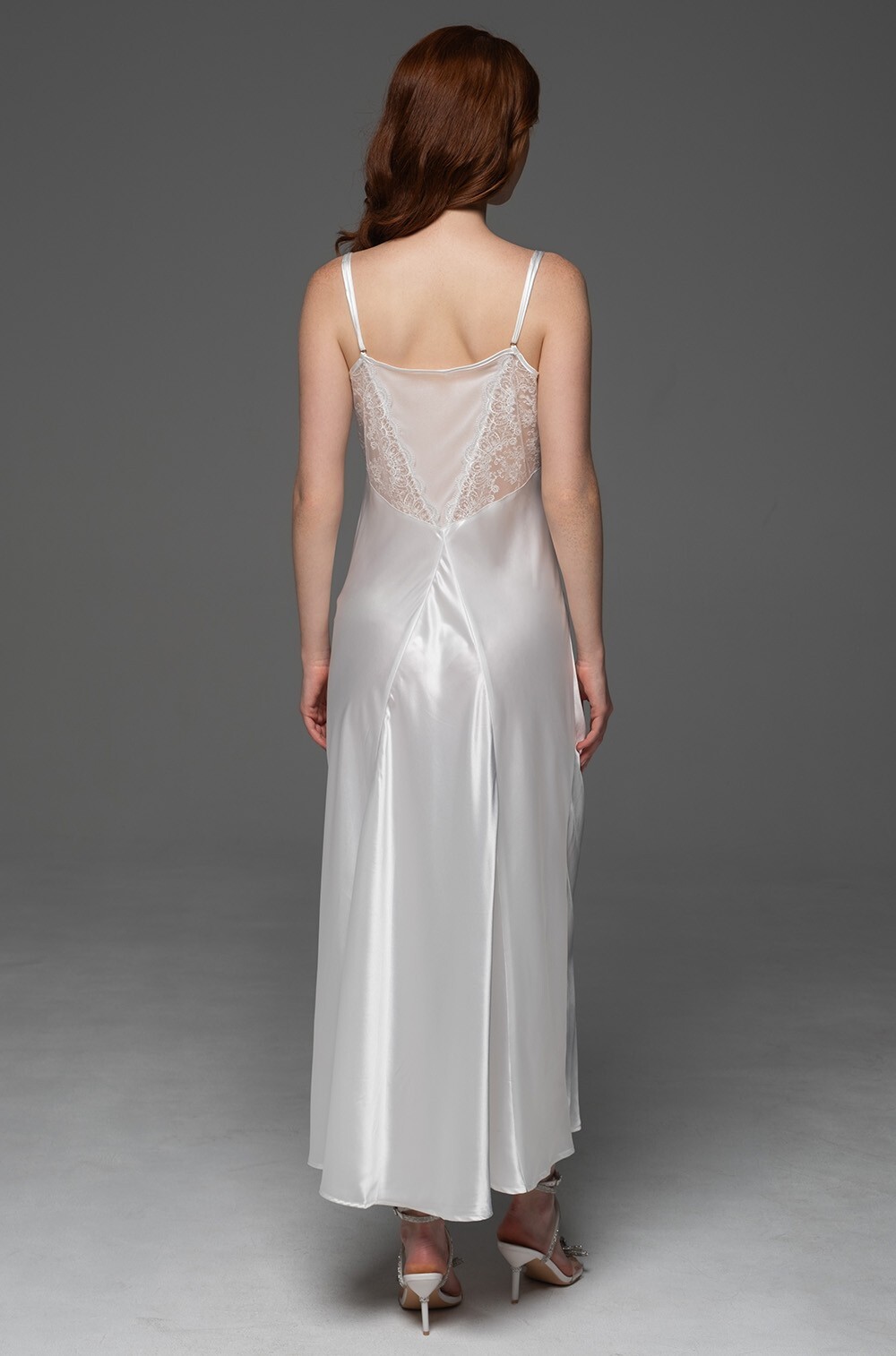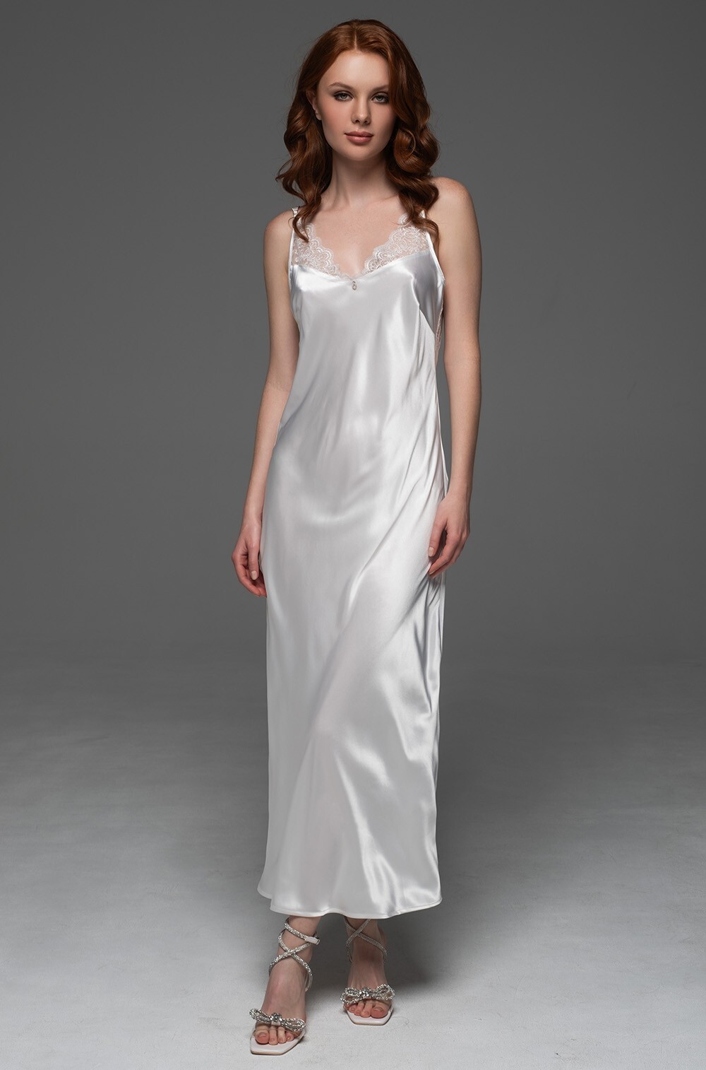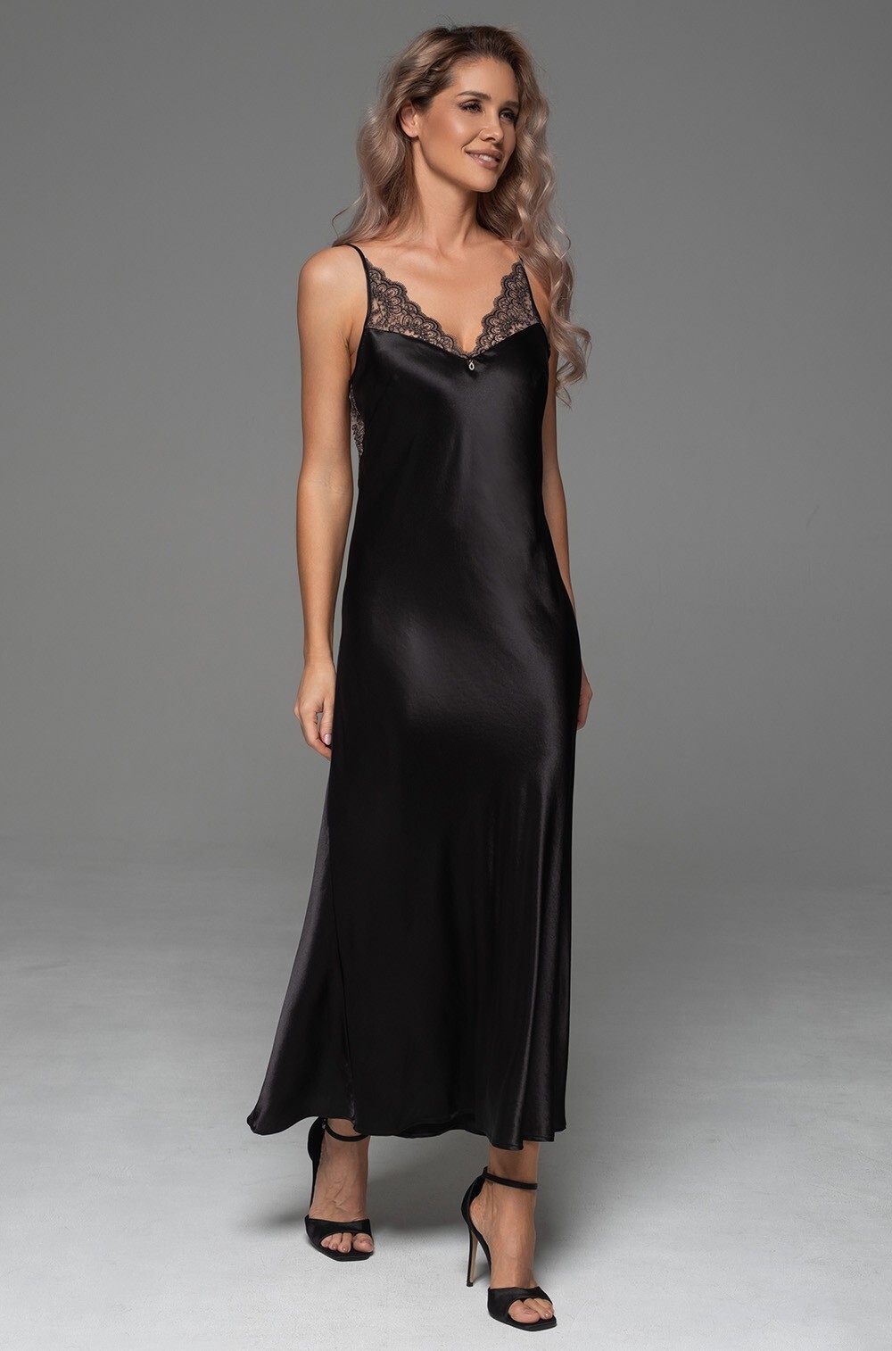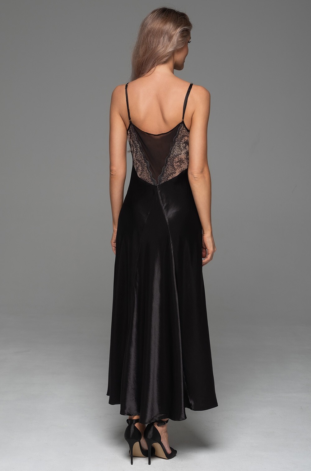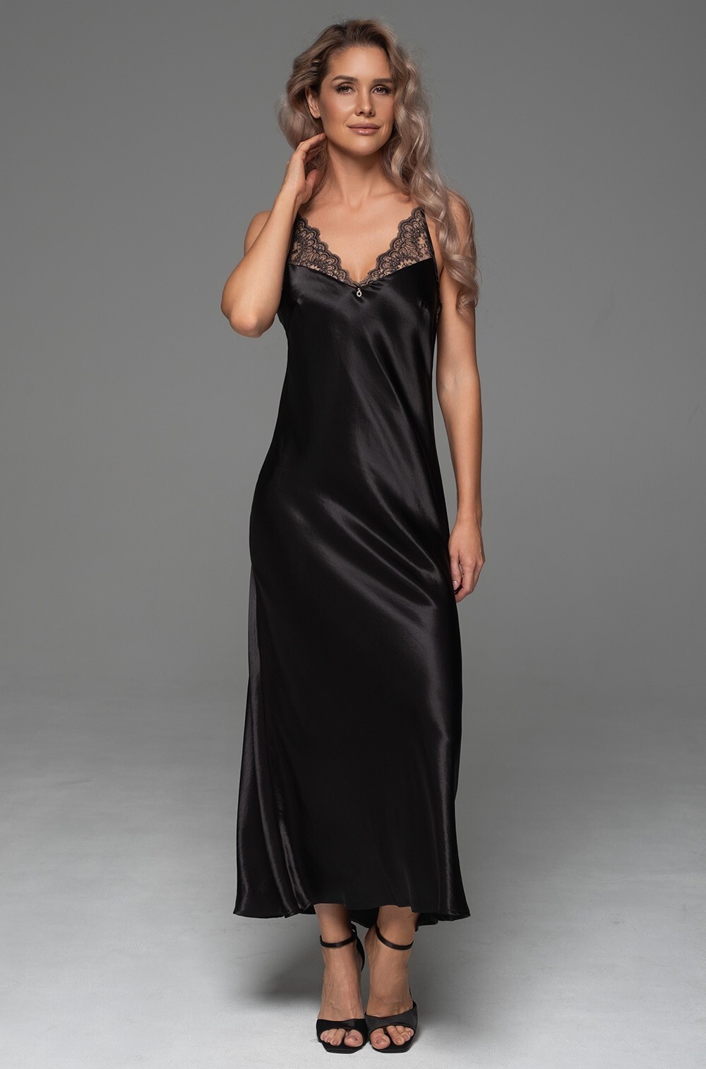 Длинная сорочка Mia-Amore на тонких регулируемых бретелях выполнена из однотонного смесового шёлка. Лиф сорочки декорирован вышивным мягким кружевом, на спинке изящная вставка из кружева и сетки.