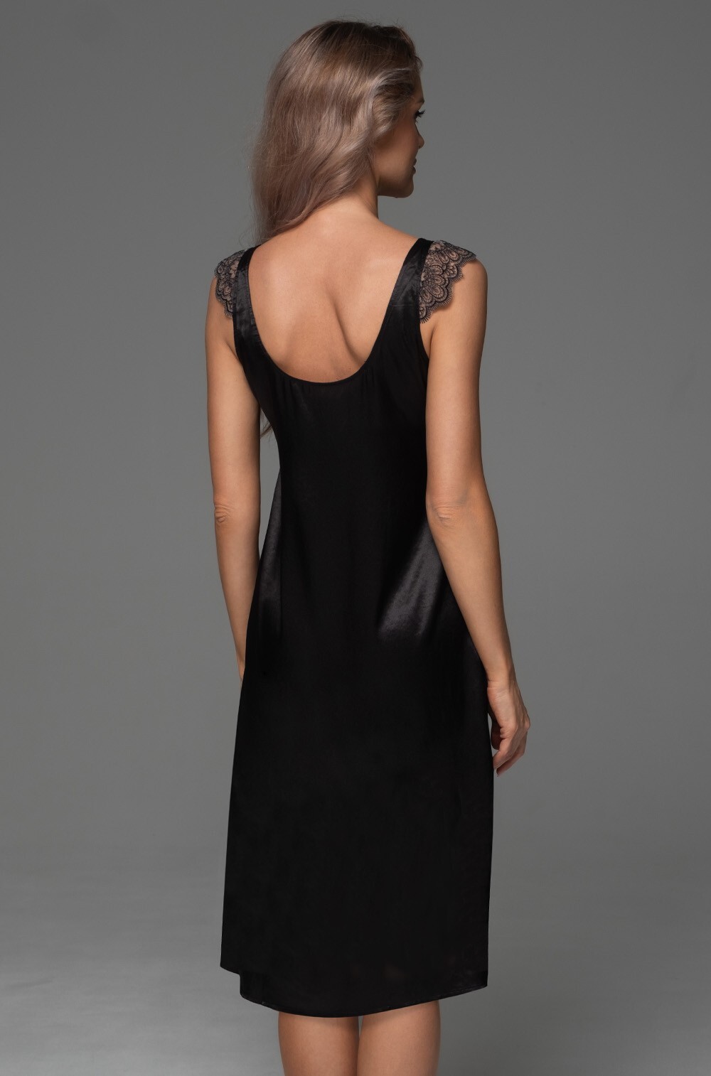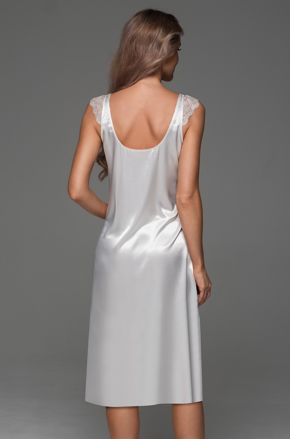 Сорочка средней длины Mia-Amore с бретелями маечного типа выполнена из однотонного смесового шёлка. Вырез горловины спереди сорочки декорирован вставками вышивного кружева, маленькие рукавчики-крылышки также выполнены из кружева.