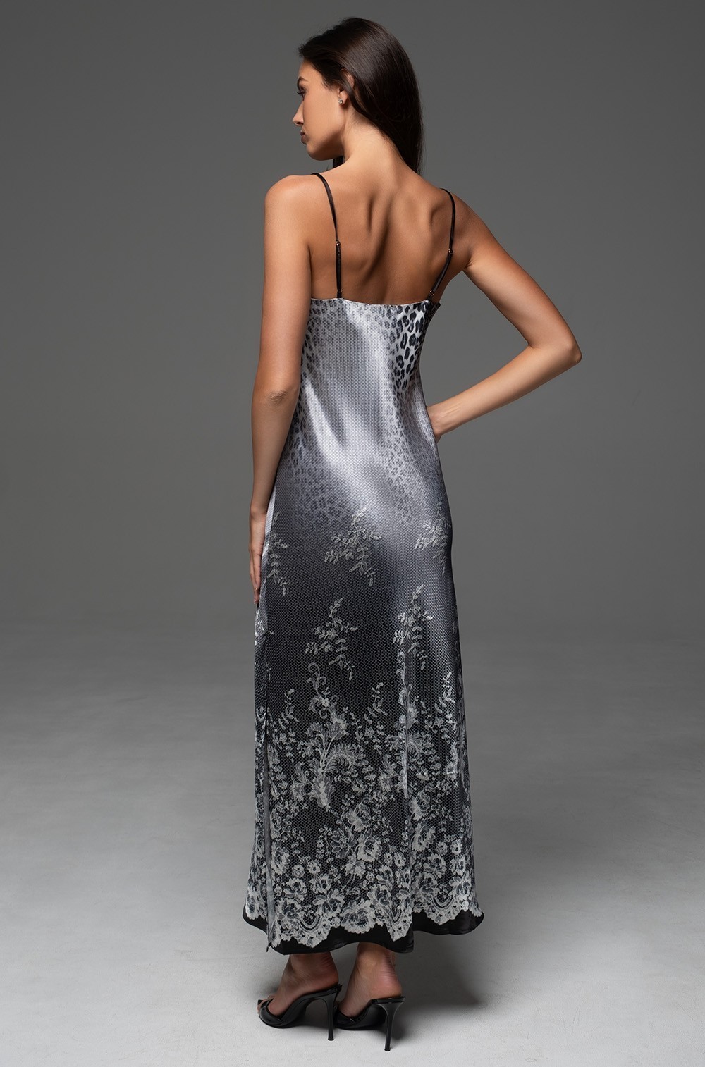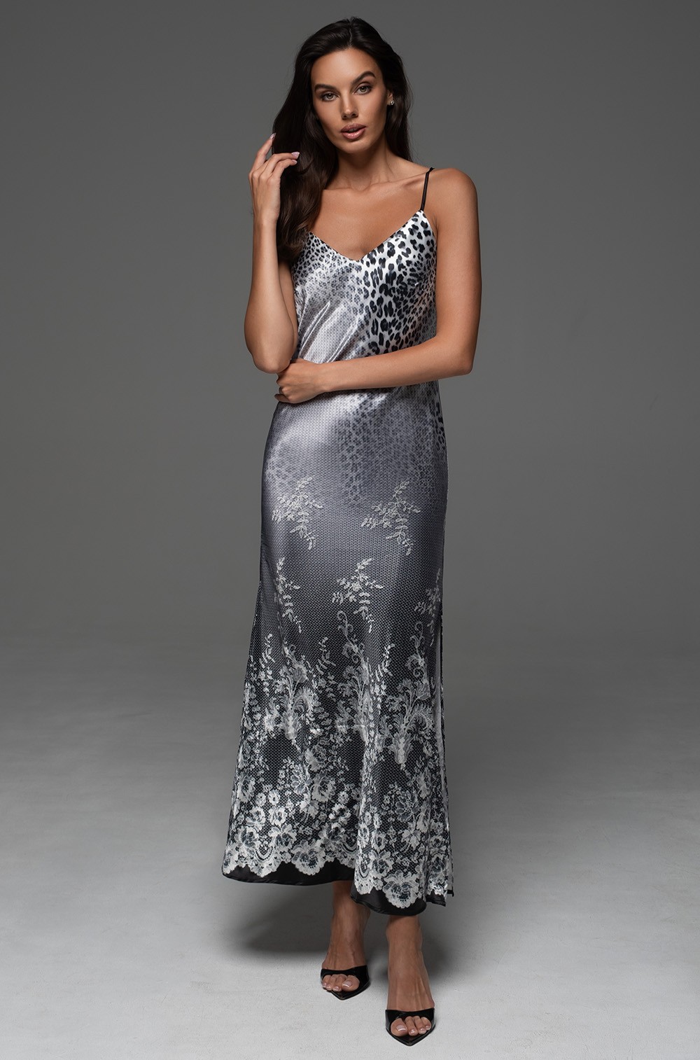 Длинная сорочка Mia-Amore без подреза на тонких регулируемых бретелях выполнена из принтованного смесового шёлка с купонным ажурным рисунком по низу.