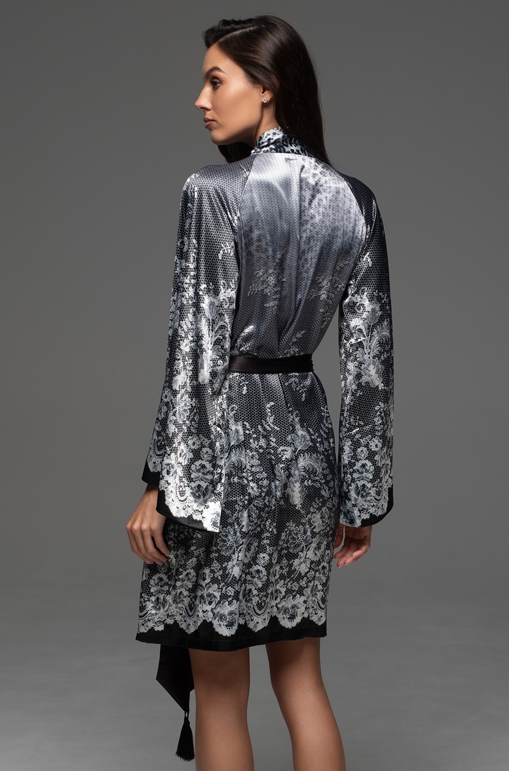 Короткий запашной халат Mia-Amore с длинными рукавами выполнен из принтованного смесового шёлка. Широкие по низу рукава халата и низ изделия декорированы принтом в виде купонного кружева. Халат комплектуется поясом с декоративными кисточками, в боковых швах карманы.