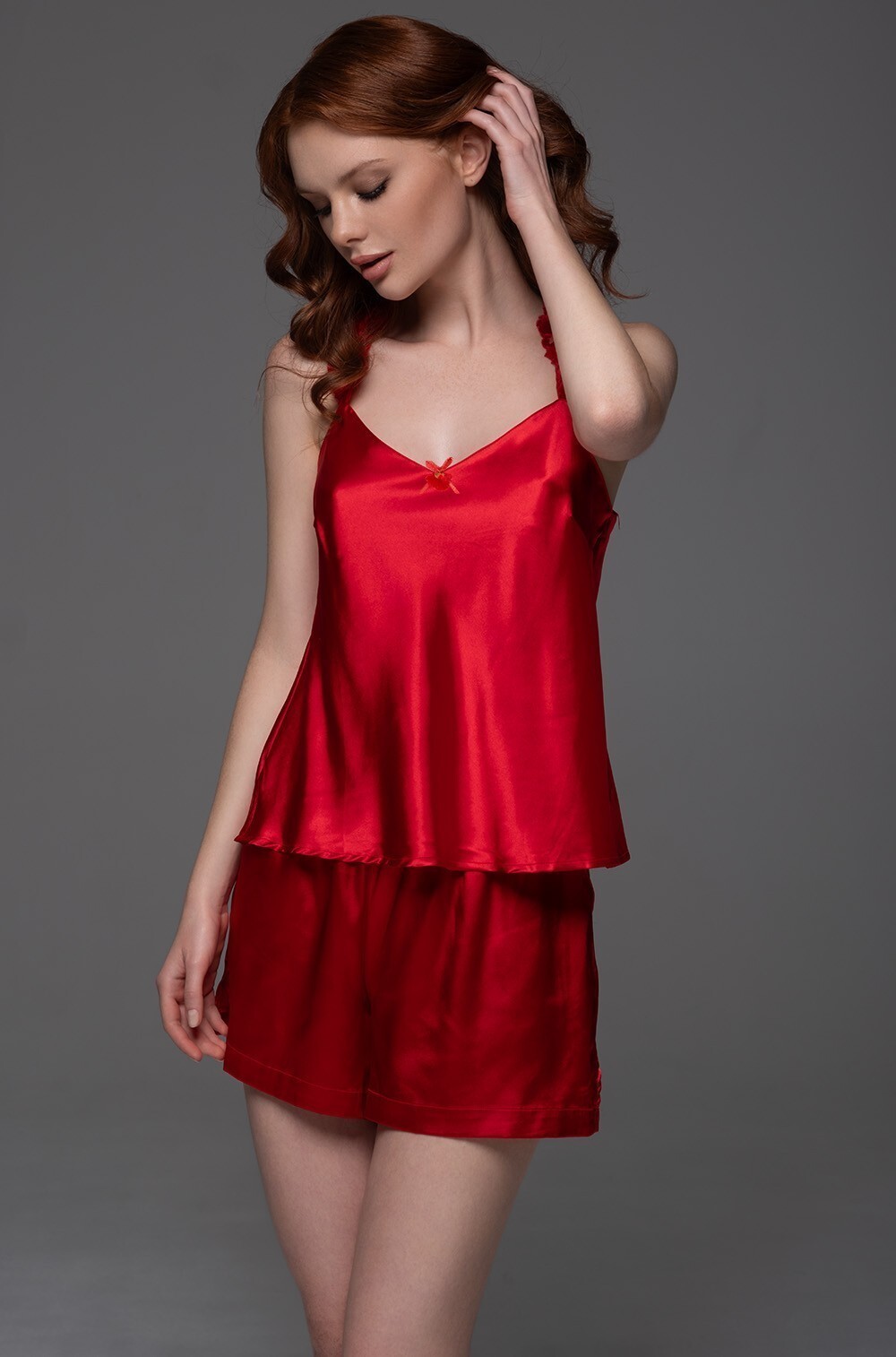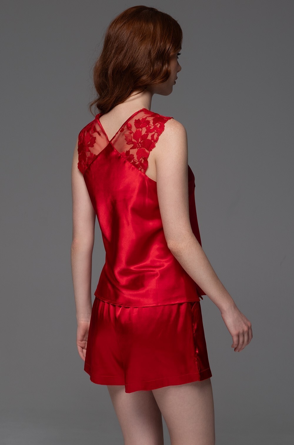 Комплект Mia-Amore состоит из топа на широких кружевных бретелях и шорт. Изделия комплекта выполнены из однотонного смесового шелка.
