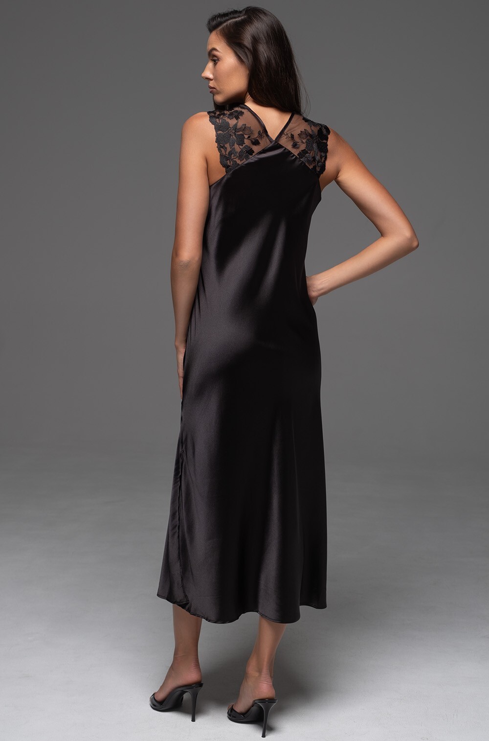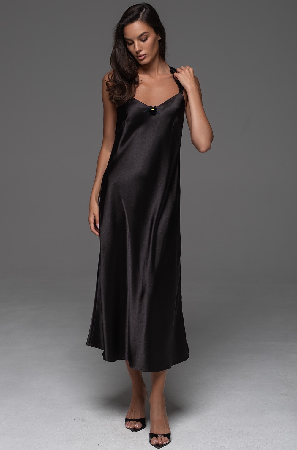 Длинная сорочка Mia-Amore полуприлегающего силуэта на широких кружевных бретелях без подреза под грудью. По левому боку расположен разрез для свободы движения. Сорочка выполнена из однотонного смесового шелка. Декор-атласный бантик с подвеской по центру выреза.