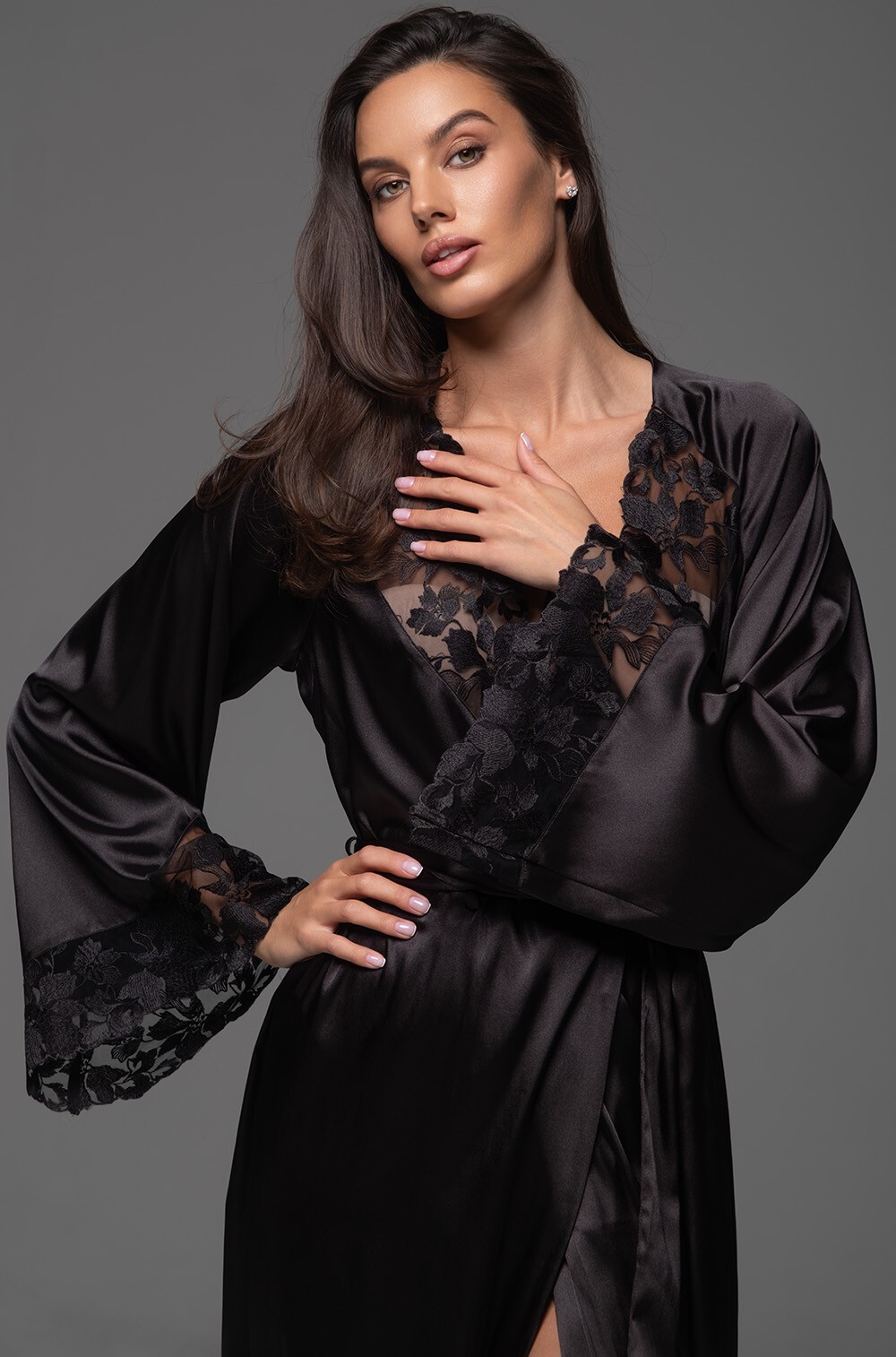 Длинный элегантный пеньюар Mia-Amore с застежкой на пуговицы по линии талии и длинным широким рукавом. Изделие выполнено из однотонного смесового шелка с кружевными вставками по бортам и низу рукавов. По бокам изделия расположены карманы. Широкий пояс идет в комплекте.