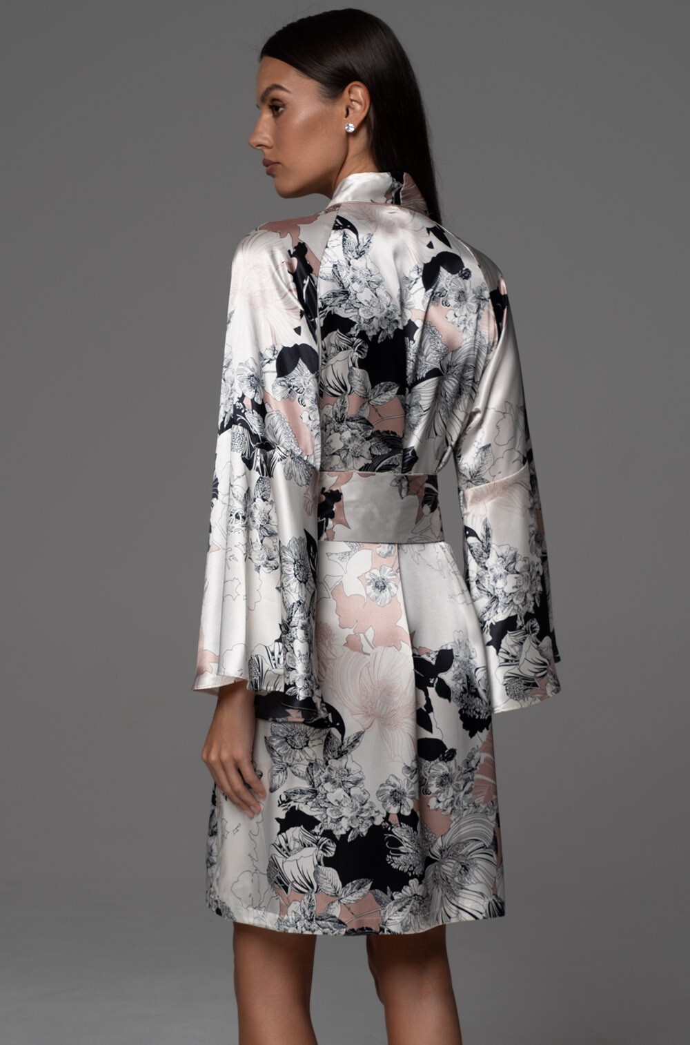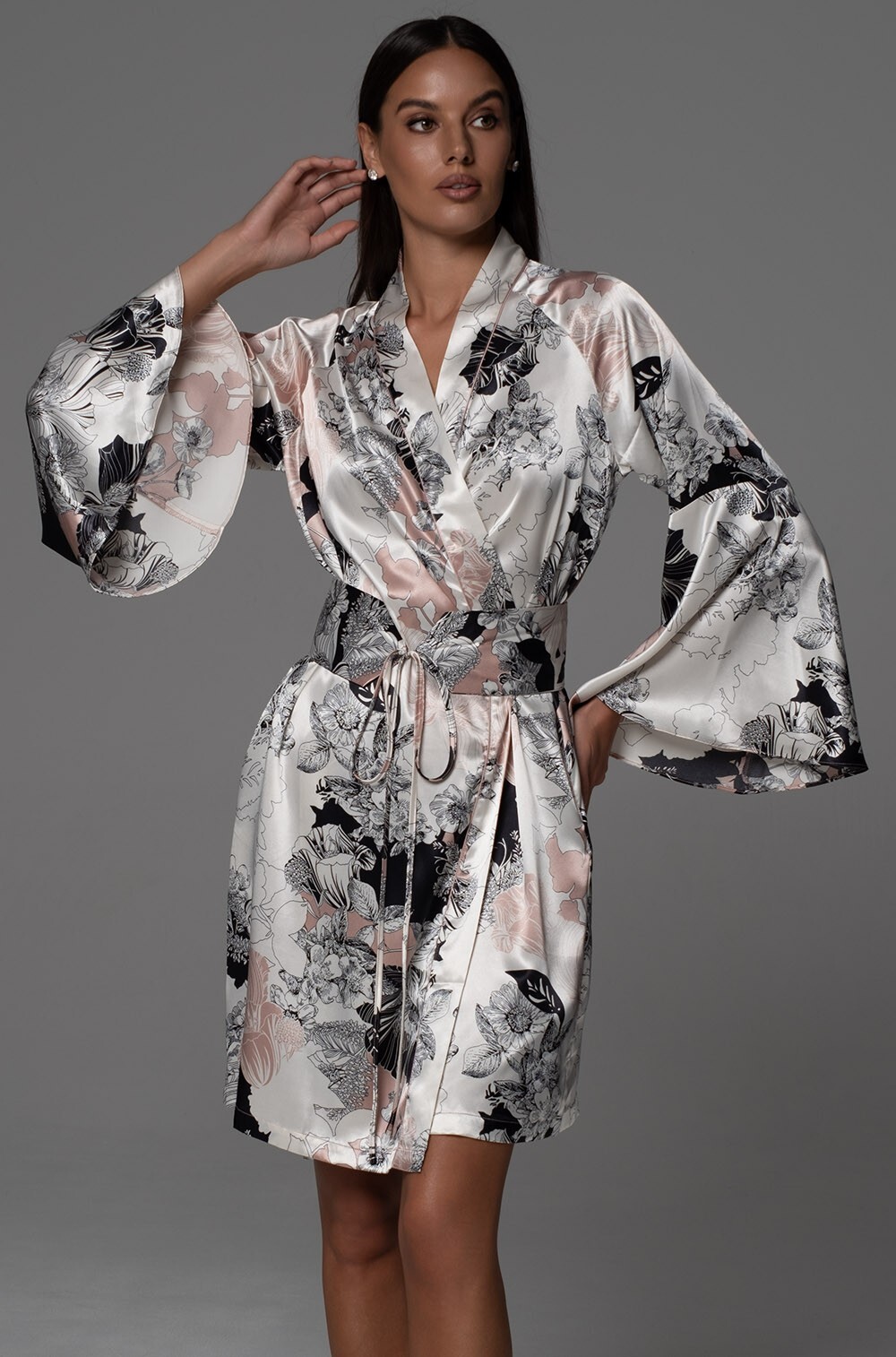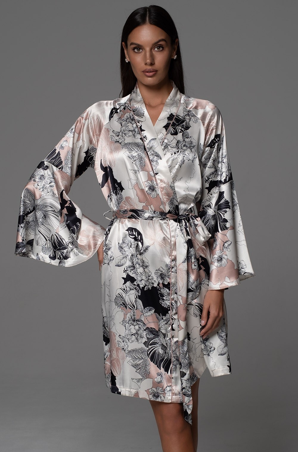 Короткий запашной халат-кимоно Mia-Amore с широким длинным рукавом длиной. Халат выполнен из принтованного смесового шелка с отделкой в виде контрастного канта по бортам изделия. В боковых швах обработаны карманы. В комплекте два пояса: классический и широкий на завязках.