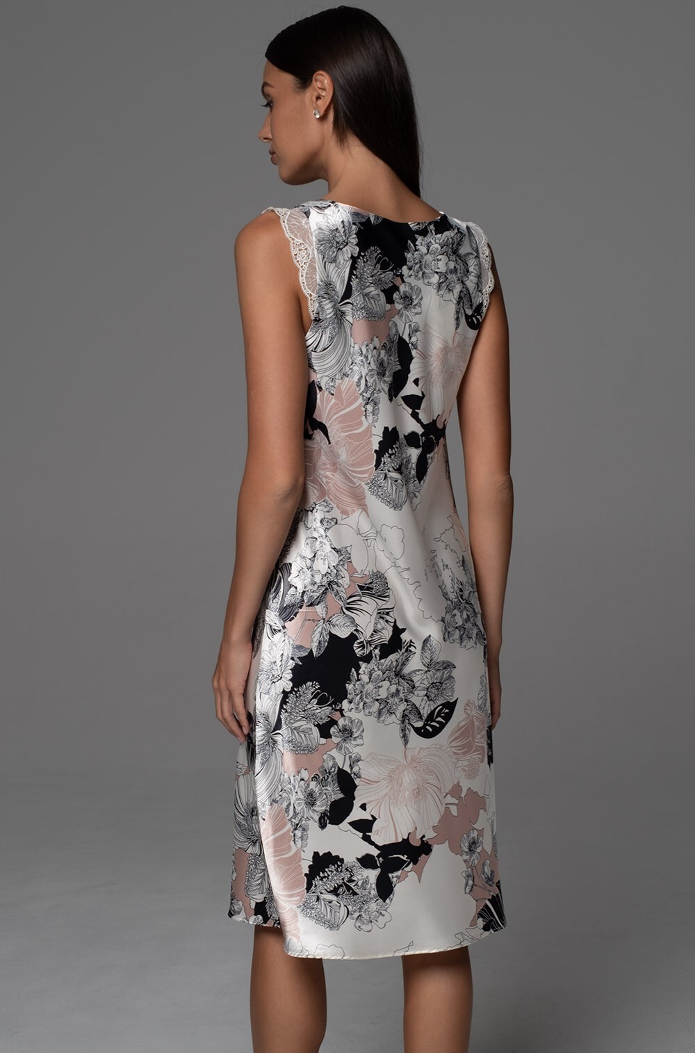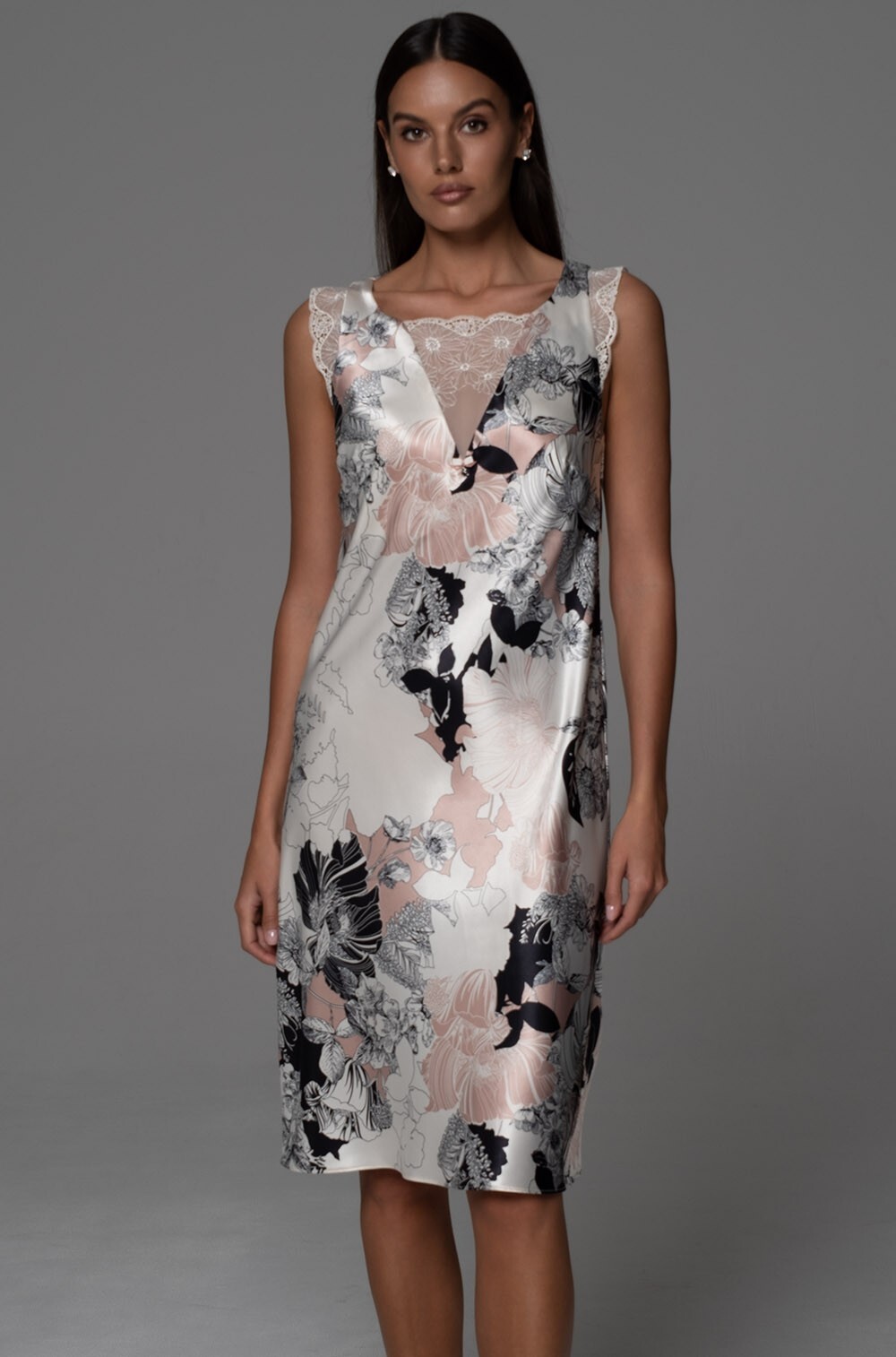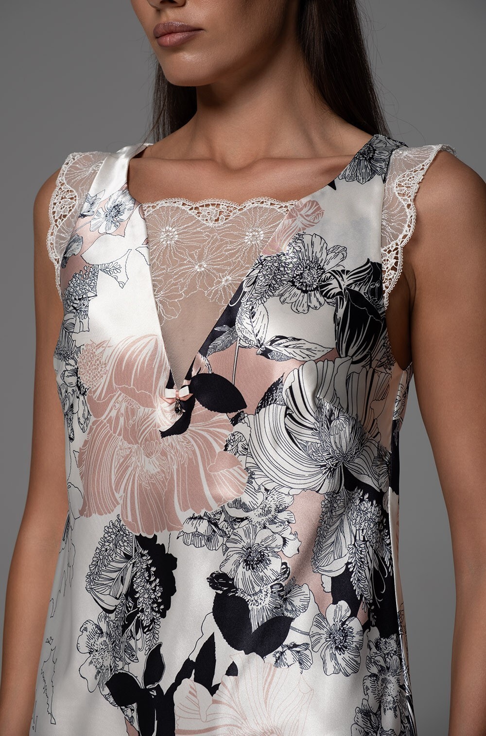 Сорочка Mia-Amore средней длины на широких бретелях, без подреза под грудью. Изделие выполнено из принтованного смесового шелка с кружевными вставками по вырезу и проймам. По бокам расположены разрезы для свободы движения. По вырезу изделия -бантик с подвеской.