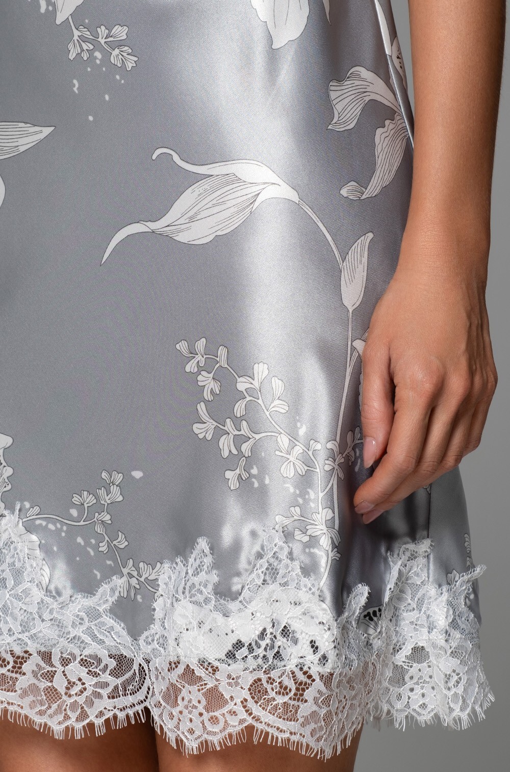 Короткая сорочка Mia-Amore без подреза на тонких регулируемых бретелях выполнена из принтованного смесового шёлка. Низ сорочки украшен изящным широким кружевом. По центру лифа бантик.