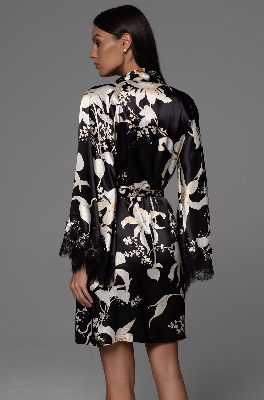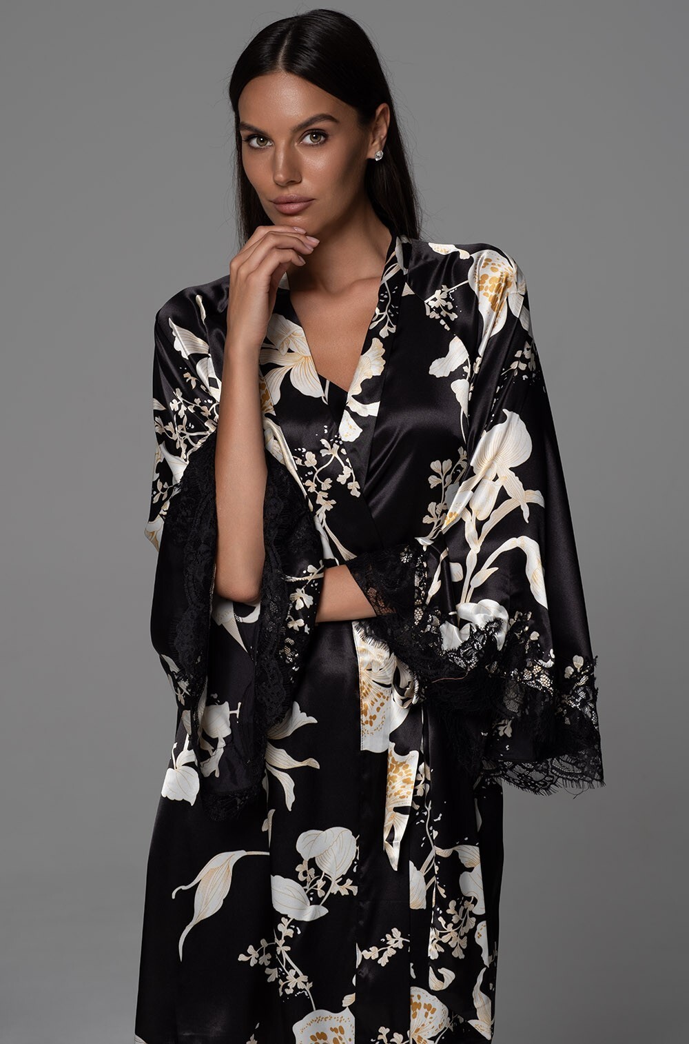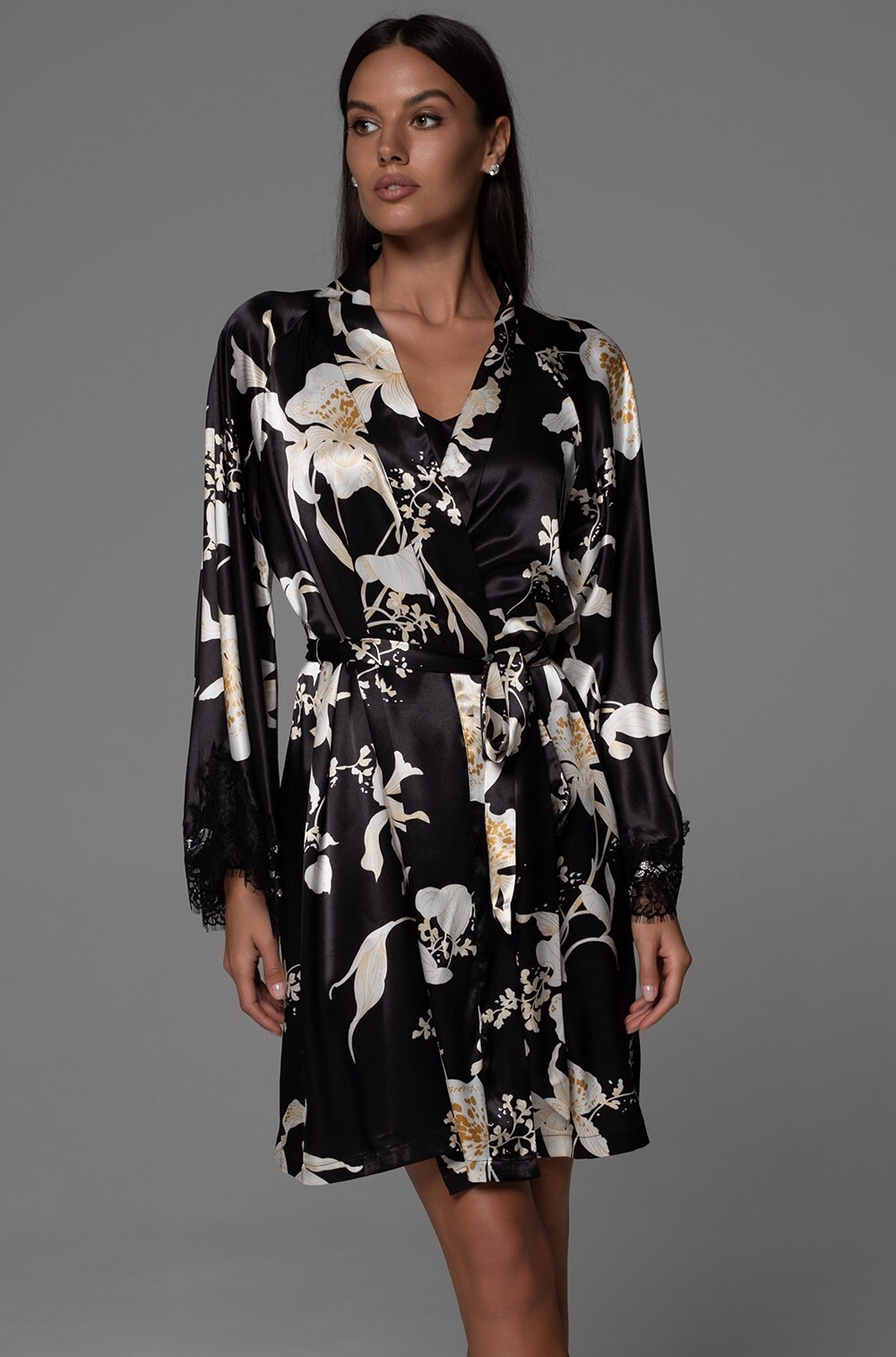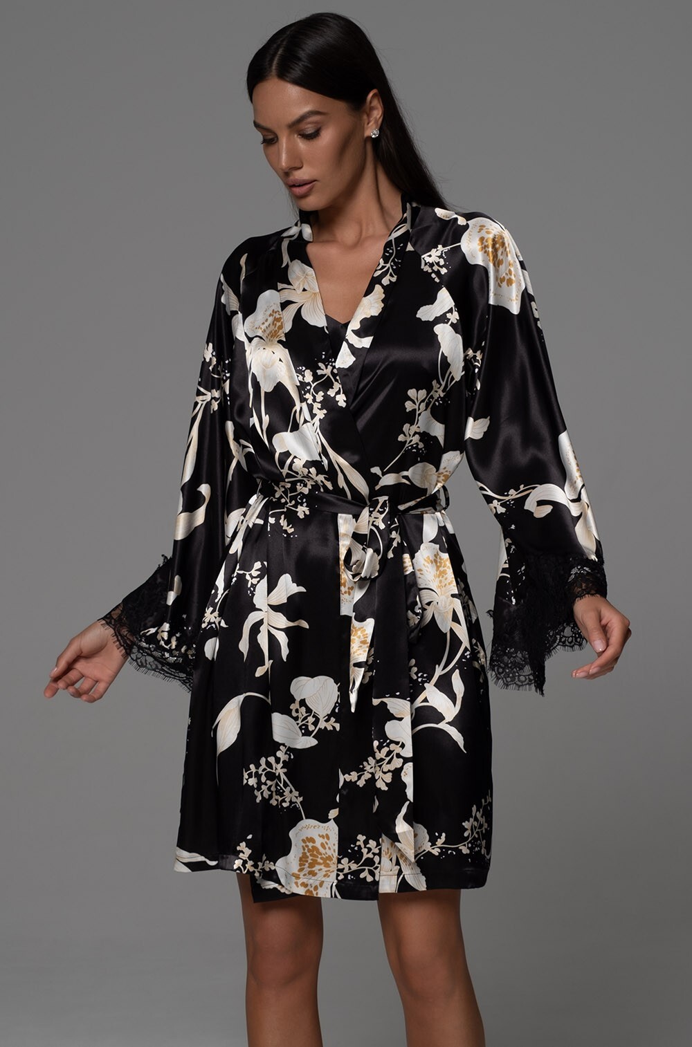 Короткий запашной халат Mia-Amore с длинными рукавами выполнен из принтованного смесового шёлка. Широкие рукава халата по низу декорированы изящным широким кружевом. Халат комплектуется поясом, в боковых швах карманы.