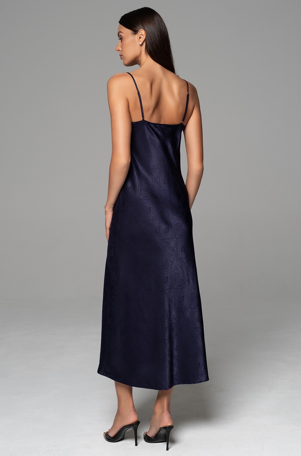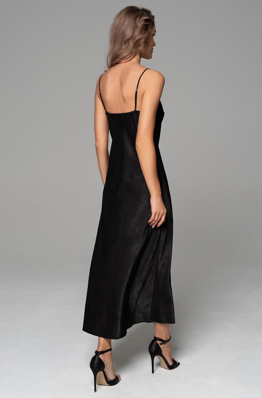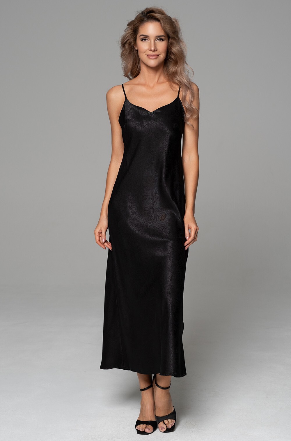 Элегантная длинная сорочка Mia-Amore на тонких бретелях без подреза под грудью с фигурным вырезом. Изделие выполнено из смесового шелкового жаккардового полотна. По низу боковых швов обработаны разрезы для свободы движения. Декор - атласный бантик с подвеской по центру выреза.
