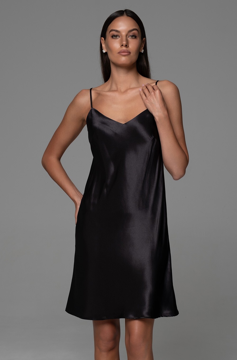 Короткая сорочка Mia-Amore на тонких бретелях без подреза под грудью выполнена из однотонного смесового полотна.
