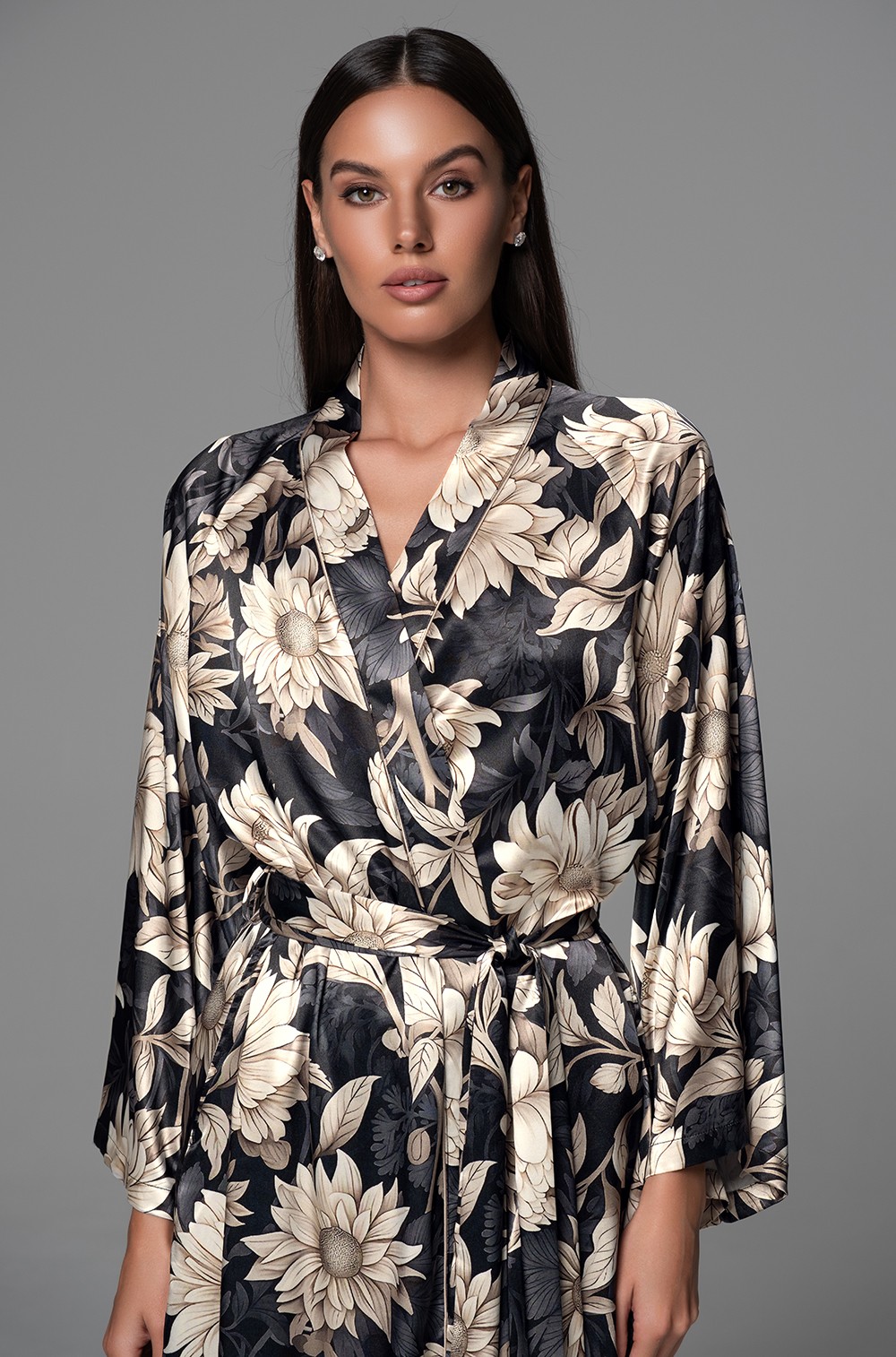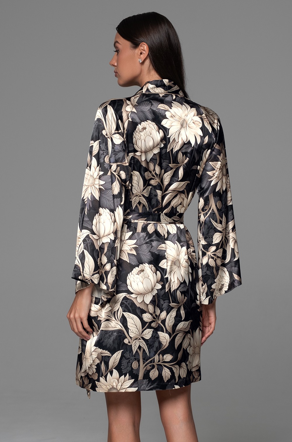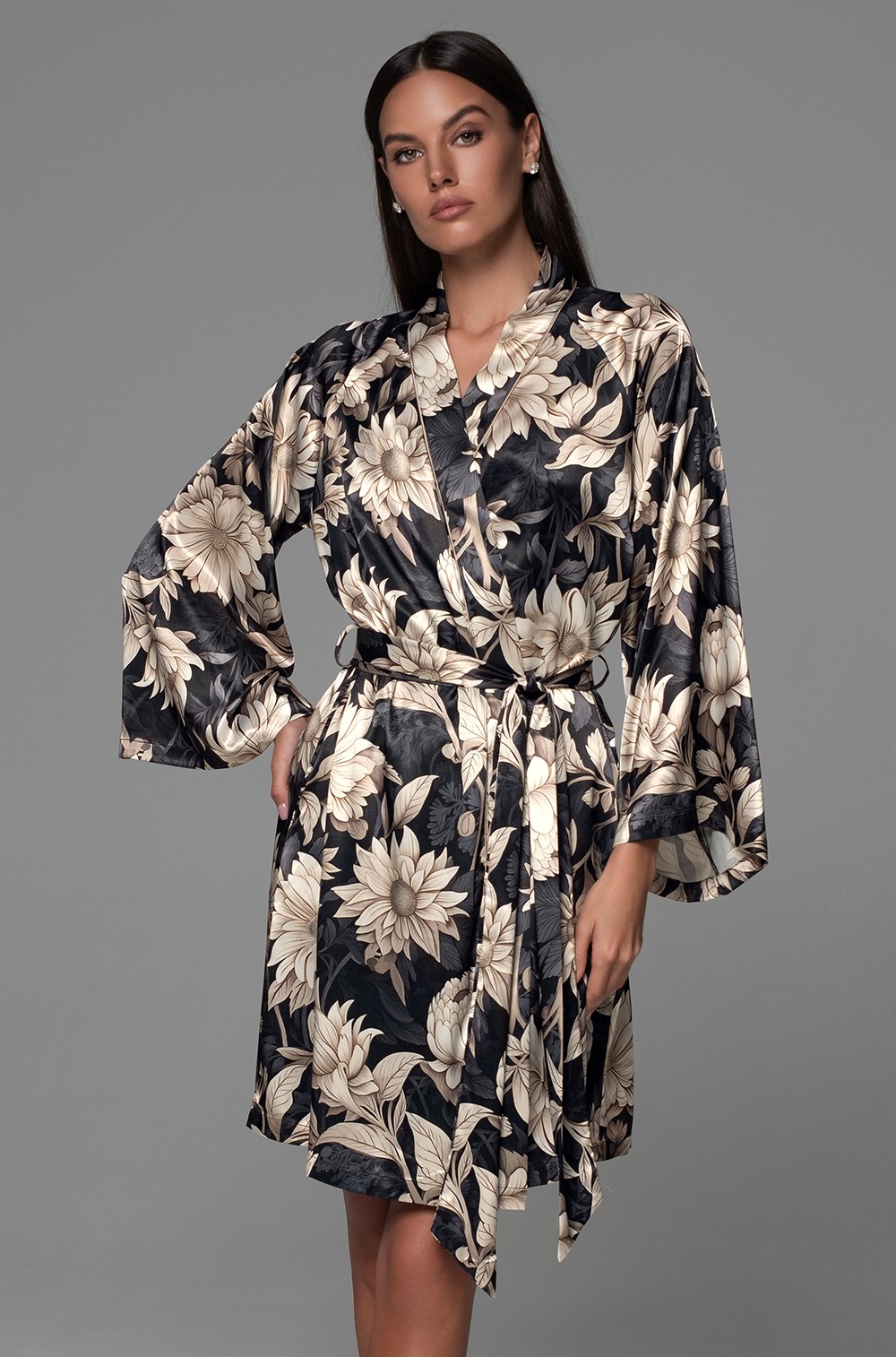 Короткий халат-кимоно Mia-Amore с широкими рукавами длиной ¾. Халат выполнен из принтованного смесового шелка с отделкой в виде контрастного канта по бортам изделия. В боковых швах обработаны карманы.