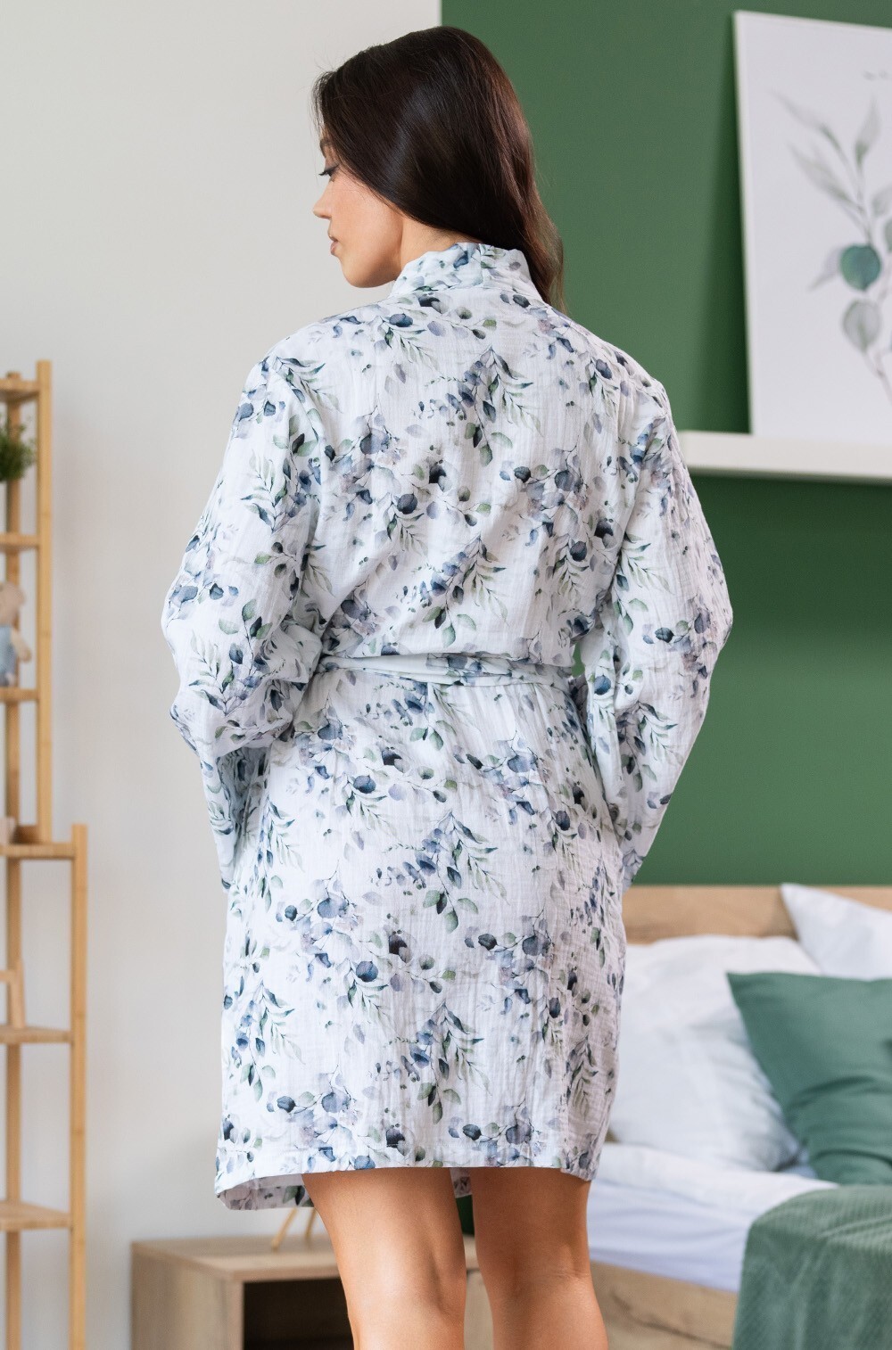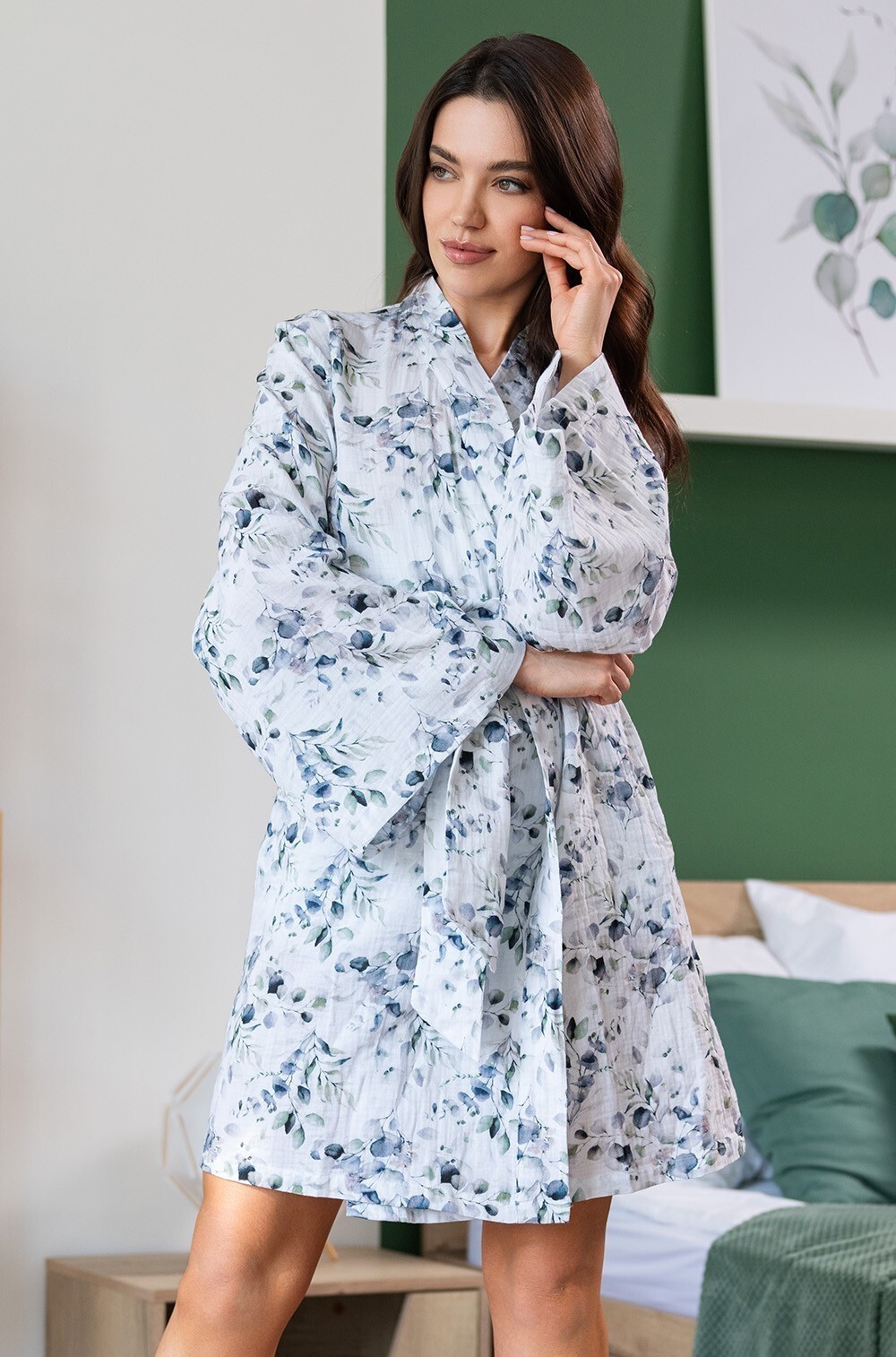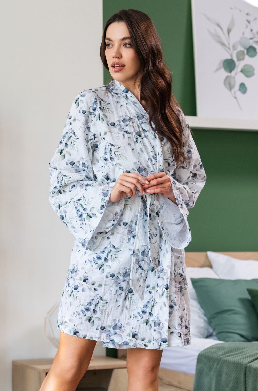Короткий запашной халат-кимоно Mia-Amore с широким рукавом, выполнен из принтованного хлопкового муслина. По бокам халата обработаны карманы. Линию талии можно подчеркнуть за счет пояса, который идет в комплекте.
