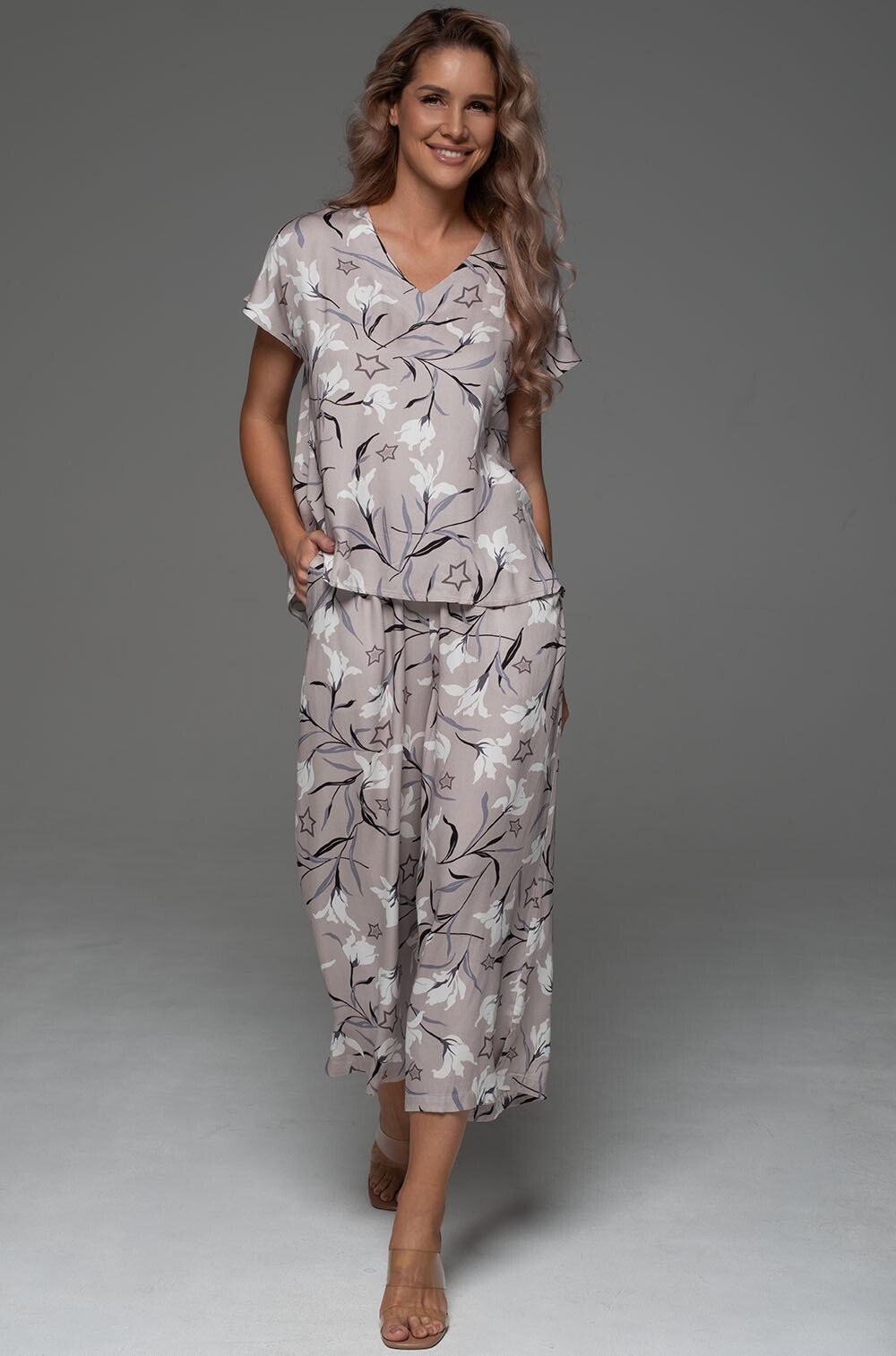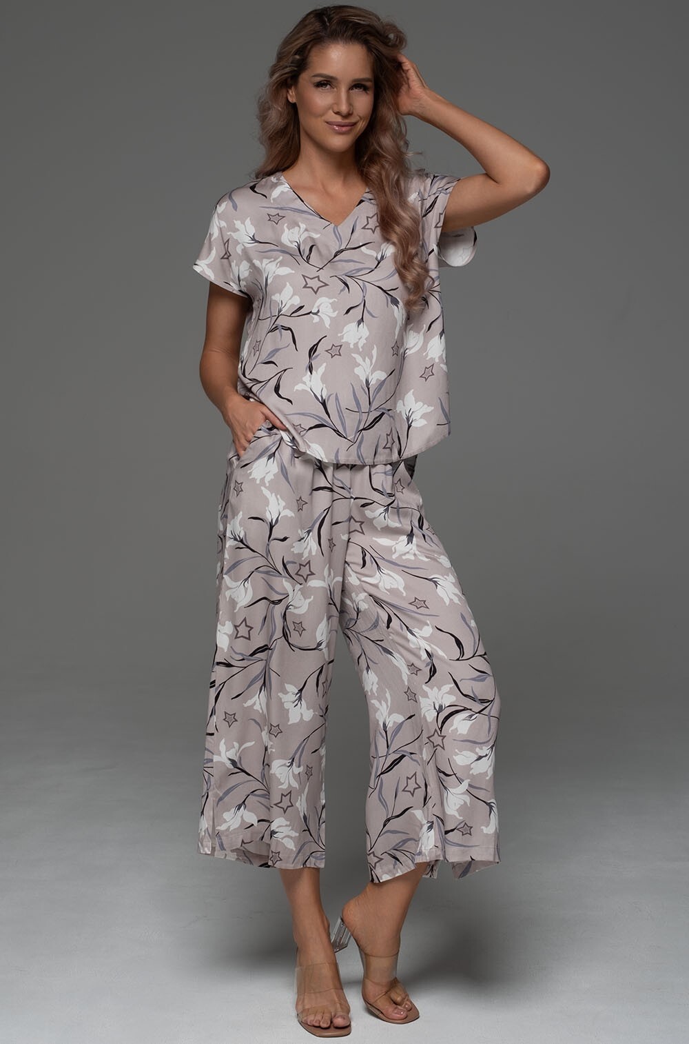 Комплект Mia-Amore состоит из блузки свободного силуэт со спущенными плечами и укороченных брюк свободного силуэта на резинке. Комплект выполнен из смесового вискозного полотна. В брюках есть кармашки.